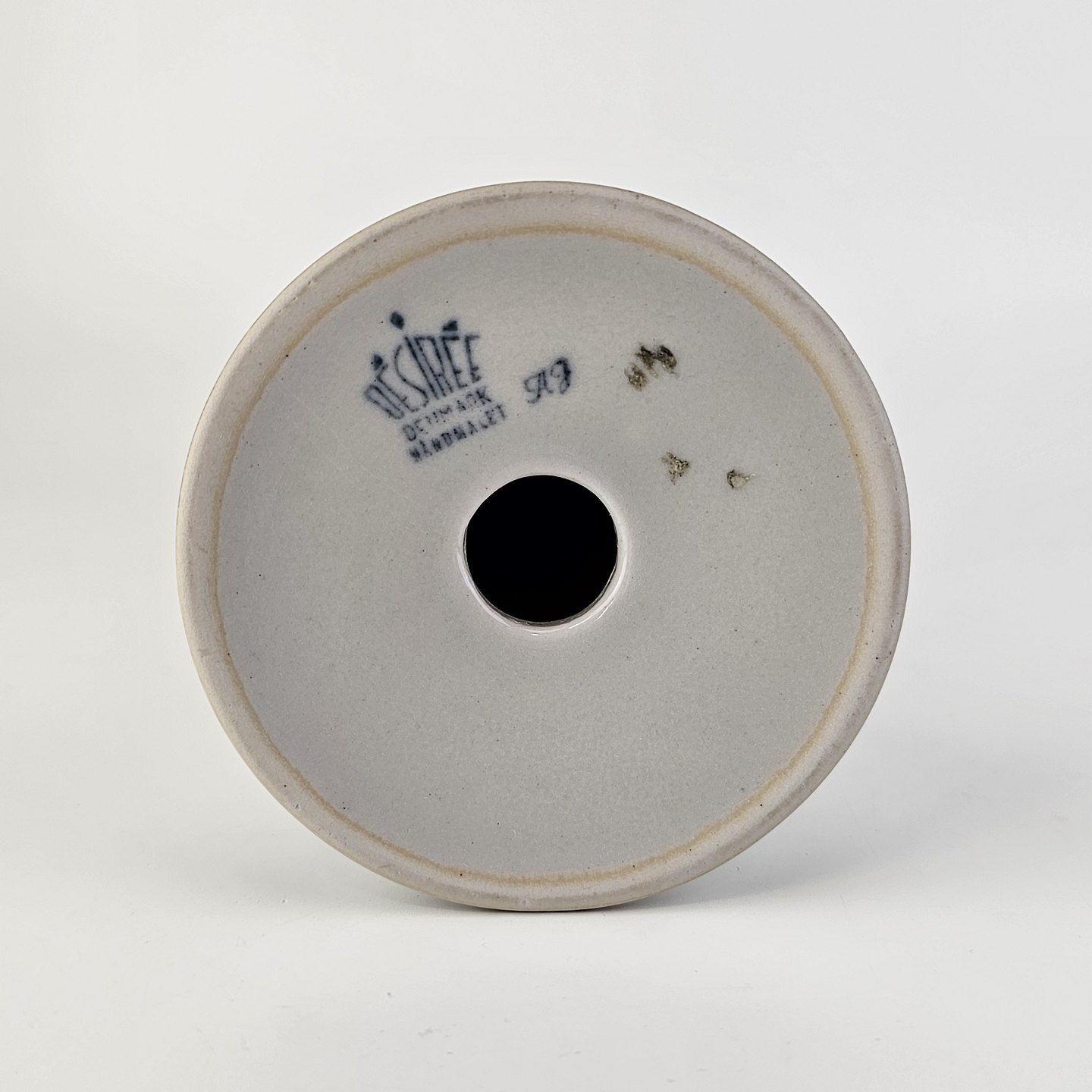 Diskos er af ovnfast stentøj. Stellet er gråt og håndmalet med brune og grønlige detaljer