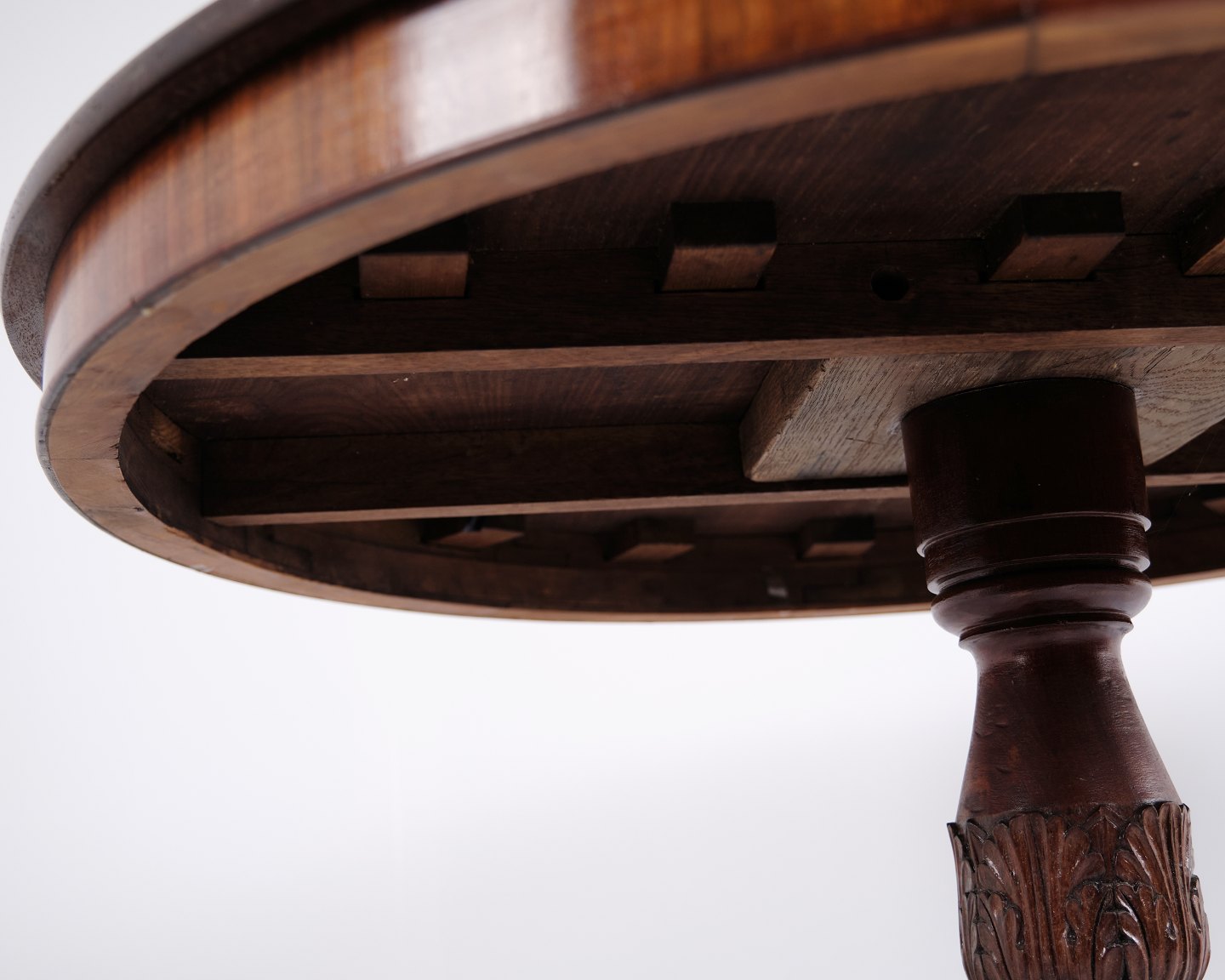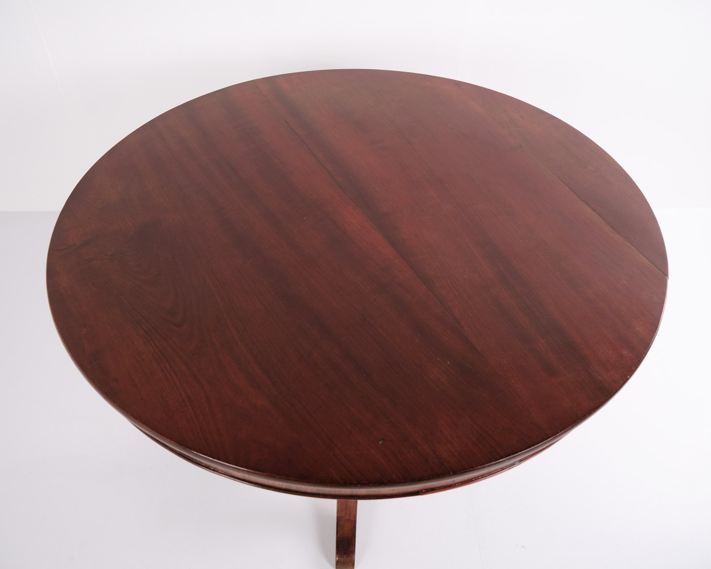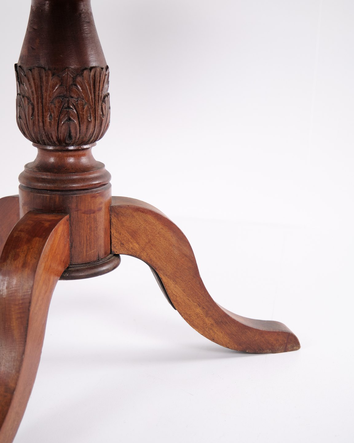 Entré- eller lobbybord fra 1800-tallet, udført i mahogni som klassisk søjlebord med rund bordplade. Et dekorativt og tidskarakteristisk møbel, velegnet til entré, hall eller stue. Massivt træ og elegant formgivning.