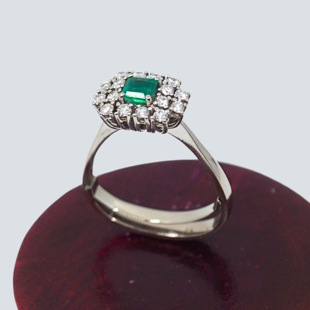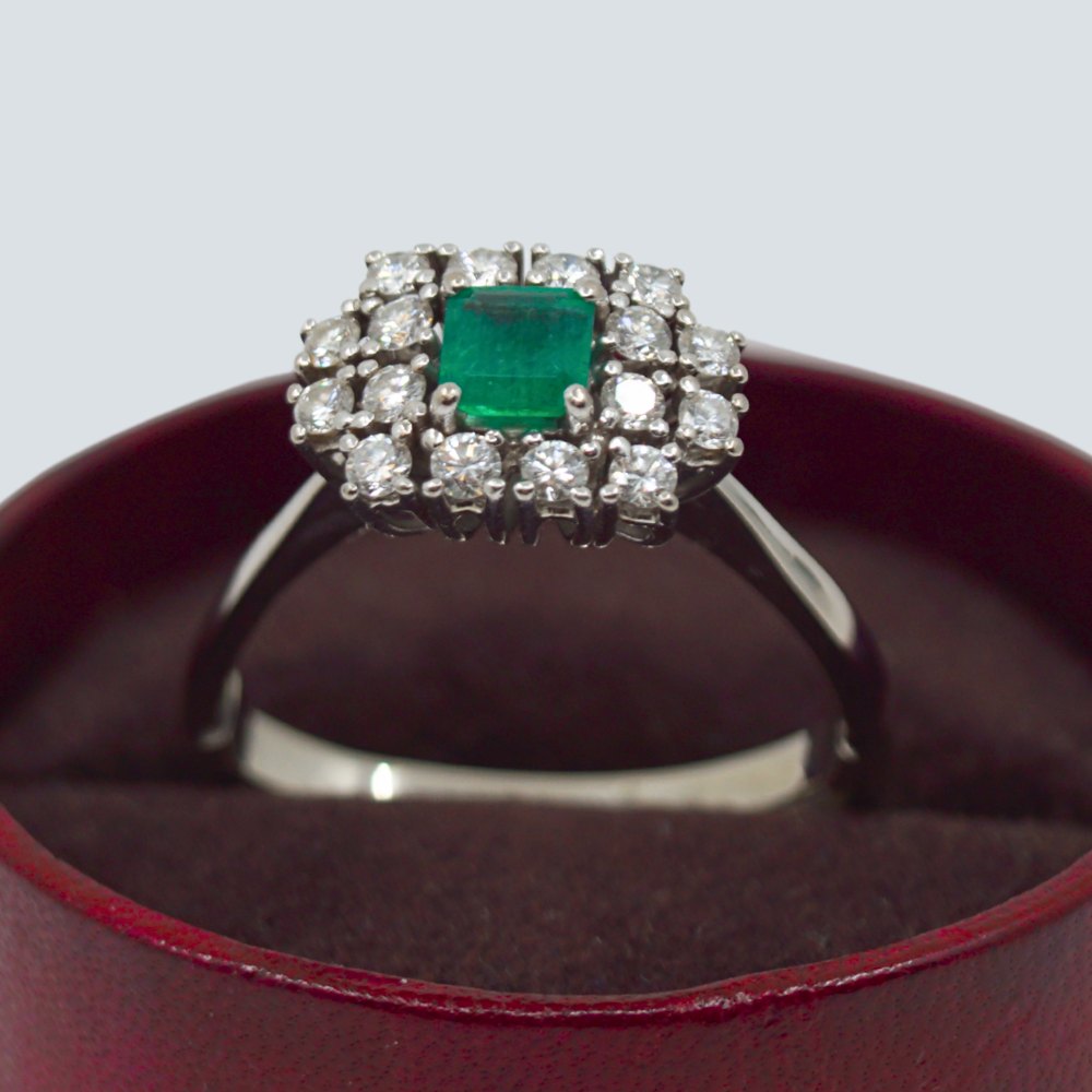 Carl Antonsen; Ring in 14k white gold, set with diamonds and emerald. Around size 61, but fleksible in size.