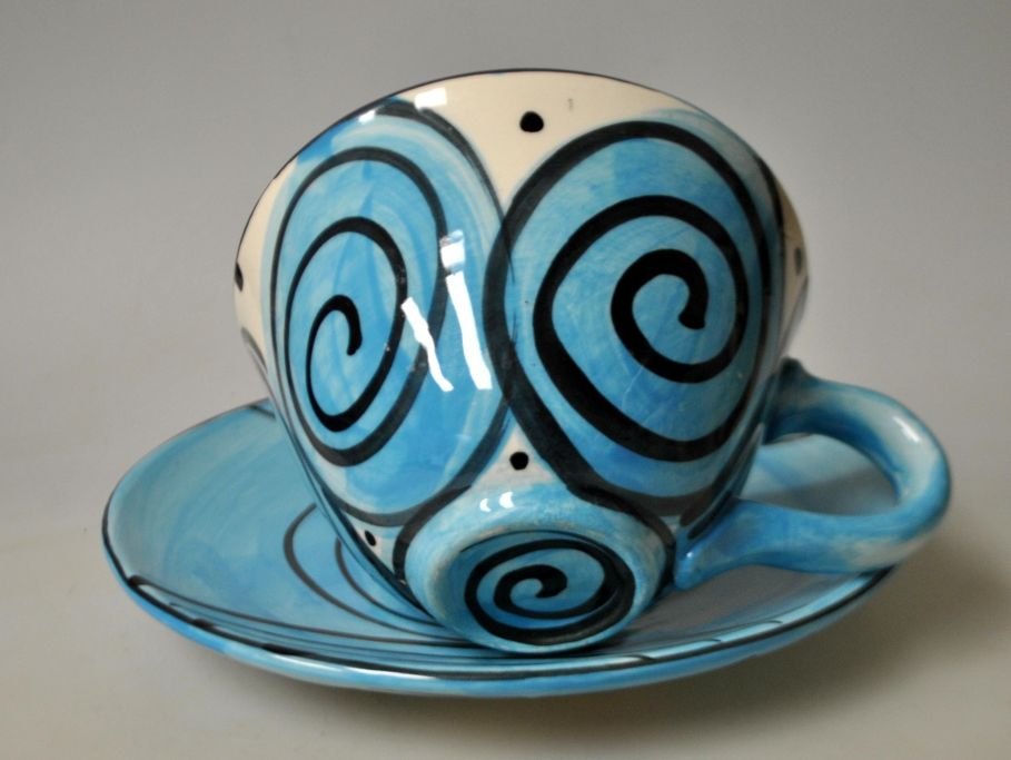 Atherley, Karen (1961 - ) England: Thekop med underkop. Med glasur og dekoration af kvindeansigt. Signeret 1972. H.: 8 cm. Dia underkop: 19 cm.