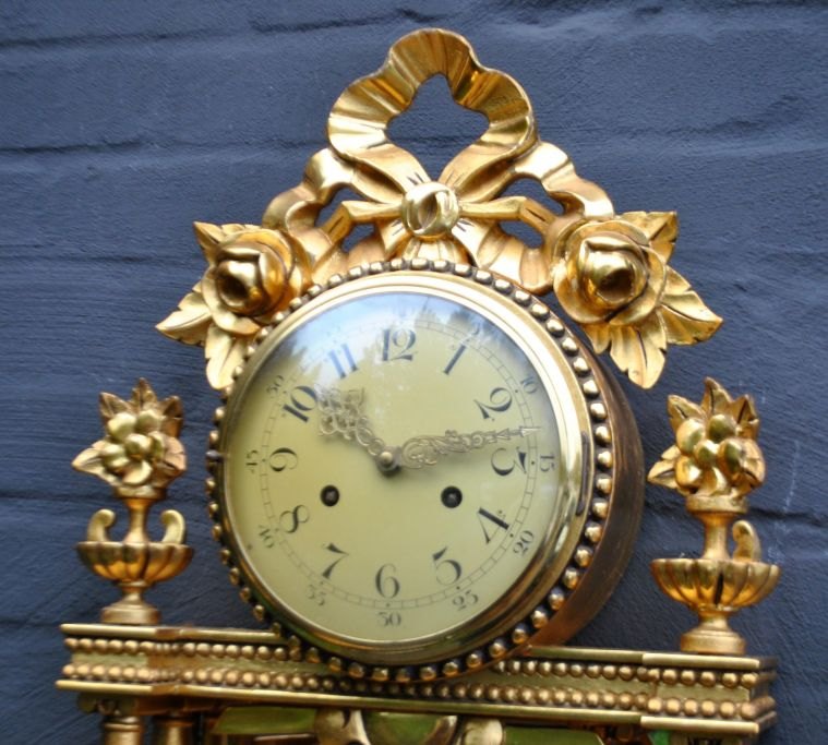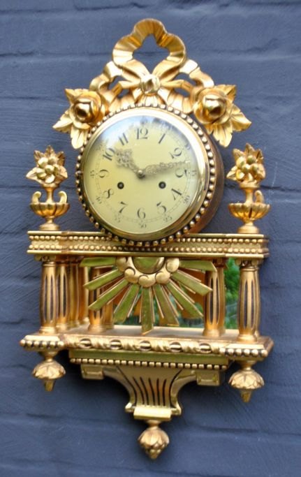 Svensk forgyldt vægur, 20. årh. H.: 60 cm. B.: 34 cm. Skive med arabertal.