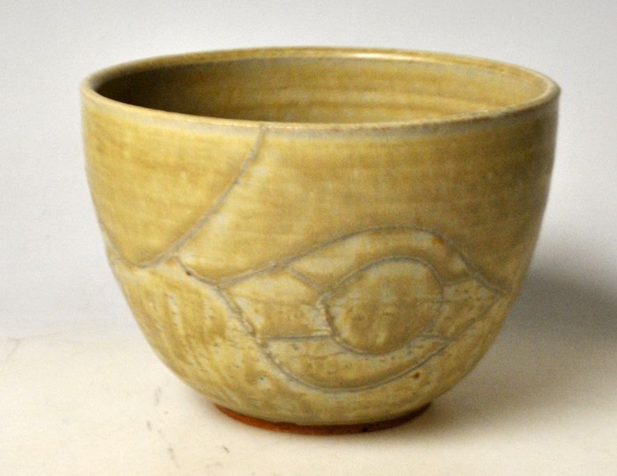 Hjorths ceramics, 20th century. Bornholm, Denmark. Unique bowl. Stoneware. With decoration on the sides. Gray-green glaze. Stamped: BM and mark from Hjorth. H.: 8 cm.