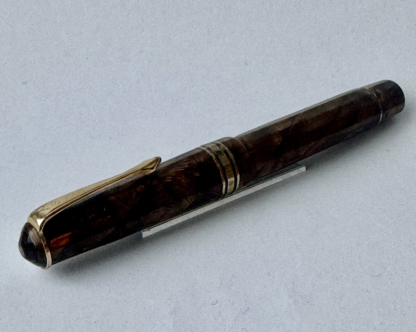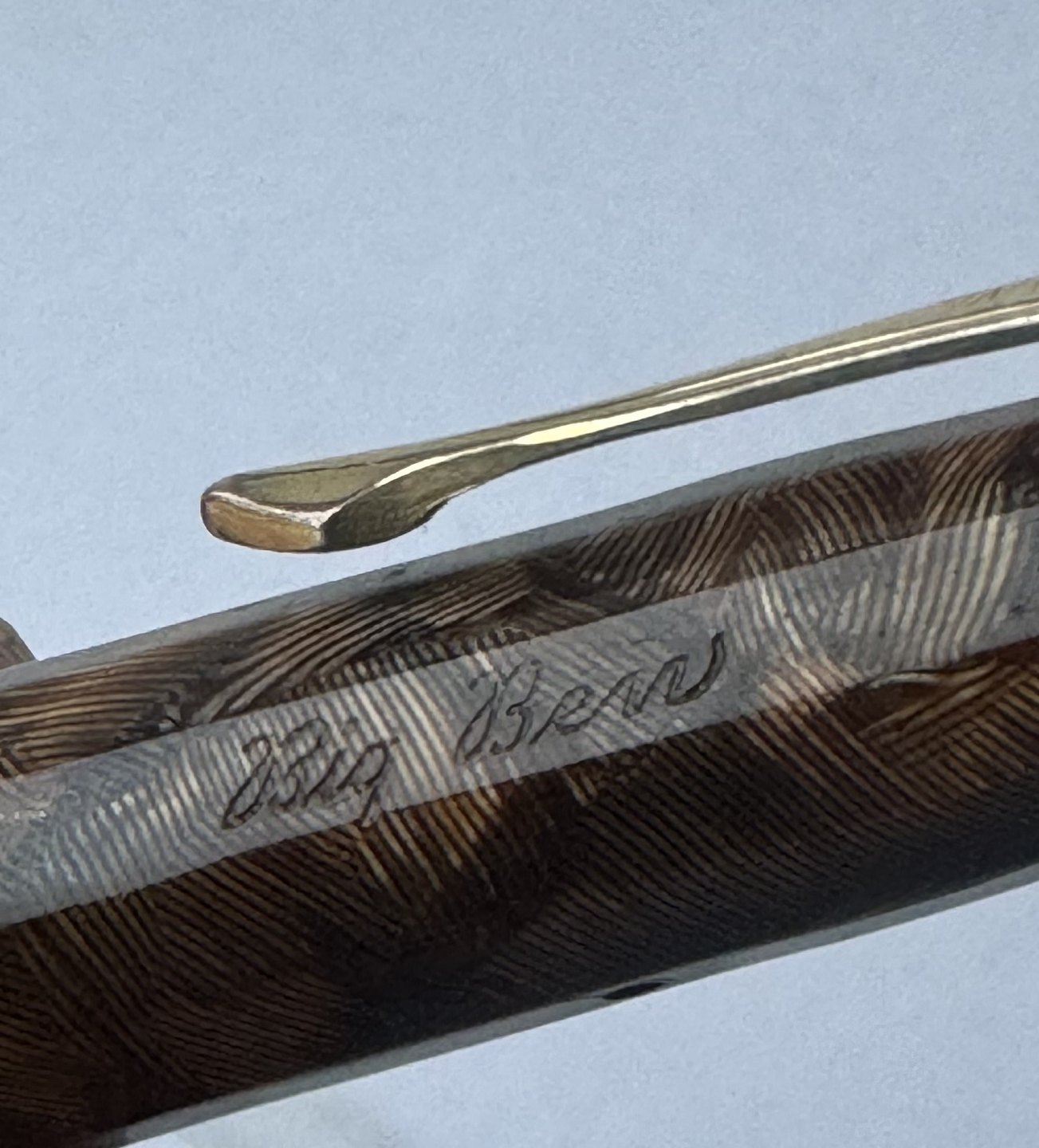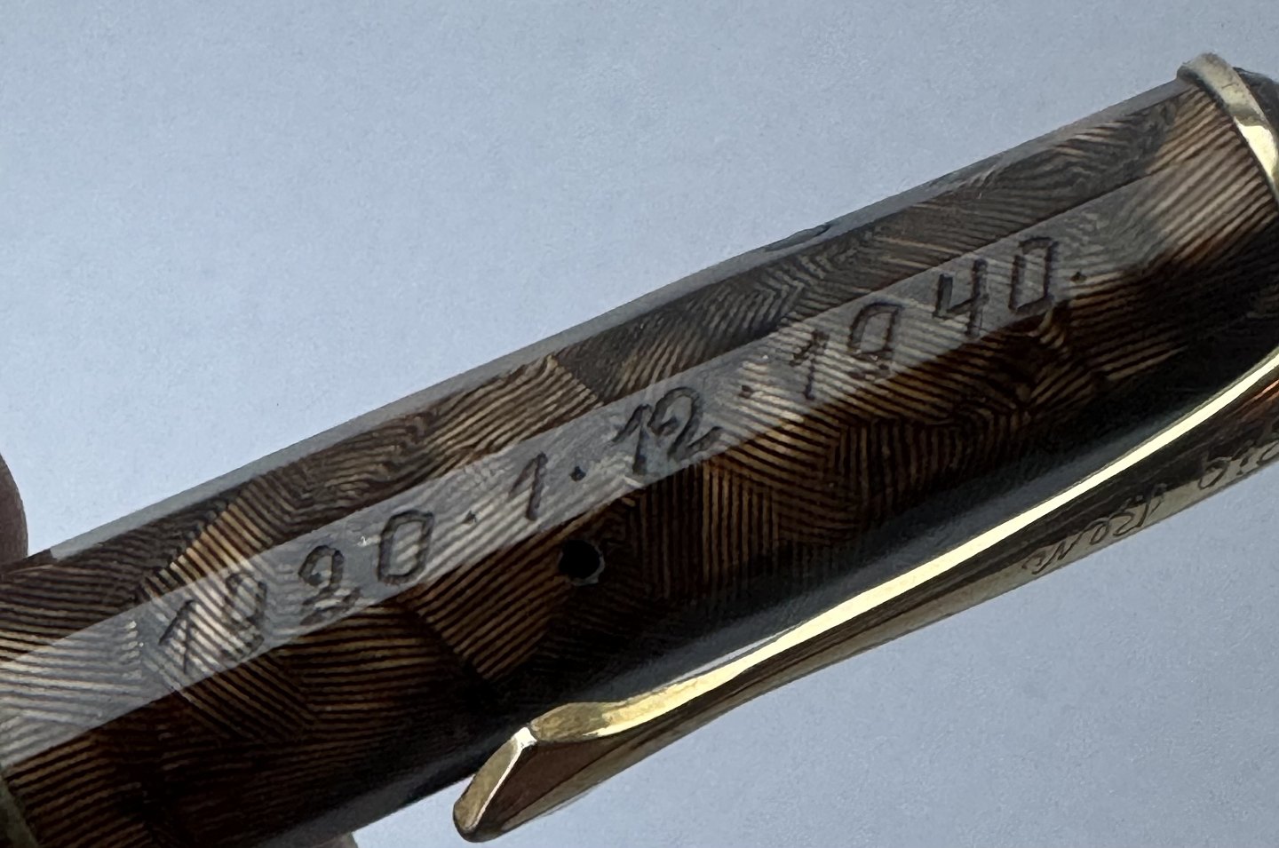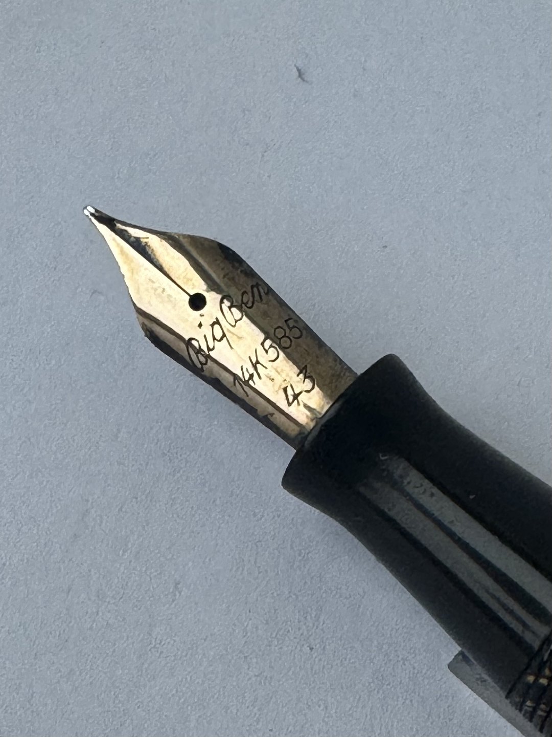 Small 12-sided Big Ben fountain pen with piston filler. The ink filling system needs to be repaired so that the pen can absorb ink again and write again. Otherwise in good condition without damage. Big Ben engraved on one side of the cap. On the other side it says 1920 1.12 1940. Length: 11.7 cm