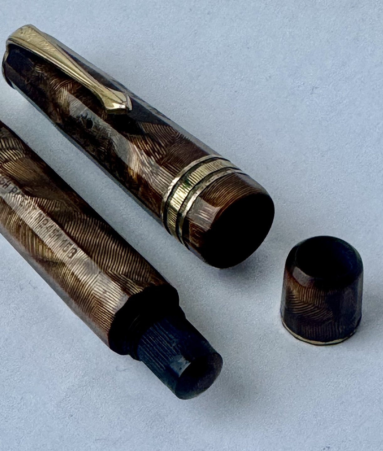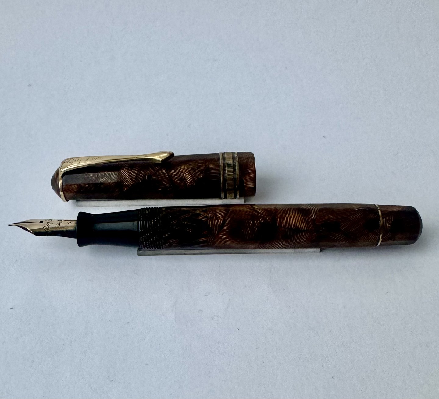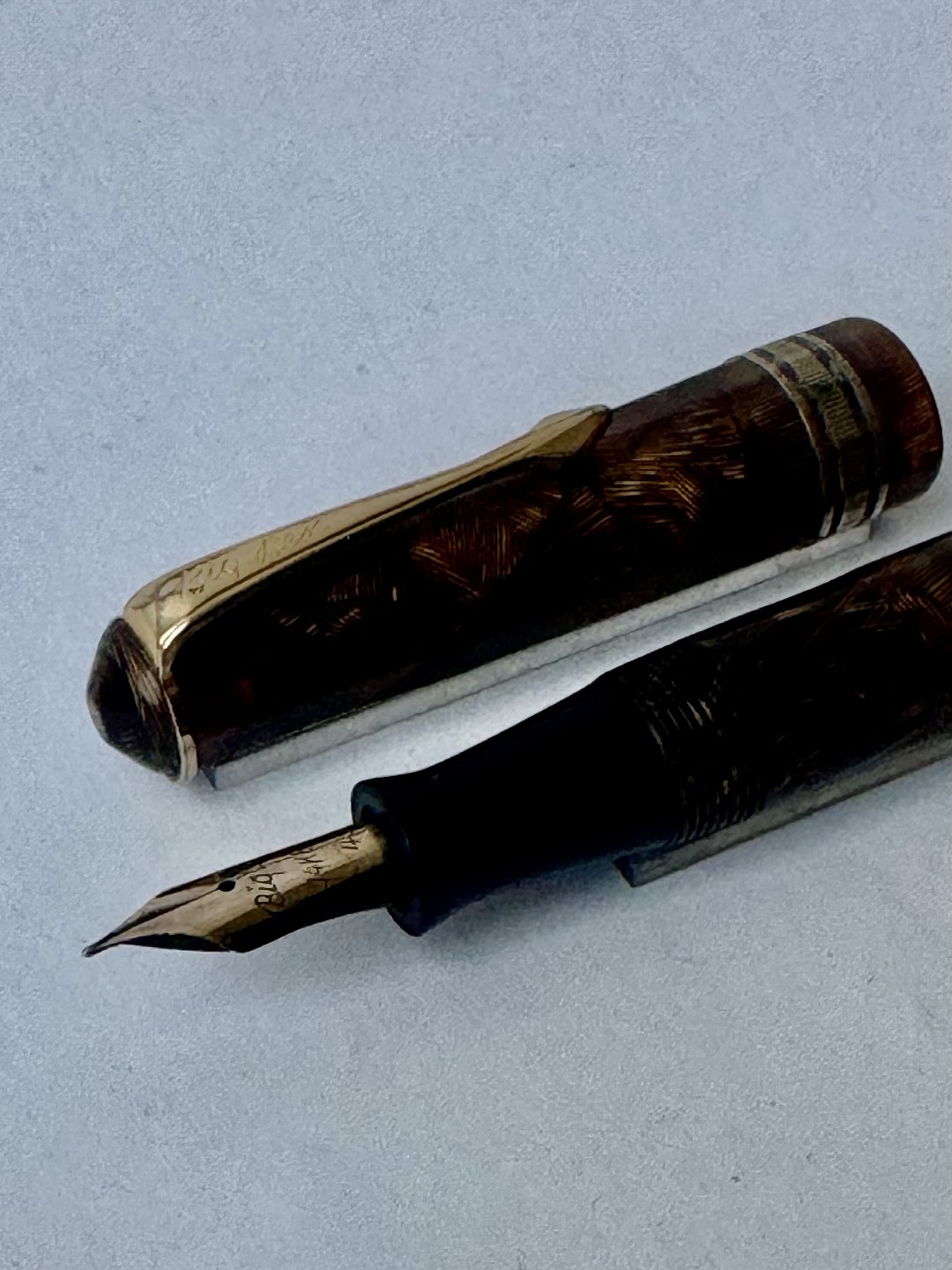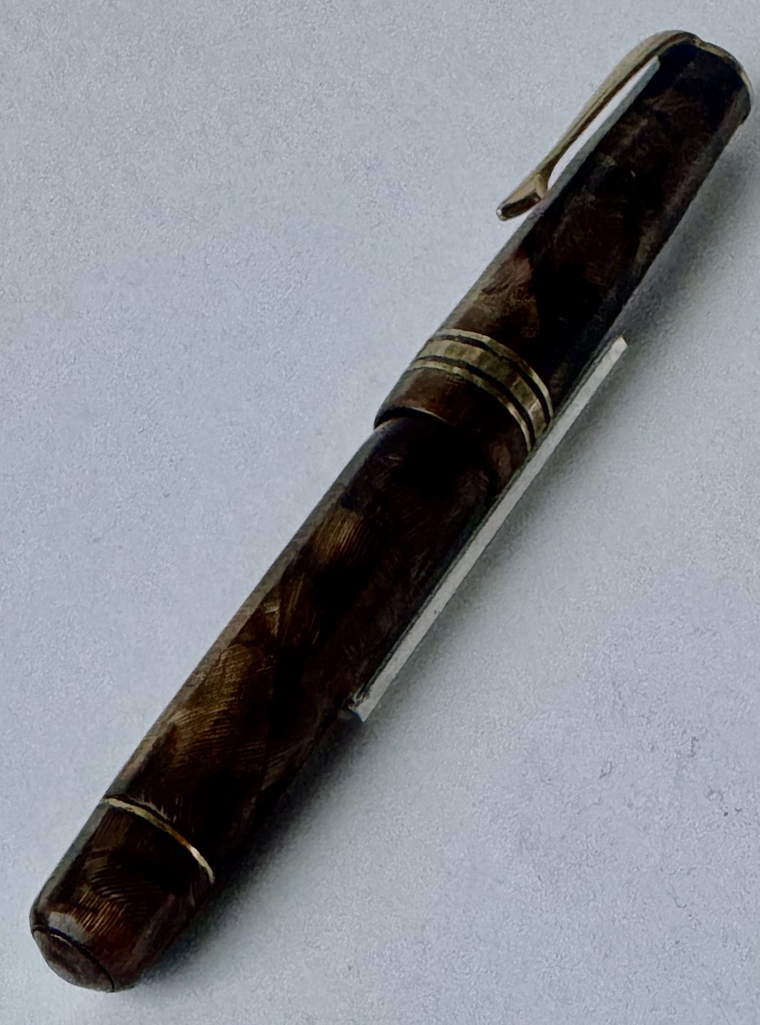 Small 12-sided Big Ben fountain pen with piston filler. The ink filling system needs to be repaired so that the pen can absorb ink again and write again. Otherwise in good condition without damage. Big Ben engraved on one side of the cap. On the other side it says 1920 1.12 1940. Length: 11.7 cm