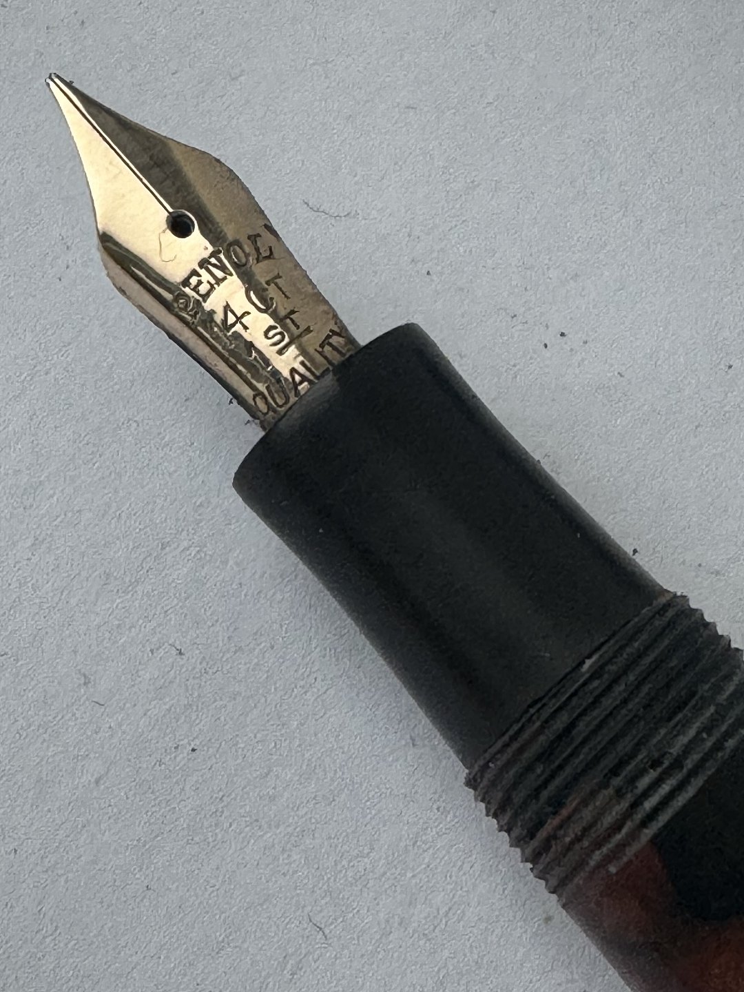 Sort og rød-brun marmoreret Penol. nr. 1 fyldepen. Fremstår i god stand uden skader eller reparationer. Fungerer ikke. Der skal indsættes en ny gummisæk før en fyldepennen igen kan optage blæk og skrive igen. Forenden end original Penol 14 karat guldspids. Længde:11,2 cm
