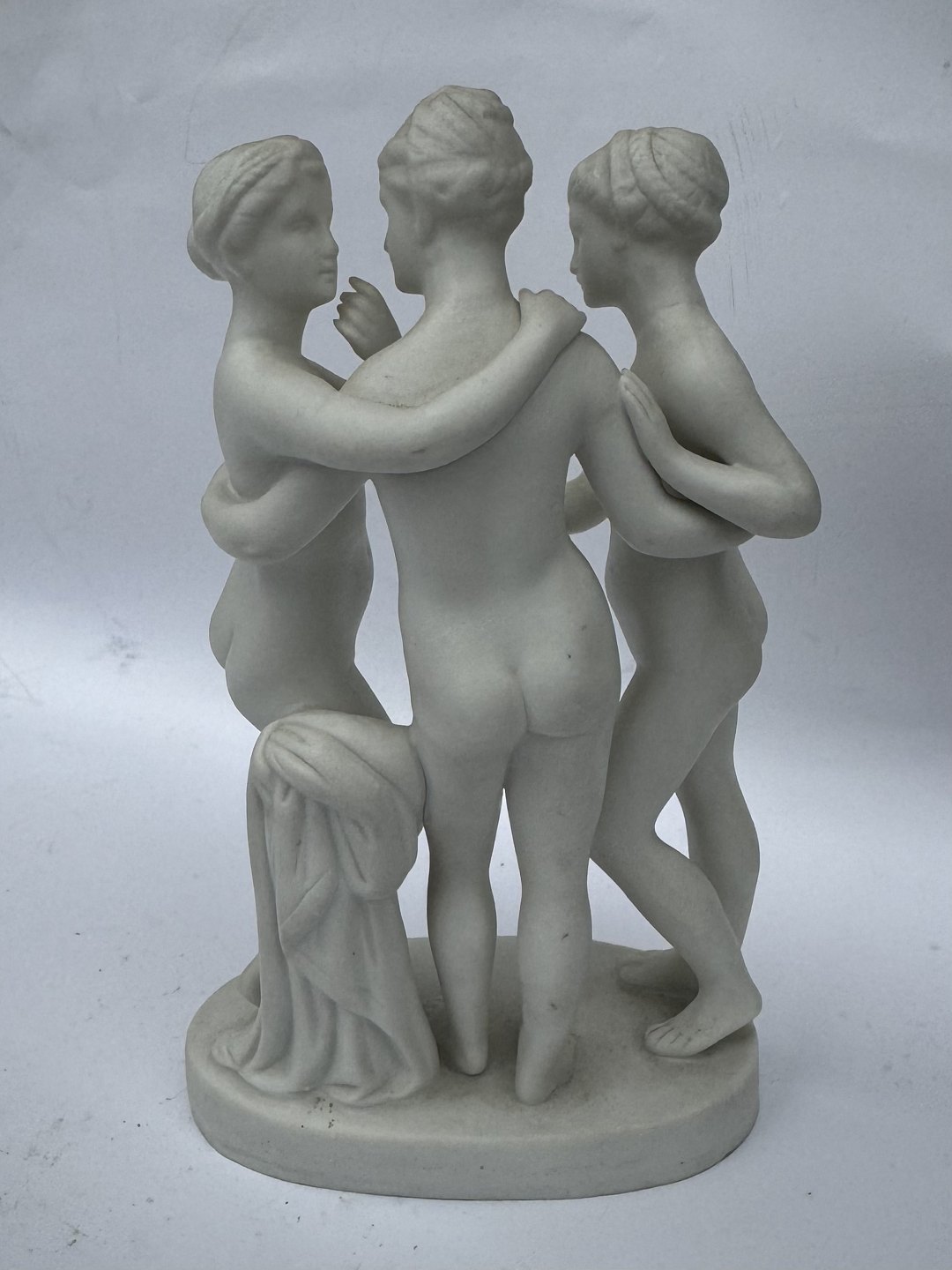 Design Bertel Thorvaldsen: De tre gratier i Bisquit porcelæn. I god stand. Ikke fabriksmærket. Formodes den er fremstillet på ukendt tysk fabrik. H. 18,3 cm
