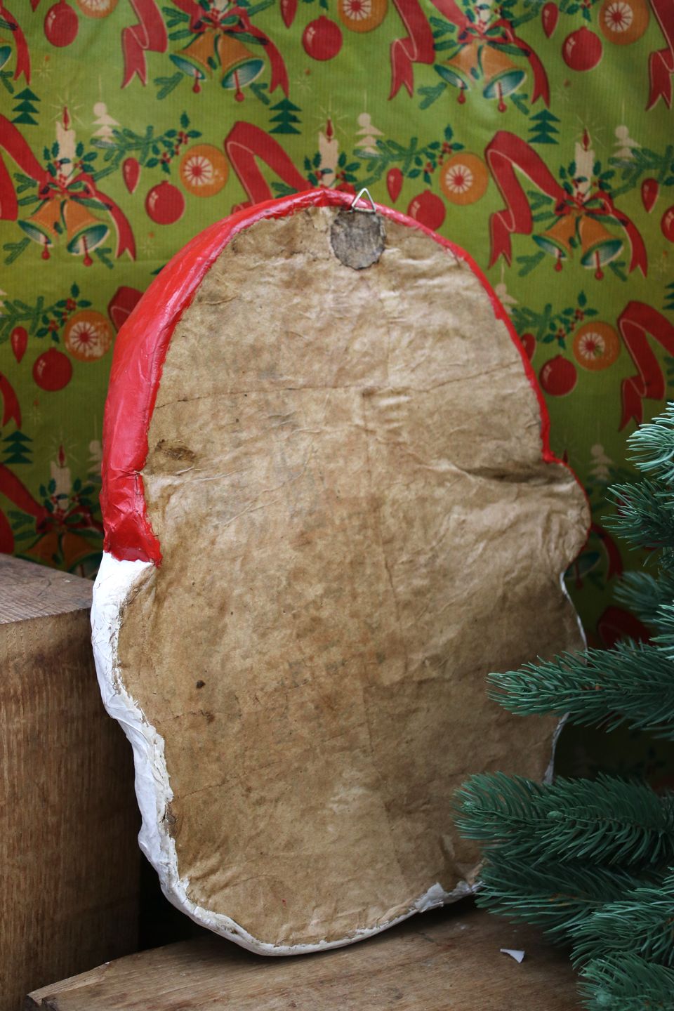 Gammelt julemands ansigt i bemalet papmaché som kan hænges op på væg eller dør. 35x29cm.