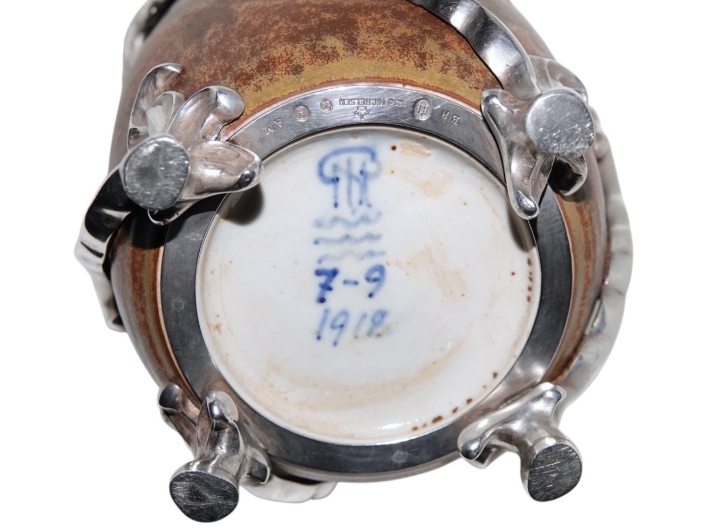 Royal Copenhagen keramik, stor og unik Patrick Nordstrøm vase med ekstravagant og kraftig sølvmontering og ametyster.