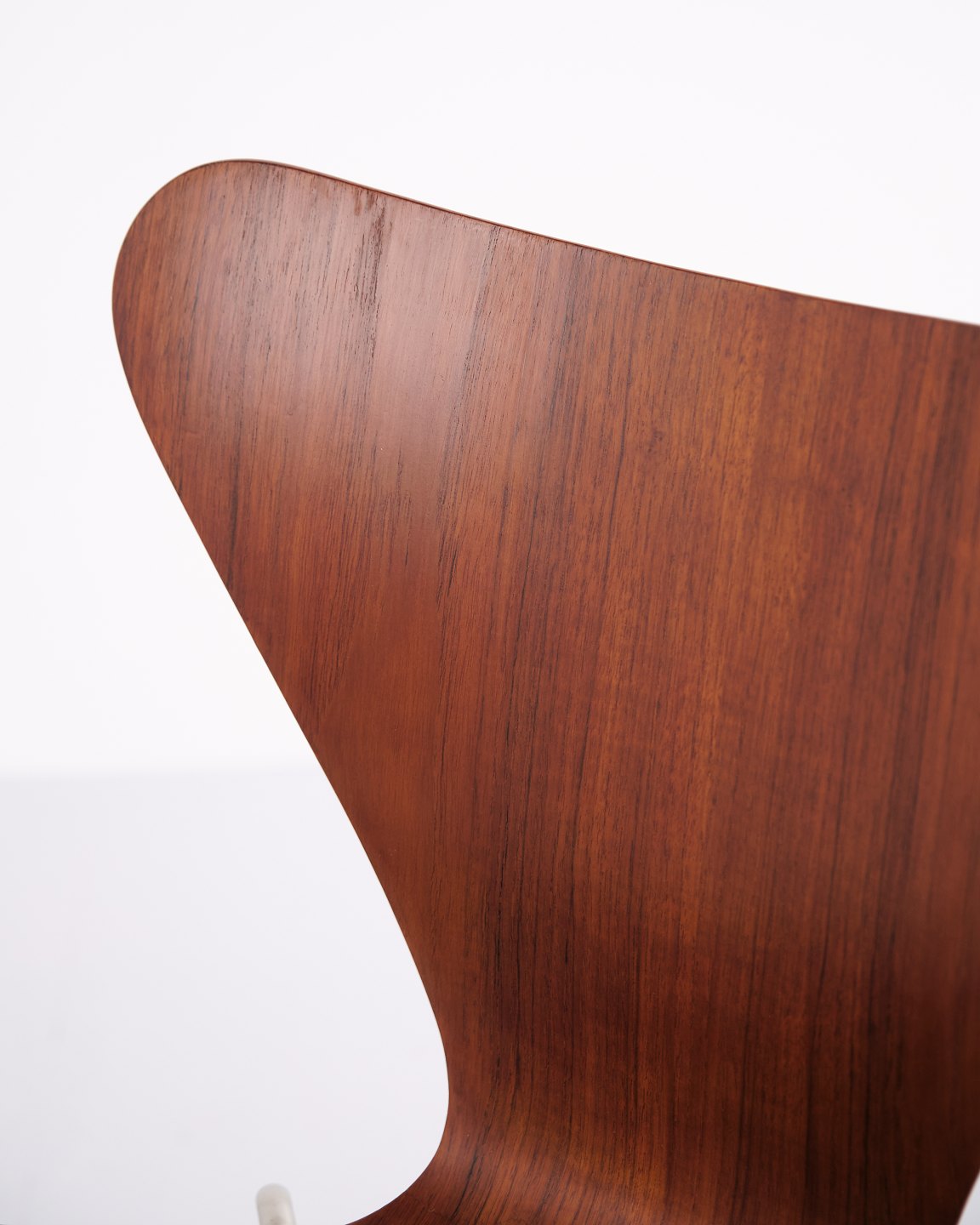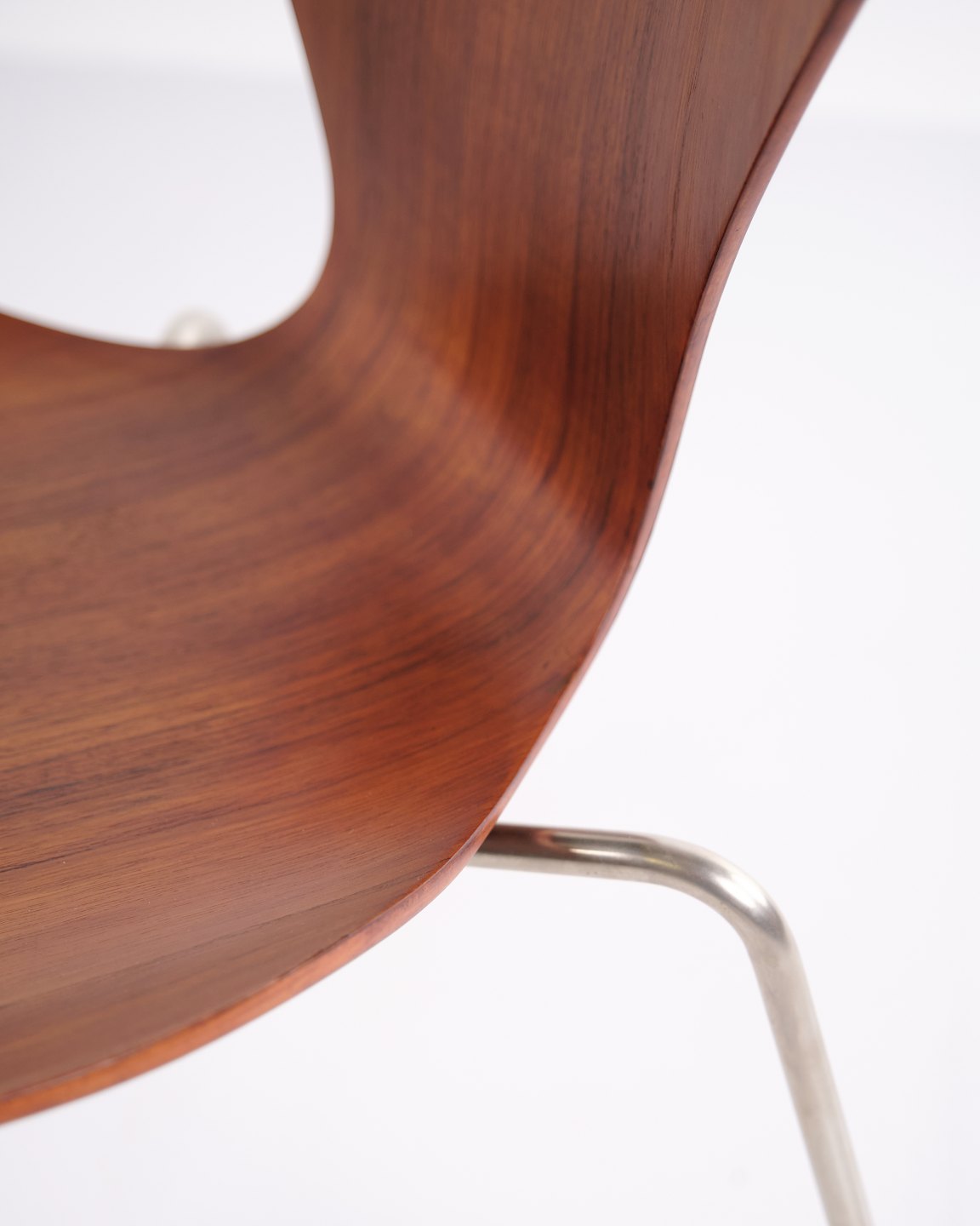 Sæt af seks Syver stole, model 3107, designet af Arne Jacobsen og produceret af Fritz Hansen. Udført i teakfinér med den karakteristiske formspændte skal, som gør stolen let, stærk og behagelig at sidde i. Model 3107 blev lanceret i 1955 og er i dag en af de mest ikoniske spisebordsstole inden for dansk design.