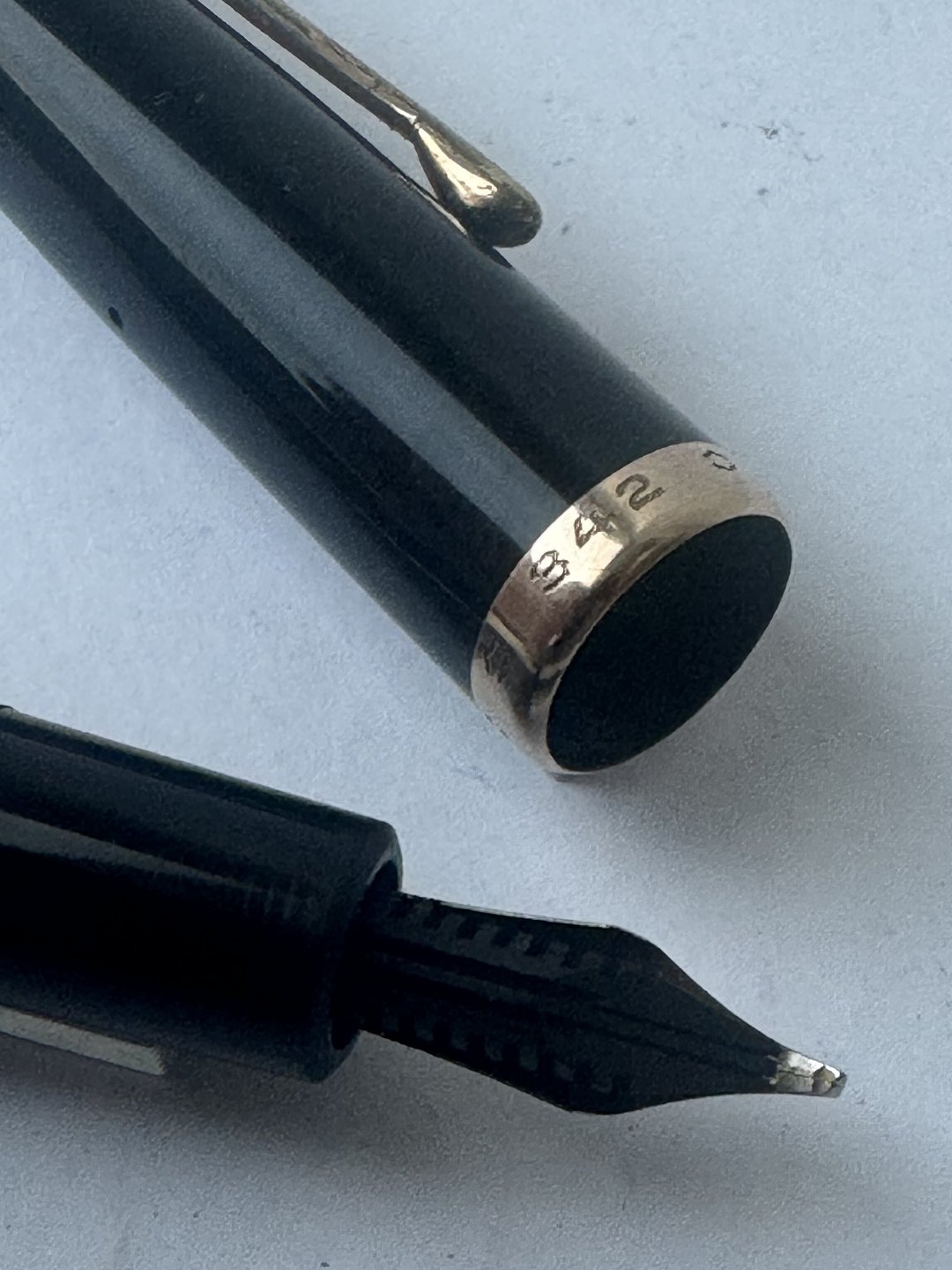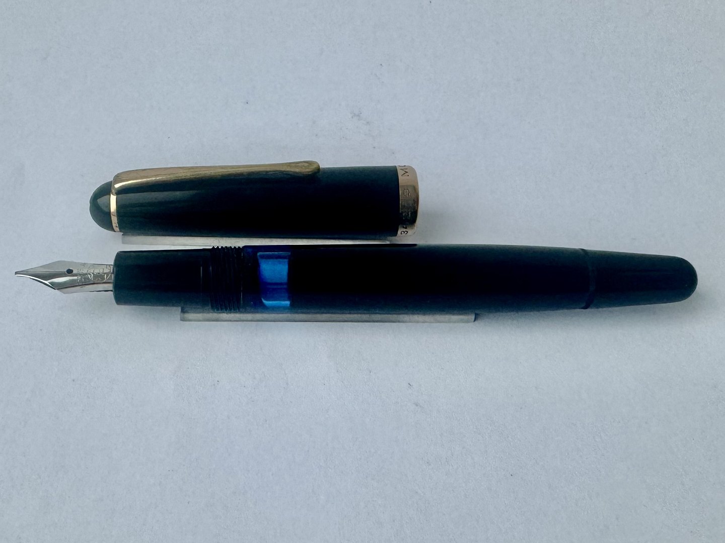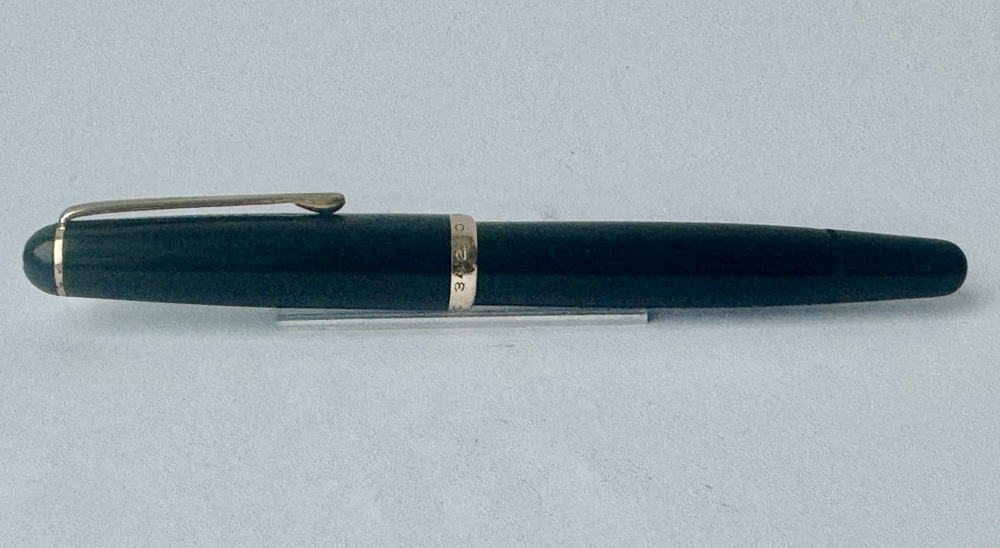 Sort Montblanc no. 342 med piston blækpåfylder. Pennen er blevet testet og den er klar til at blive brugt. Fremstillet i Tyskland i 1950’erne. Ingen skader eller reparationer. Alle dele på denne fyldepen er originale Montblanc dele tilhørende denne model. Længde: 12,7 cm