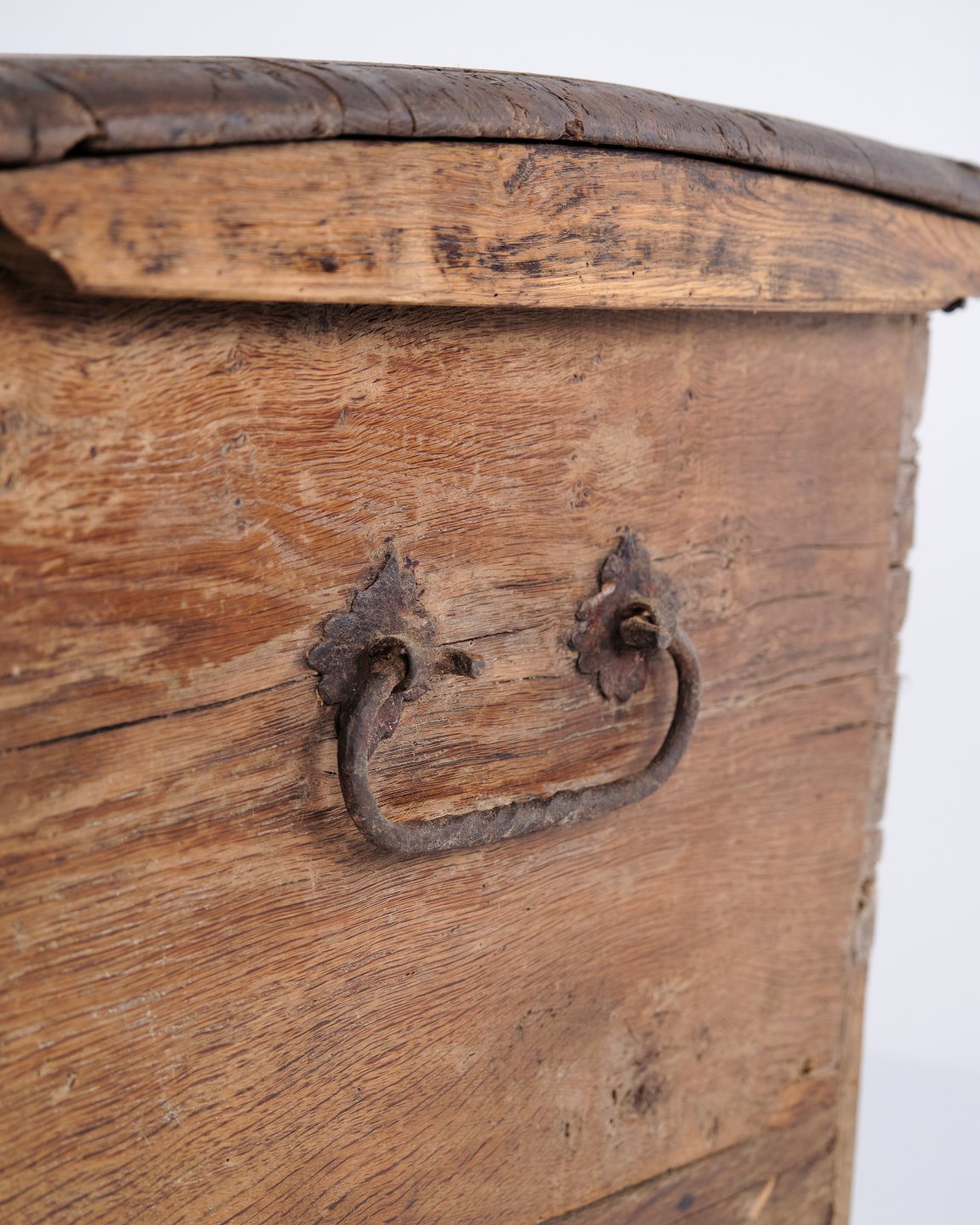 Kiste fra ca. 1860’erne, udført i egetræ med håndskårne detaljer og intarsia. Et dekorativt og solidt antikt møbel med karakteristiske udsmykninger fra perioden. Velegnet til opbevaring og som dekorativt interiør.