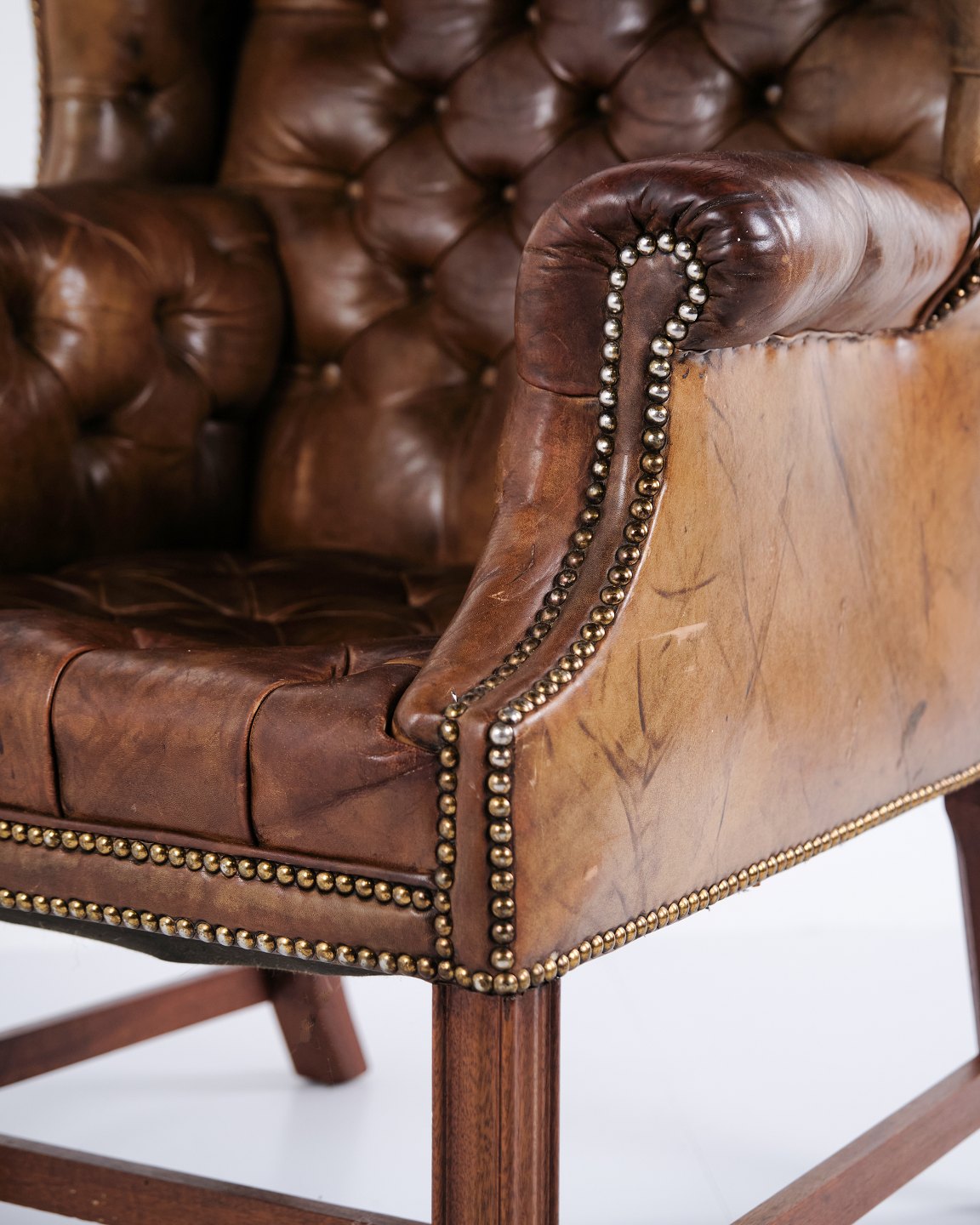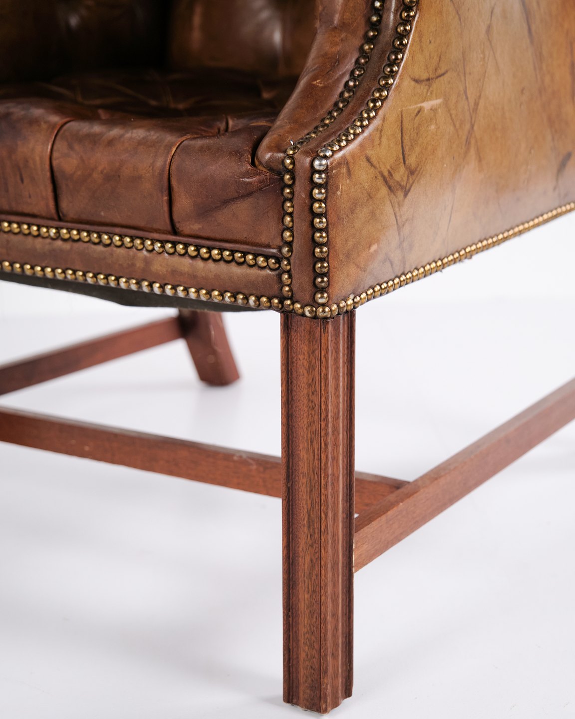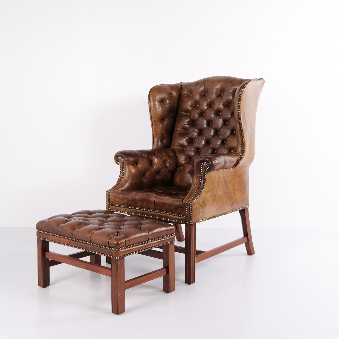 Høj kvalitet wingback armstol fra ca. 1910 i brunt originalt læder. Klassisk højrygget model med markante vinger og kraftigt stel. Med tilhørende skammel i samme udførelse. Stolinspiration fra George III-periodens engelske møbeltradition. Velbevaret original læderpolstring med smuk patina.