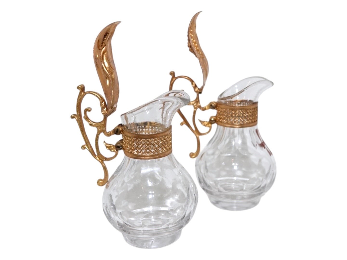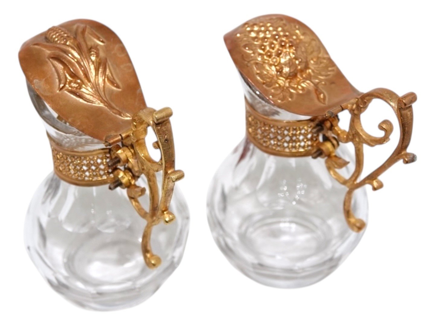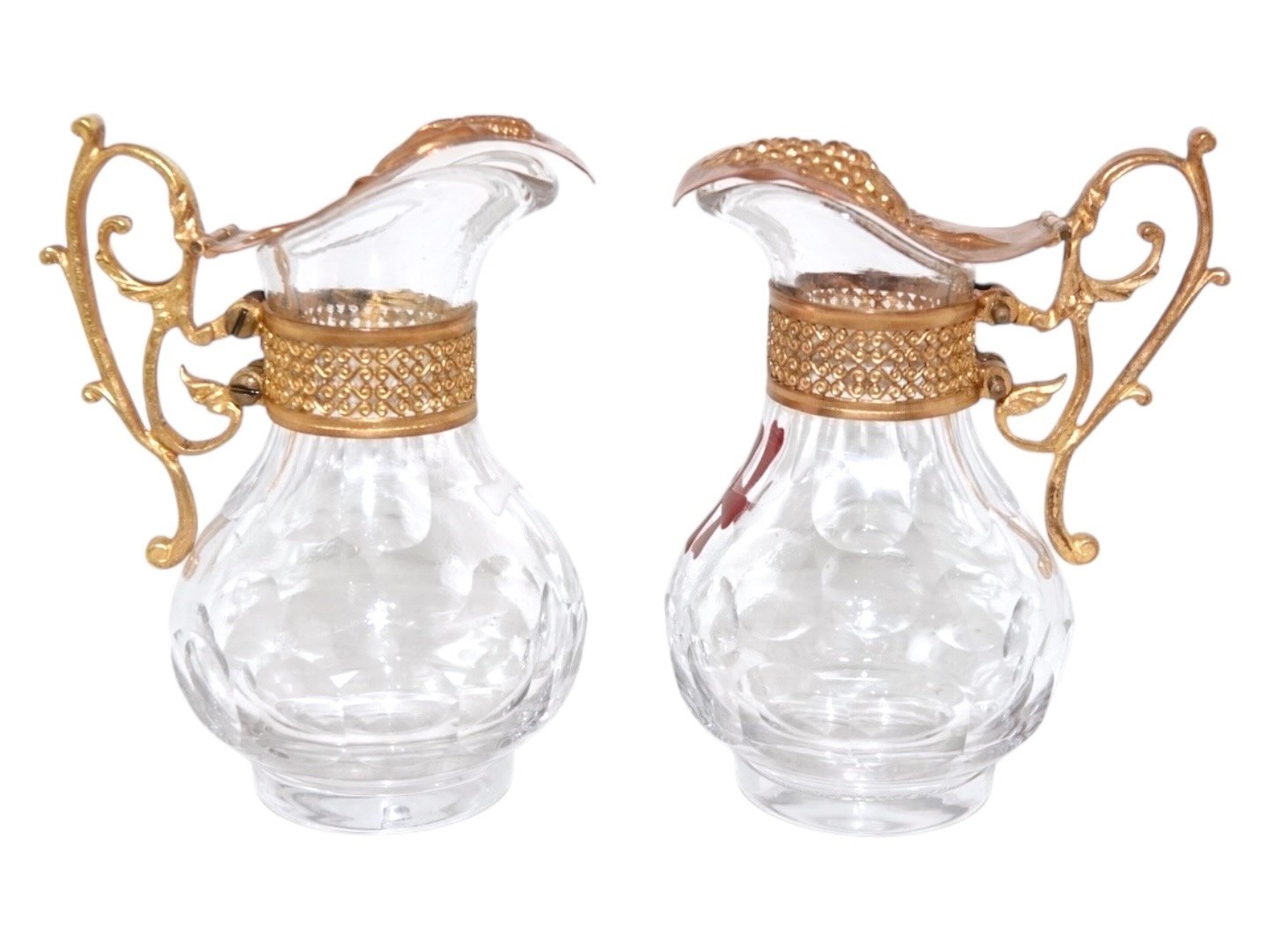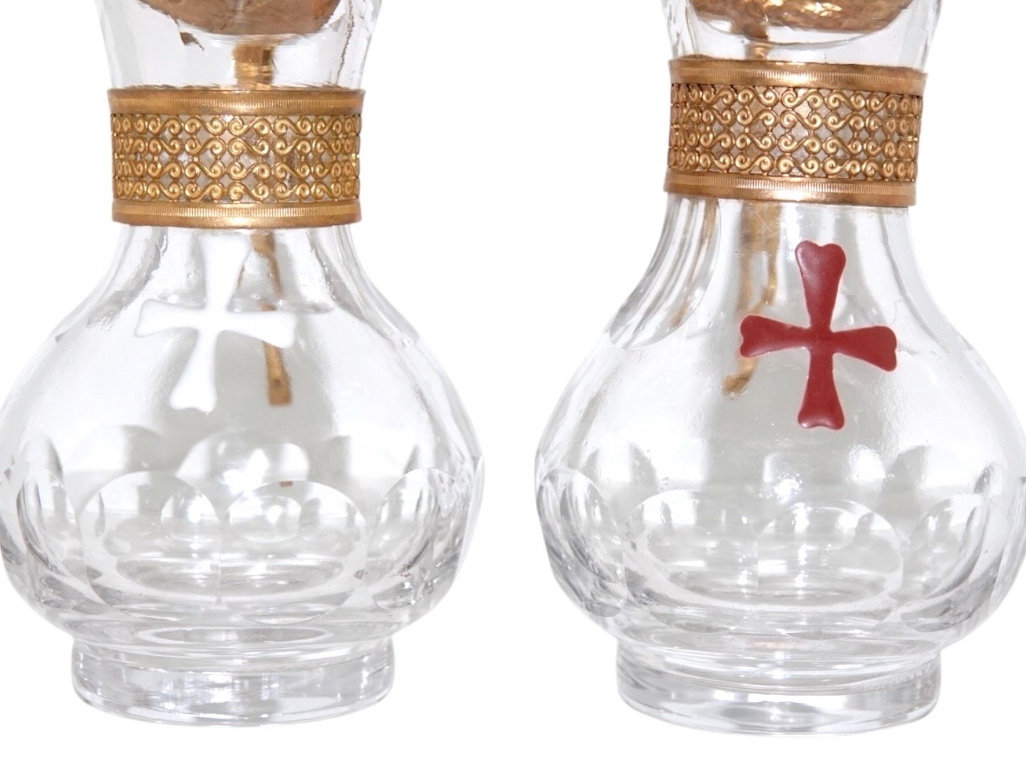 Et par små glaskander med bronze låg og dekoreret med henholdsvis et rødt og hvidt emalje kors.