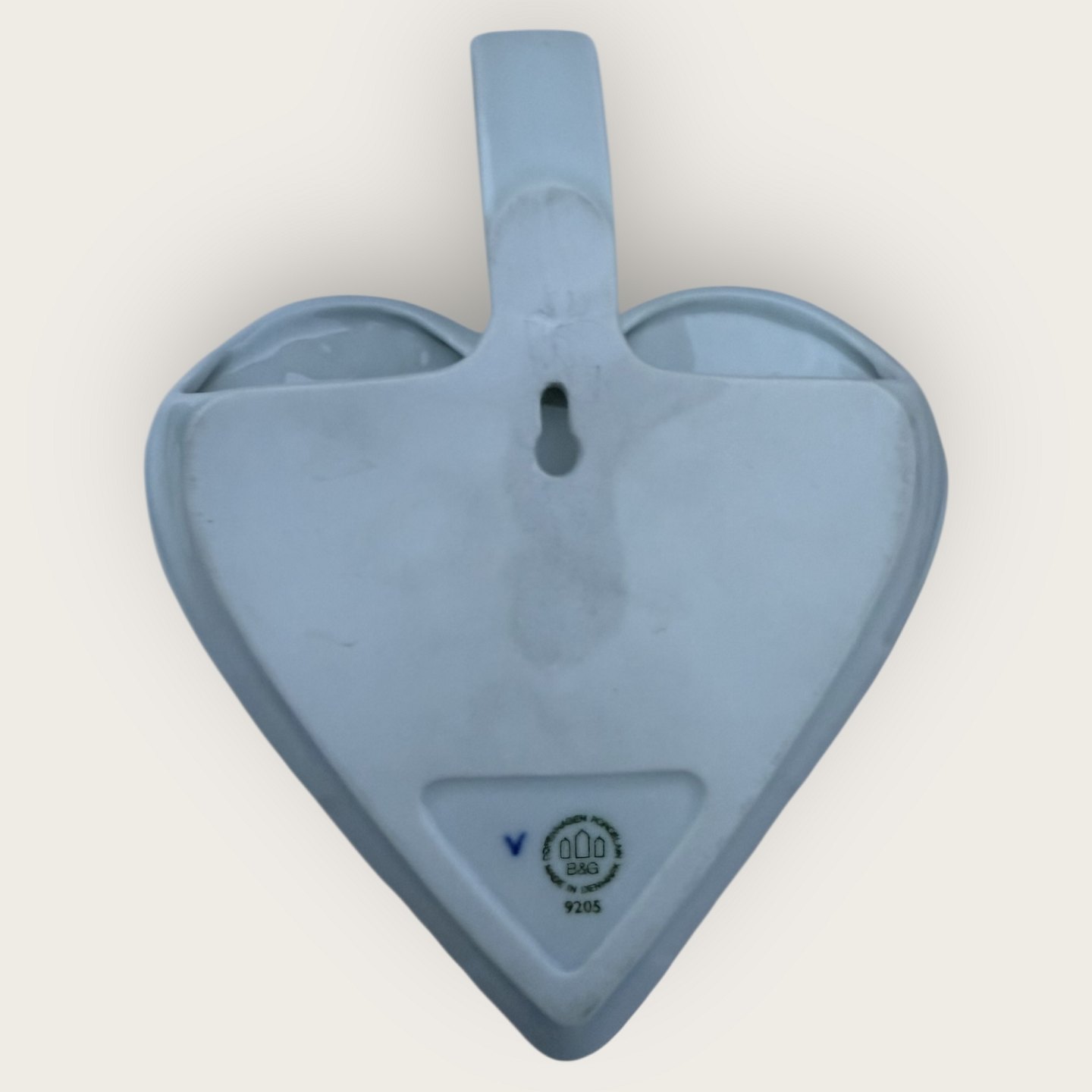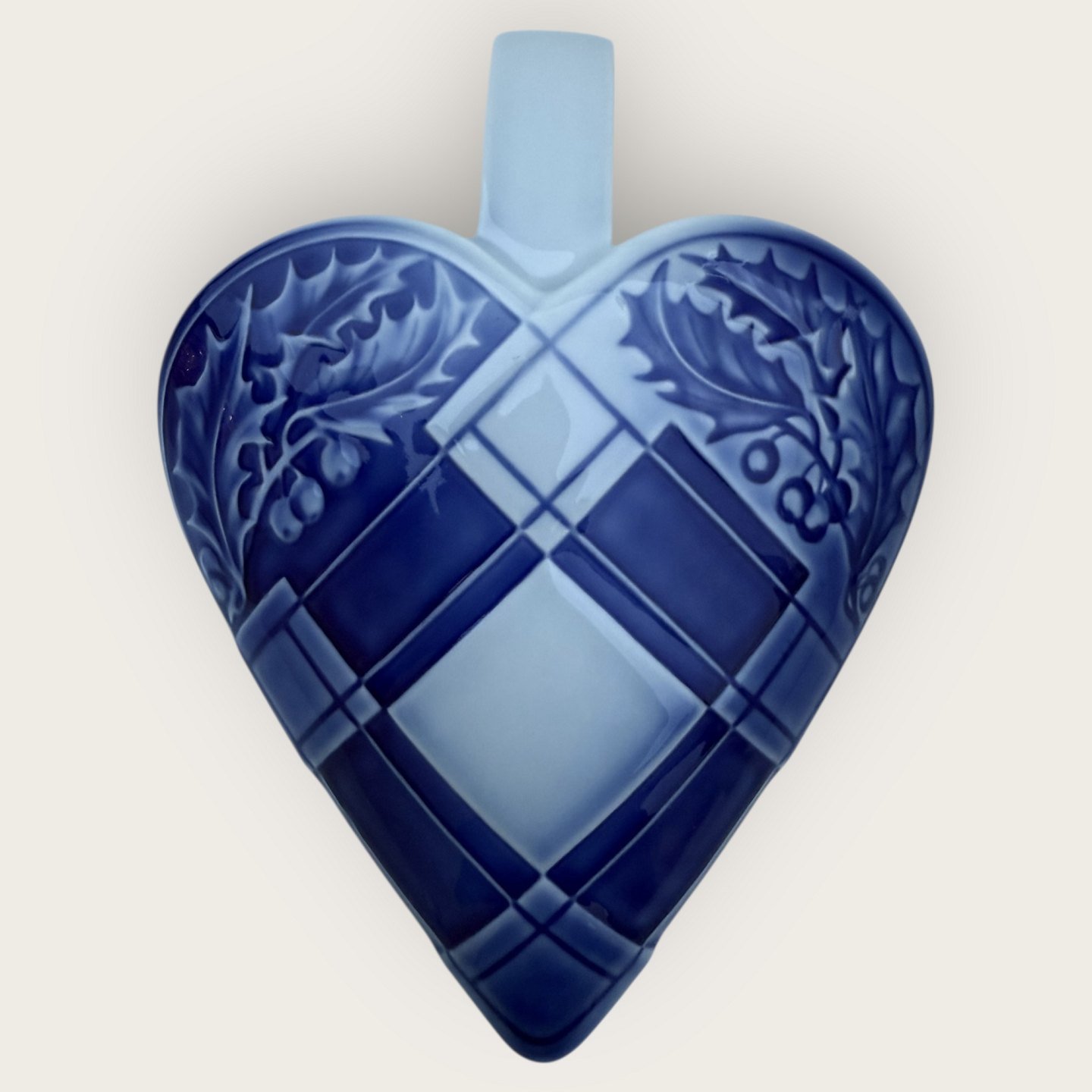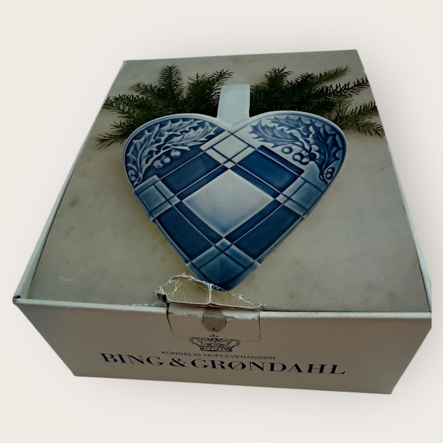 Bing & Grøndahl, Julehjerte til ophæng dekoreret med kristjørn, #9205, Mål 20,5x15,5cm, 1. sortering i fin stand - i original æske - denne dog med brugsspor.