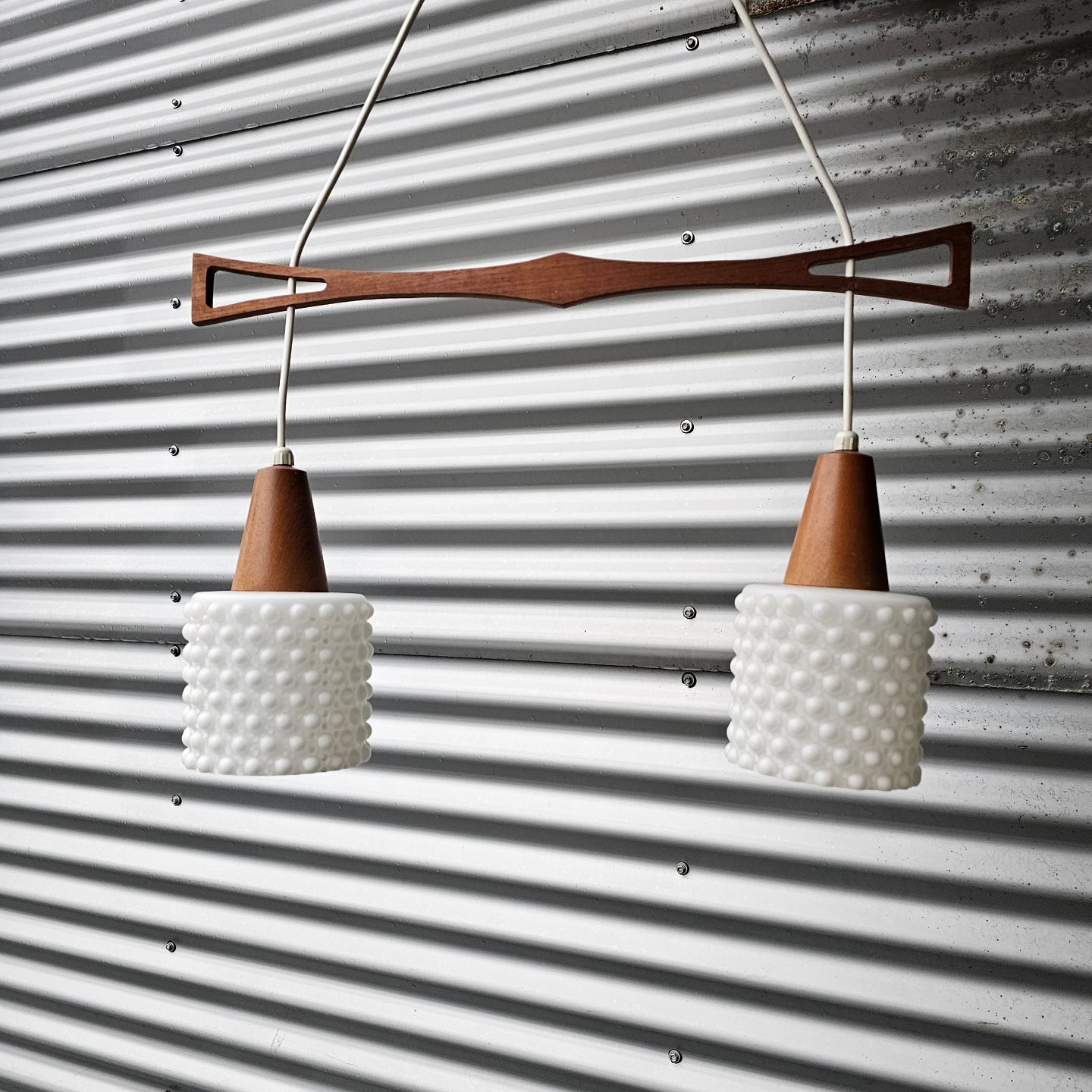 Pendel med ophæng i teak træ og skærme af hvidt opalglas
