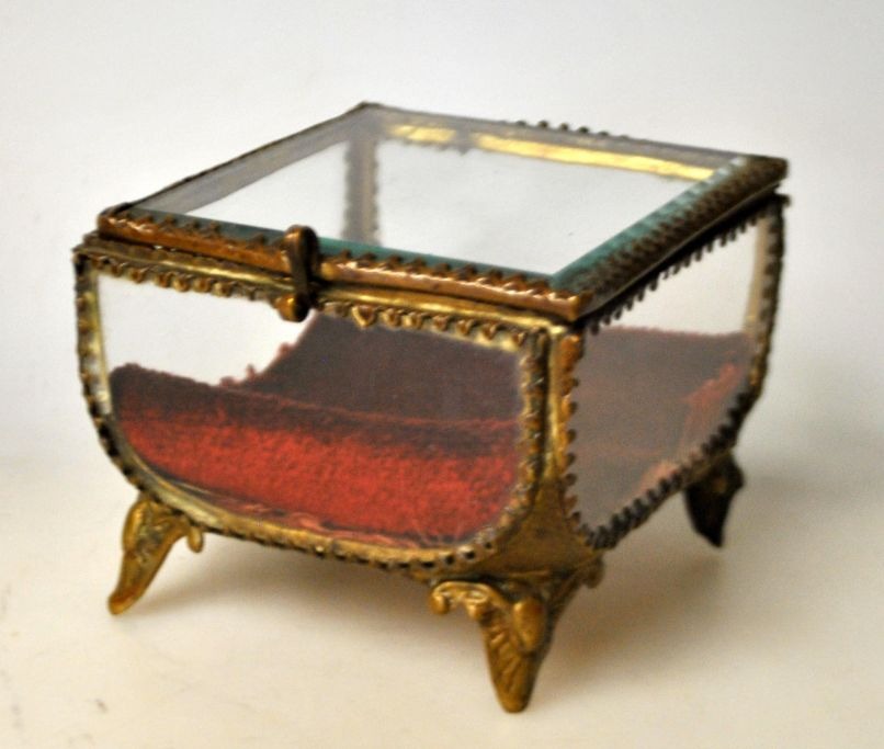 Smykkeskrin, Frankrig ca. 1900. Med facetteret glas og dekoreret messing rammer og fire ben. 8,5 x 8,5 x 7 cm.