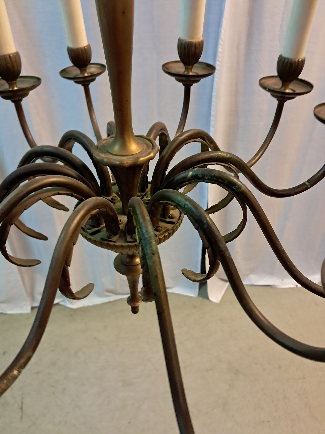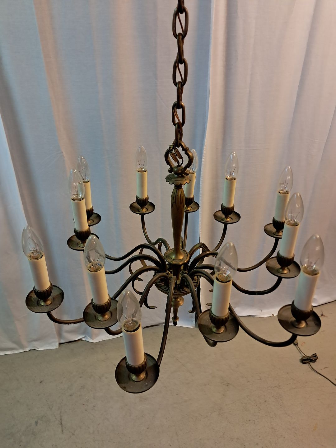 12-armet lysekrone i messing, fra 1950erne.