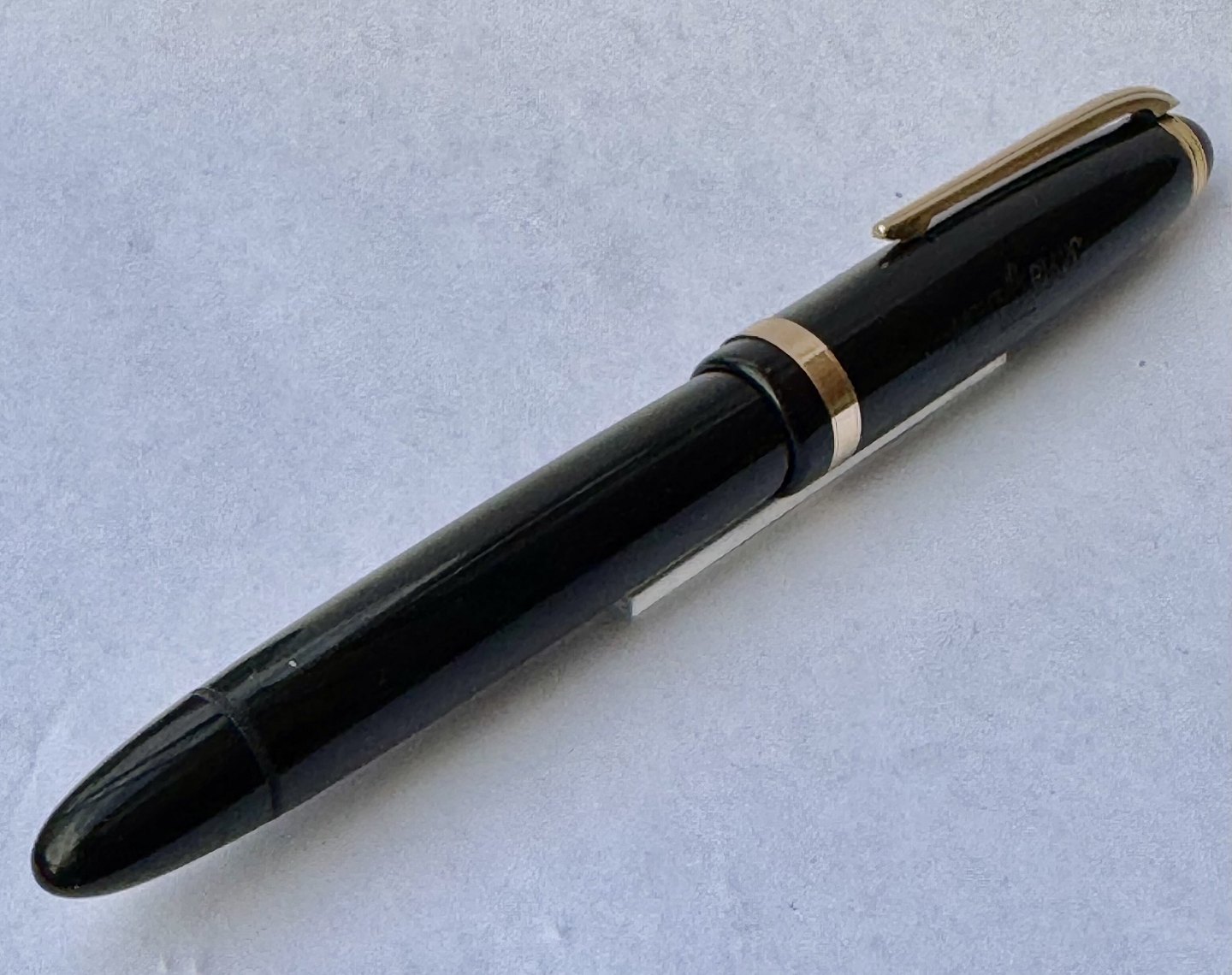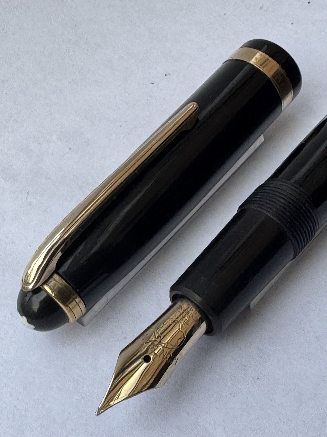 Sort Montblanc no. 216 fyldepen. Push button blæk-påfylder. Fremstillet i Tyskland. i 1950´erne. Fremstår i god stand uden skader eller reparationer. Alle originale Montblanc dele inclusive den flotte 14 karat guldspids. Der skal indsættes en ny gummisæk så pennen igen kan optage blæk og skrive igen. Mål: Længde 13,7 cm.