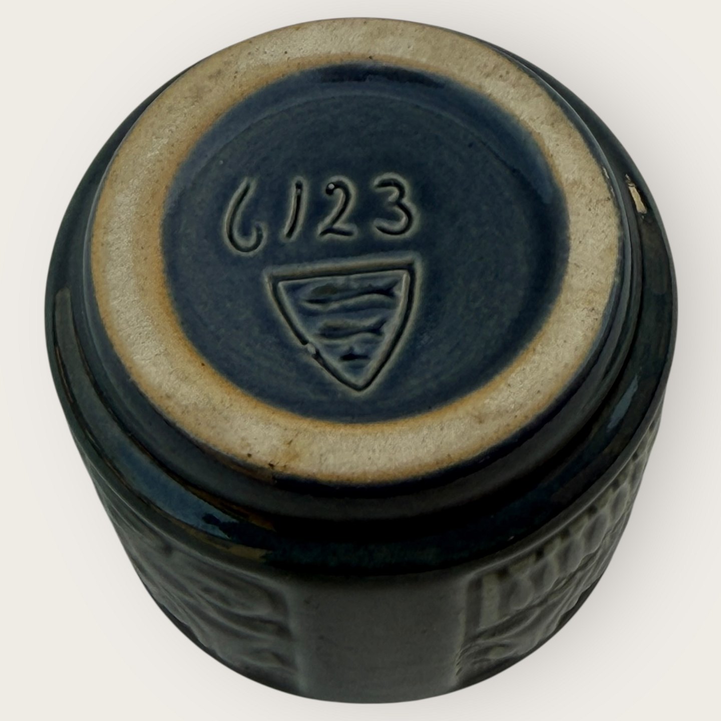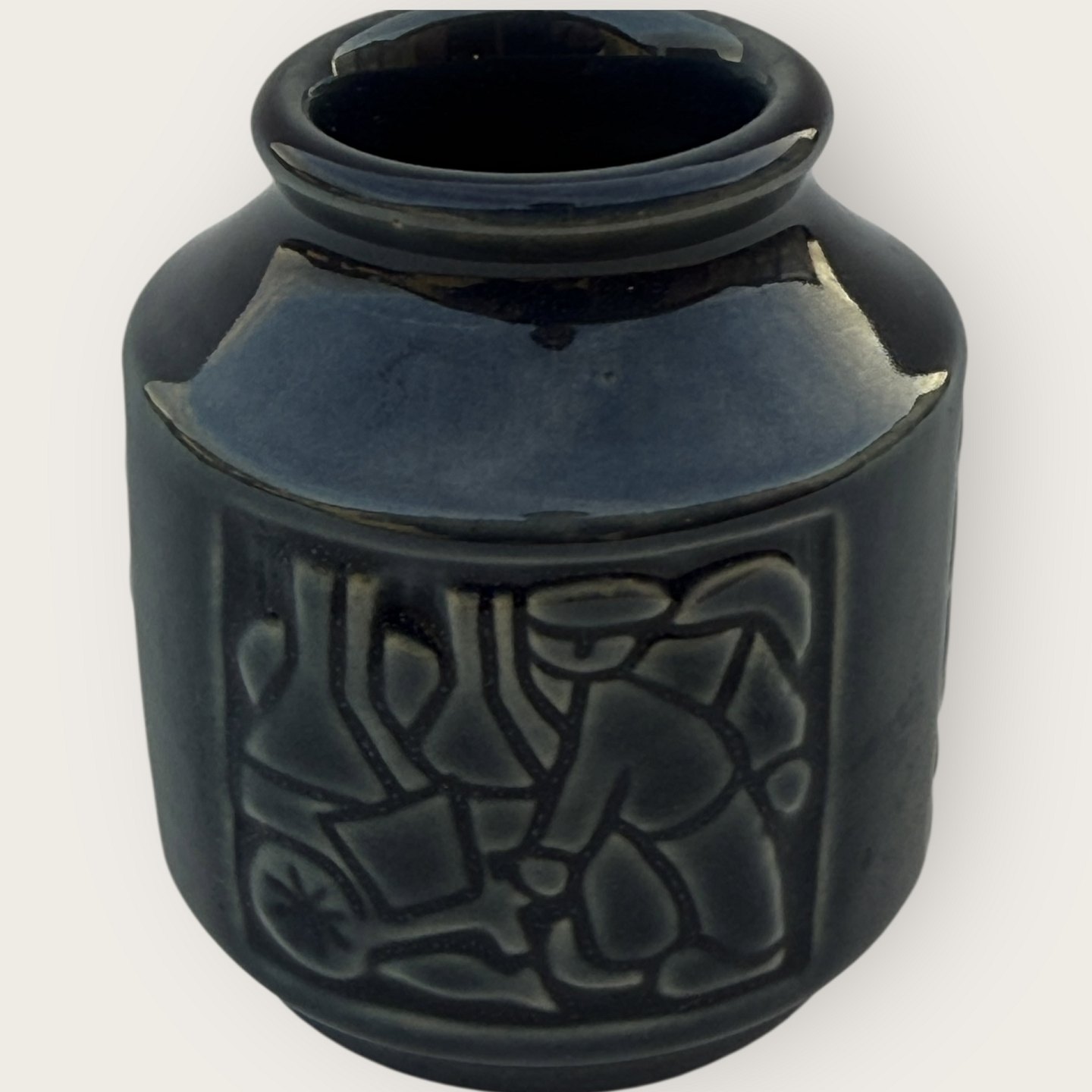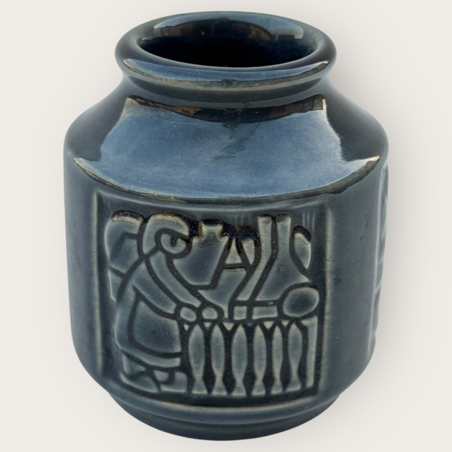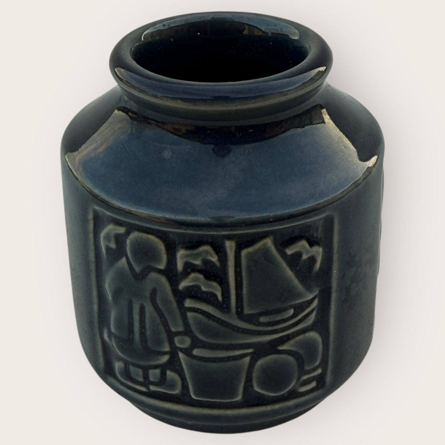 Bornholmsk keramik, Michael Andersen, Lille vasemed med motiver fra Bornholm, røgerier, fiskerkoner mv. Højde 8cm, diameter 6,5cm, #6123, fin stand.
