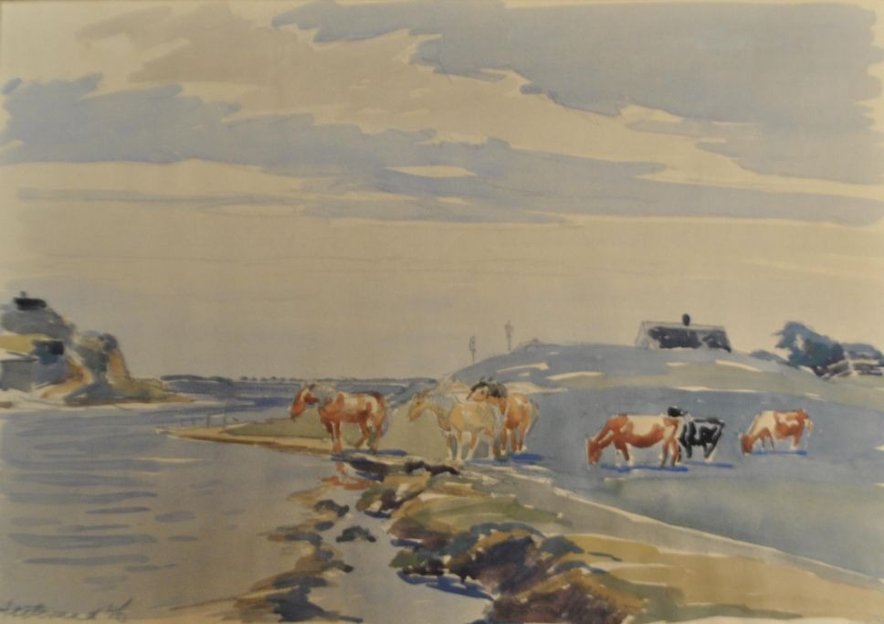 Svendsen, Albert (1889 - 1959) Danmark: Heste og køer ved en fjord. Akvarel. Signeret 1946. 28 x 40 cm.