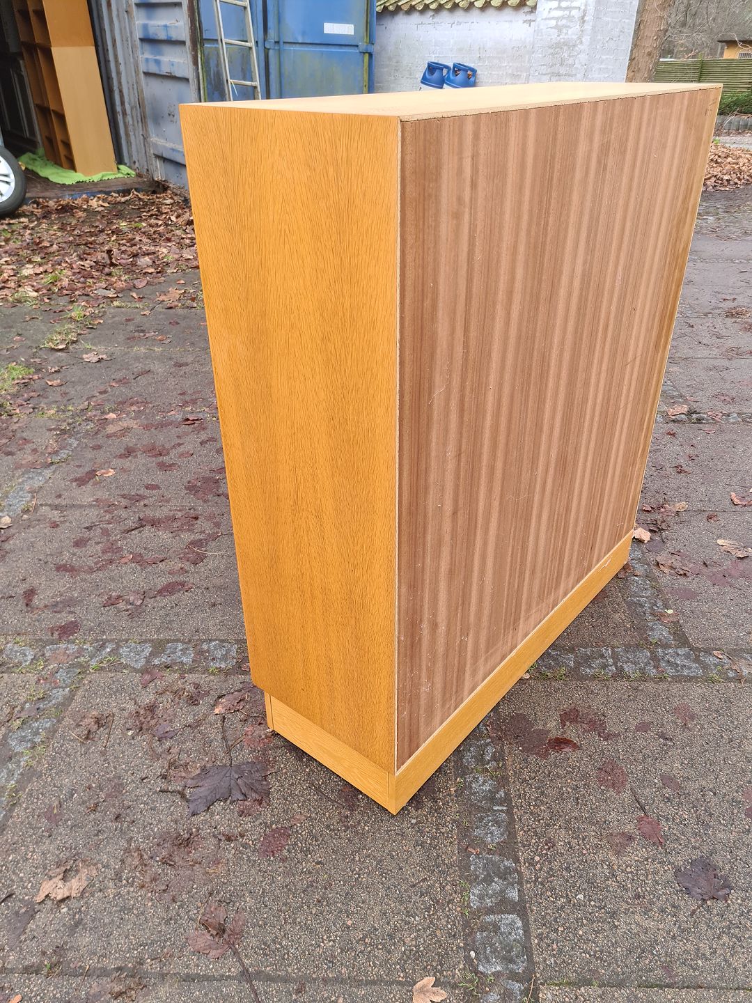 Reol i finéret eg med underskab og hessian beklædt bagbeklædning. Ydført hos HG Funiture i 1970'erne. Fremstår pæn og velholdt uden de store brugsspor.
