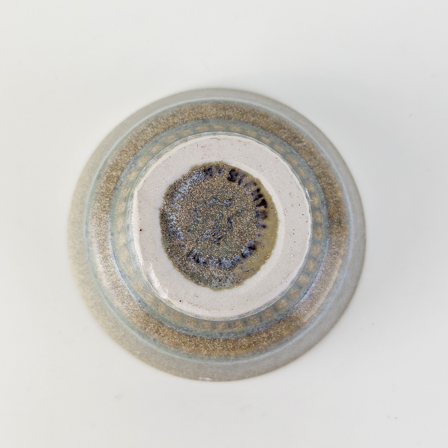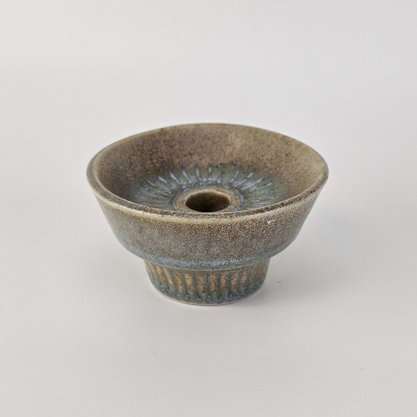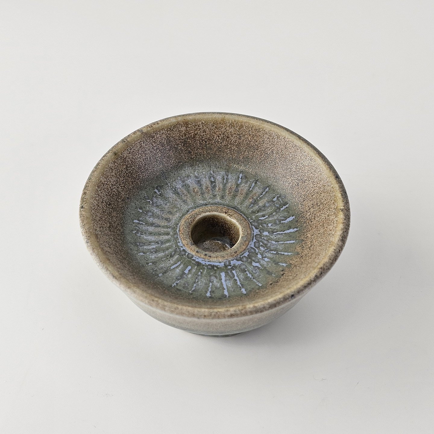 Lysestage af stentøj og dekoreret med en grønlig nuance glasering.