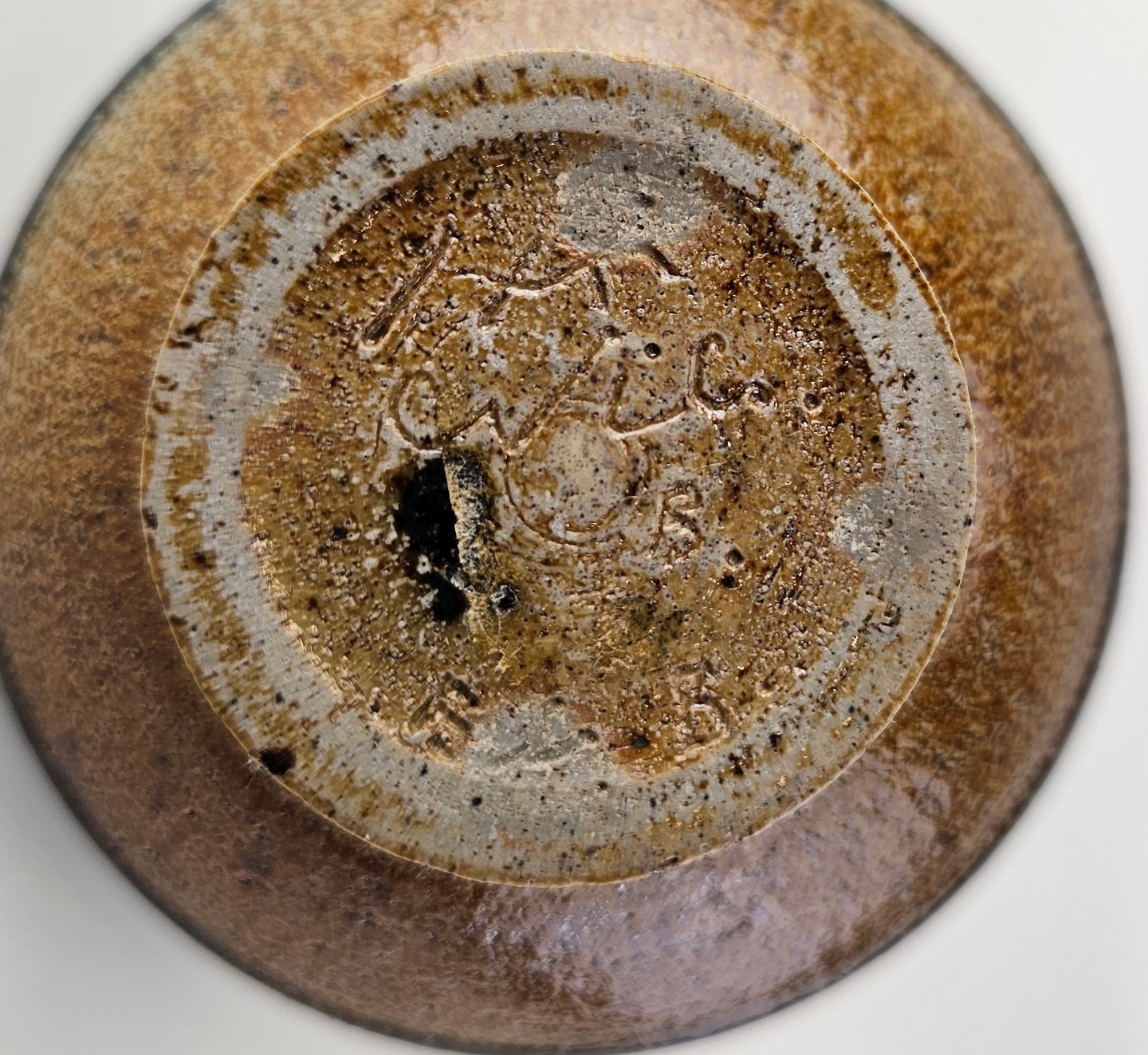 Vase smal fod og topi grå glasur, og bred midt for i blålig farve