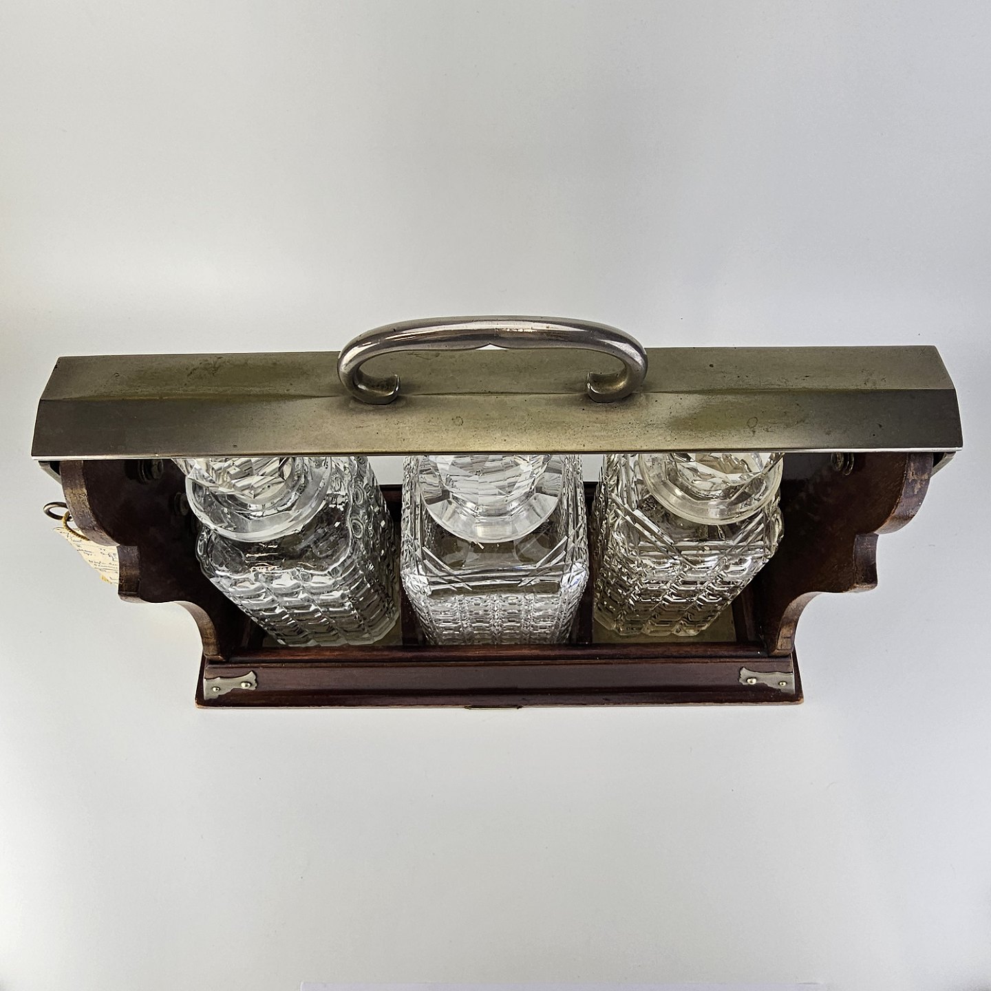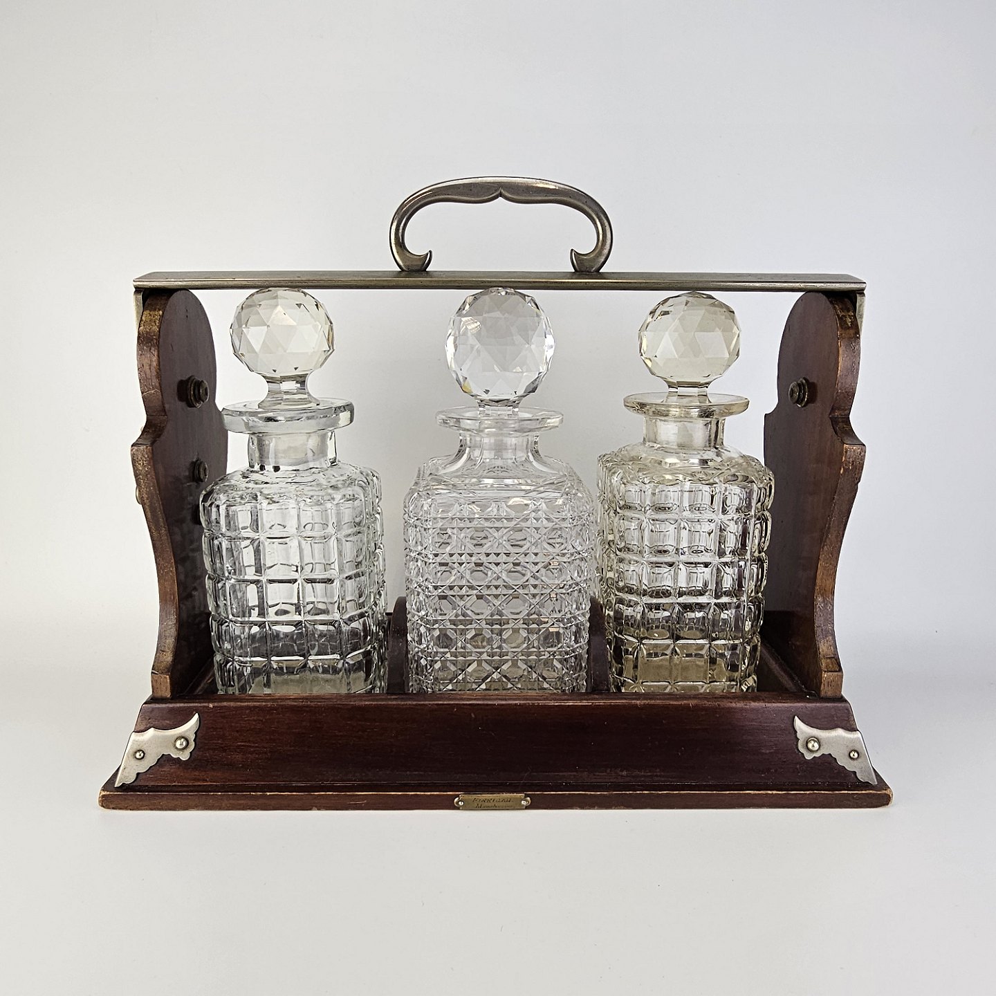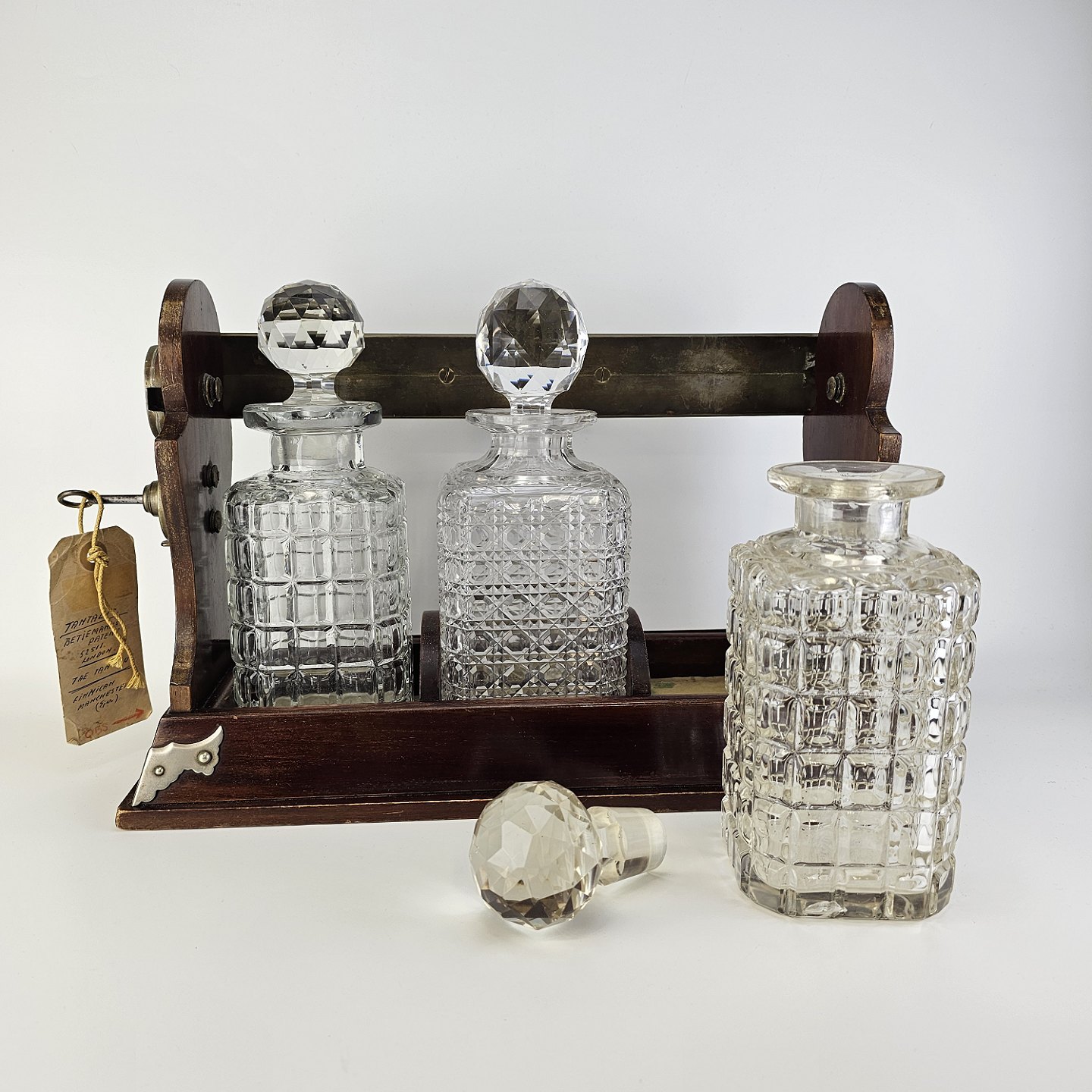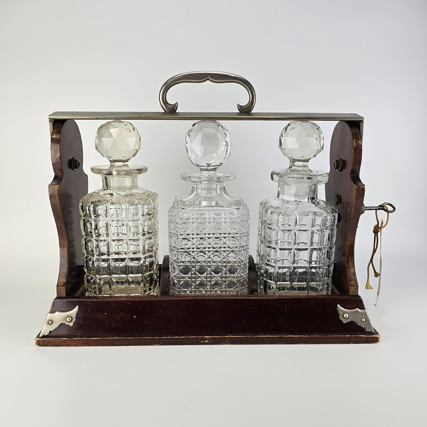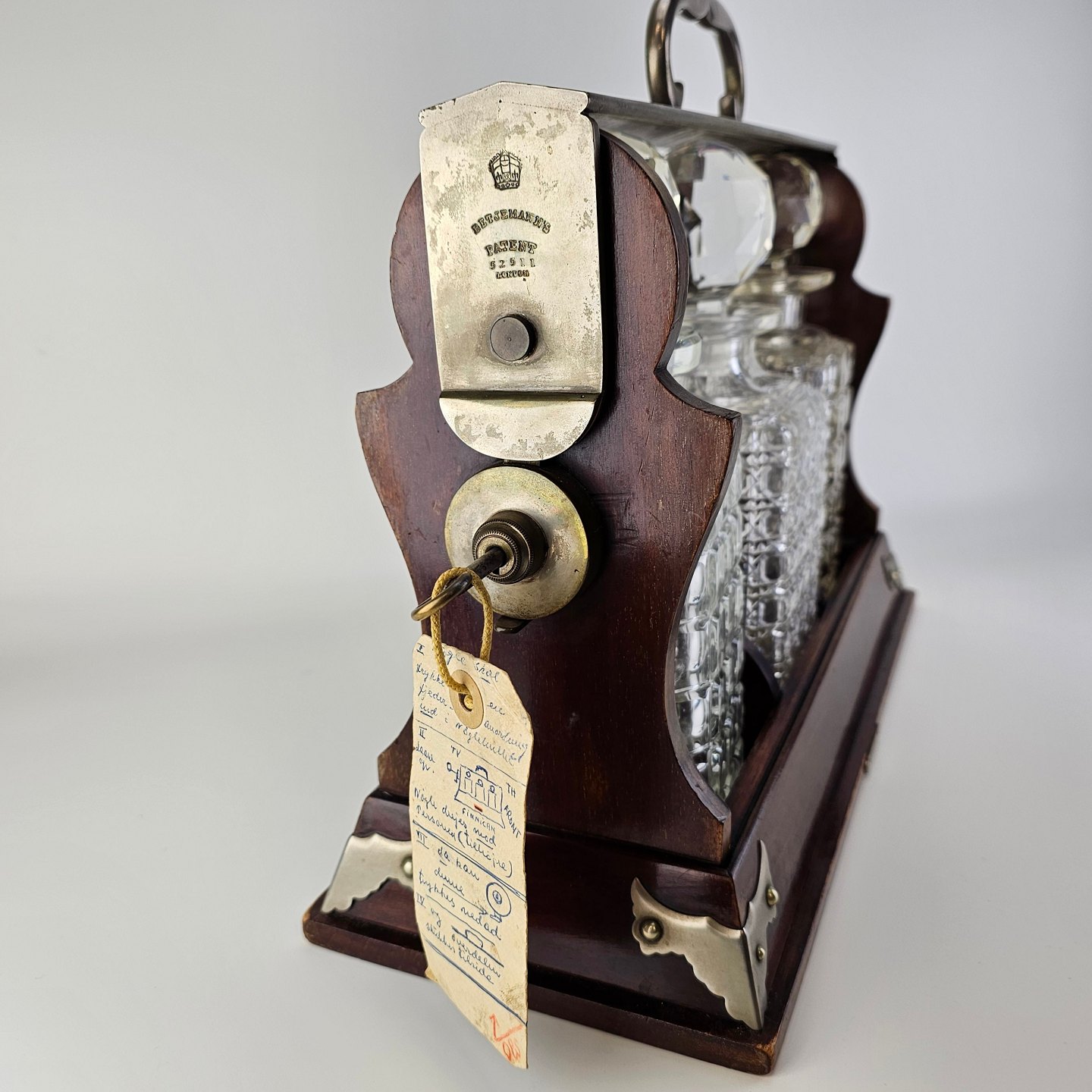 Tantelus med 3 firkantede karafler, formentlig ikke originale, da der er forskel på dem. Med rund glas kugleformet prob. Lås virker fint.