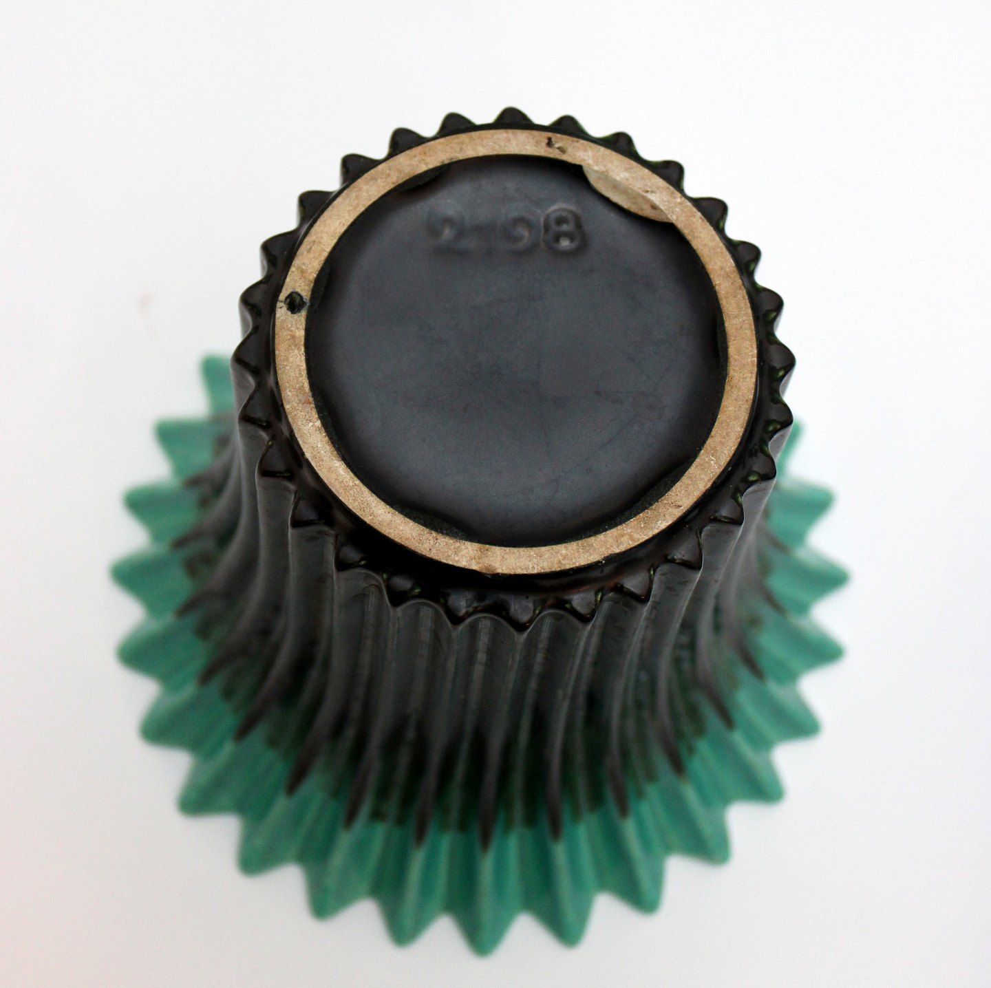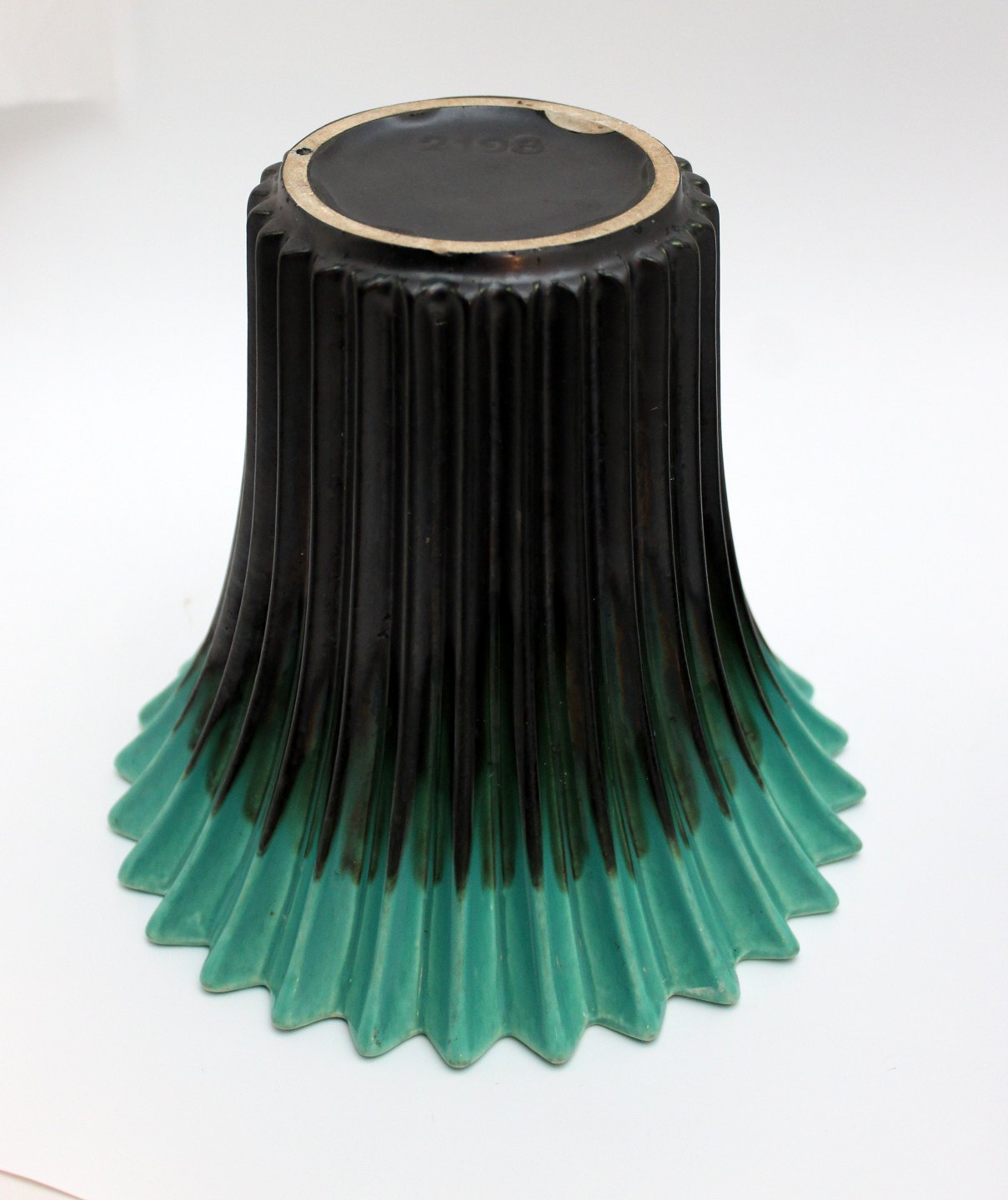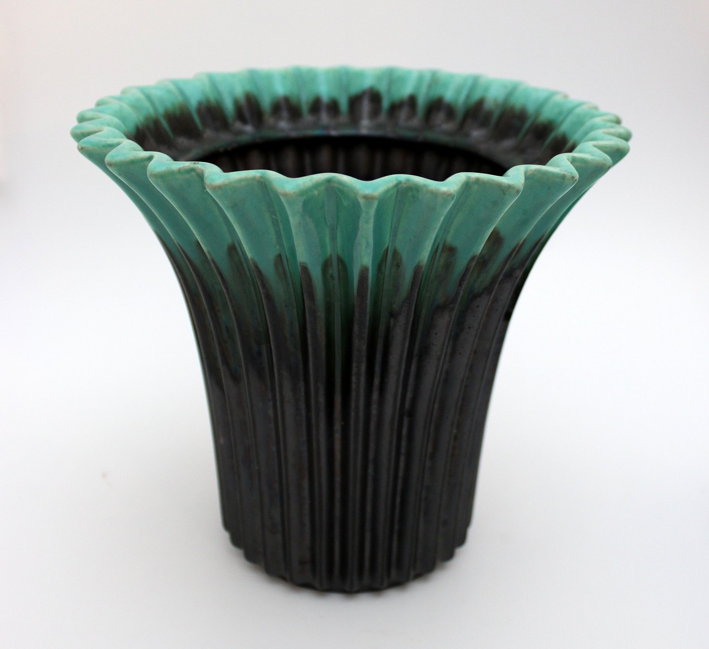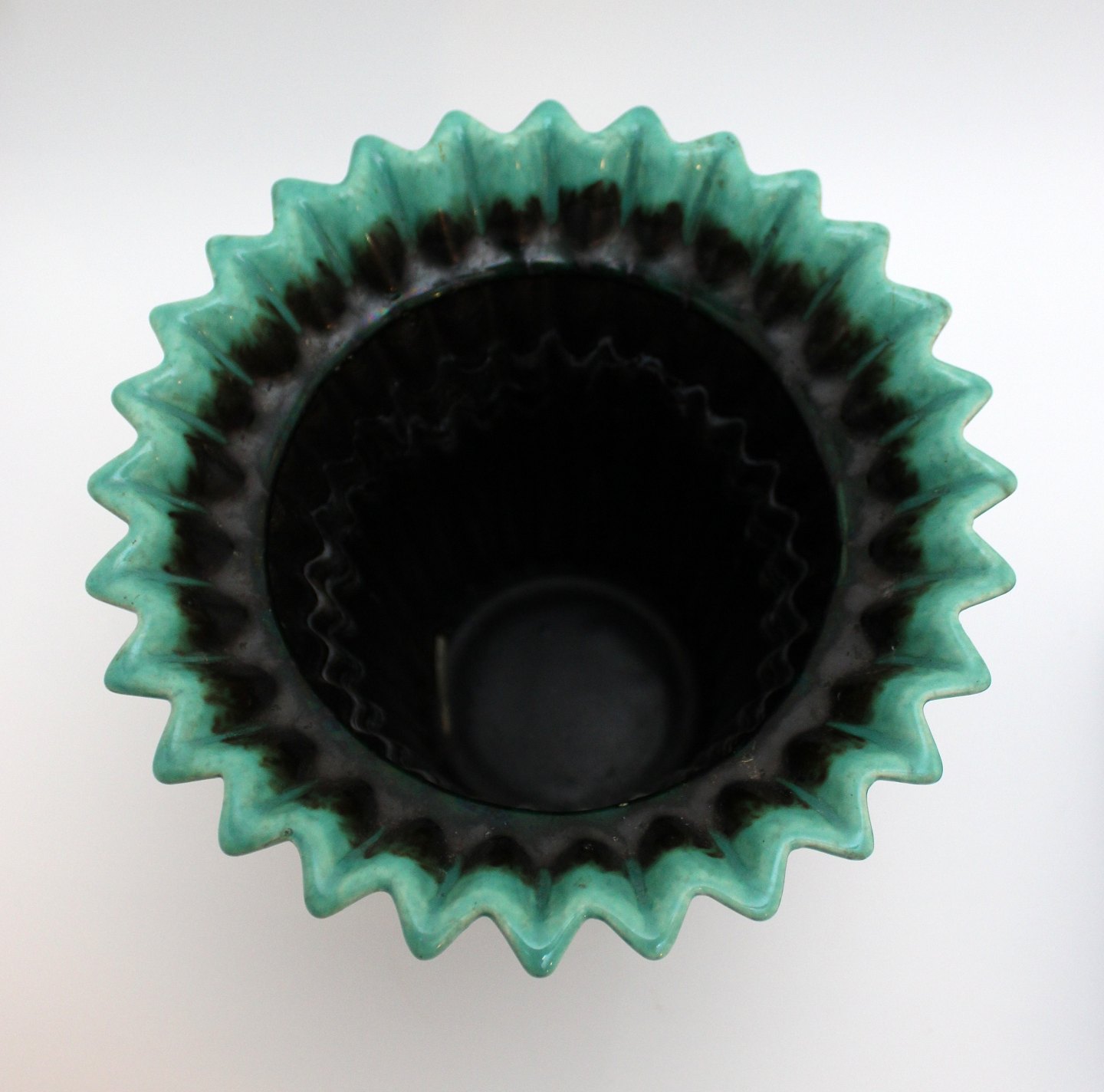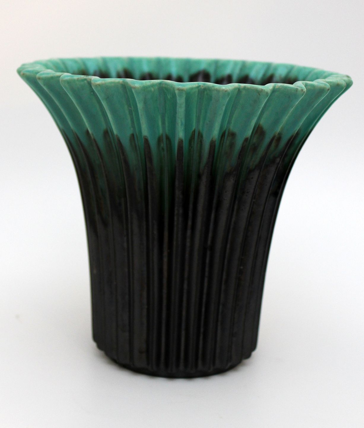 Sort rillet keramik vase med turkis kant. Nr. 2198. Kender ikke keramikeren eller fabrikken. Men vasen er meget dekorativ og anvendelig. Fin stand, bred kalkagtig rand indvendig. Højde 17,5 cm. Øverste diameter 19,5 cm. Nederste diameter 10 cm. Pris: 375 kr. Lager: 1