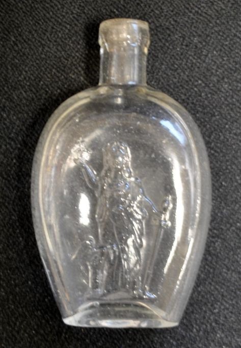 Tysk lommelærke i klart glas med motiv af Germania, 19. årh. Klar glas. Præget i bunden med "1/8 L". L: 12 cm.