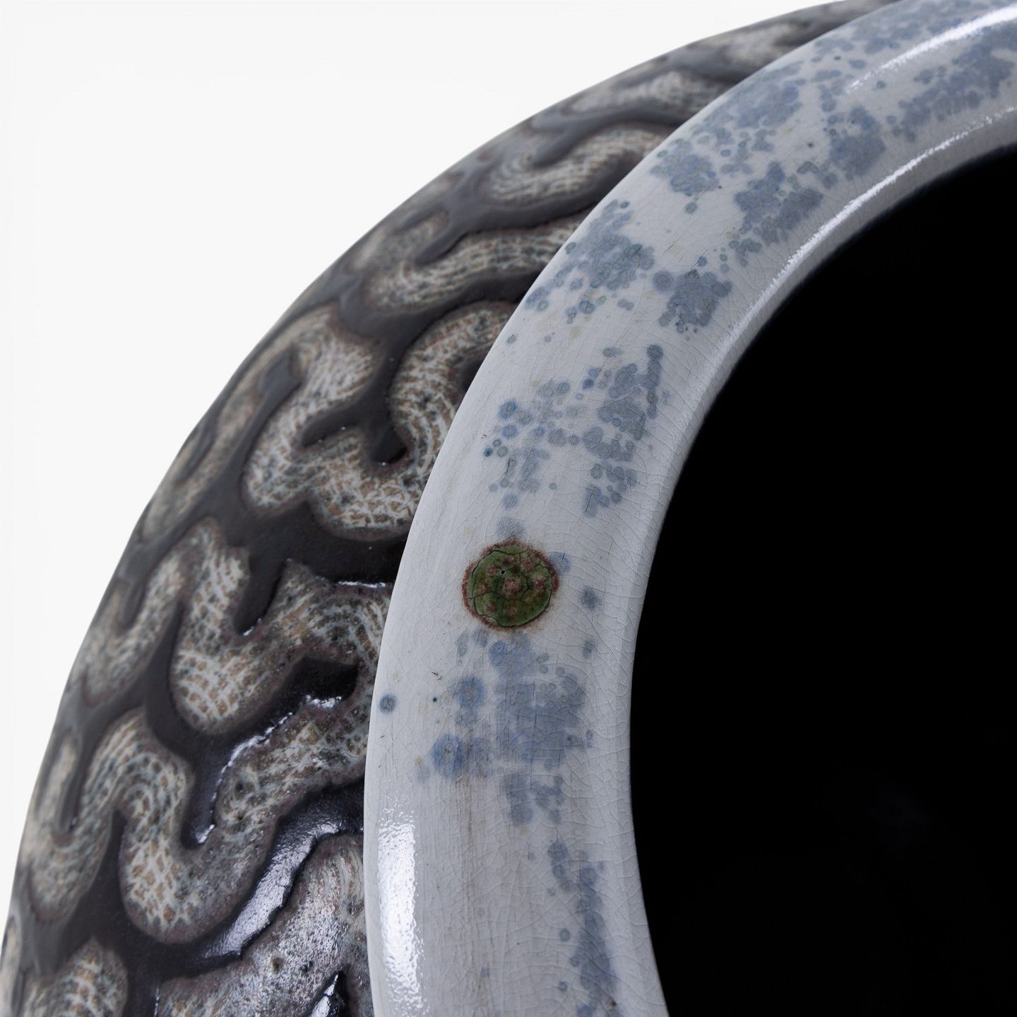 Kolossal krukke i stentøj med sort glasur og hvide stafferinger. Signeret.