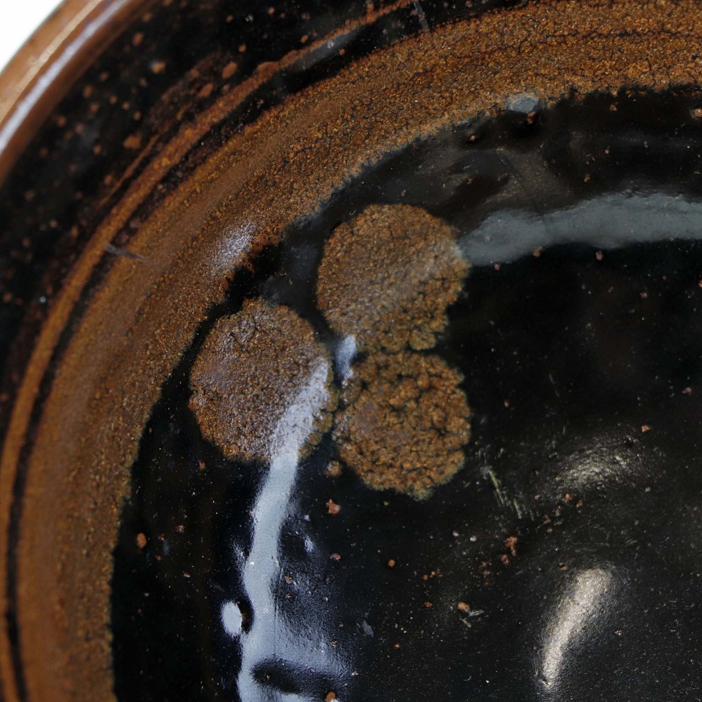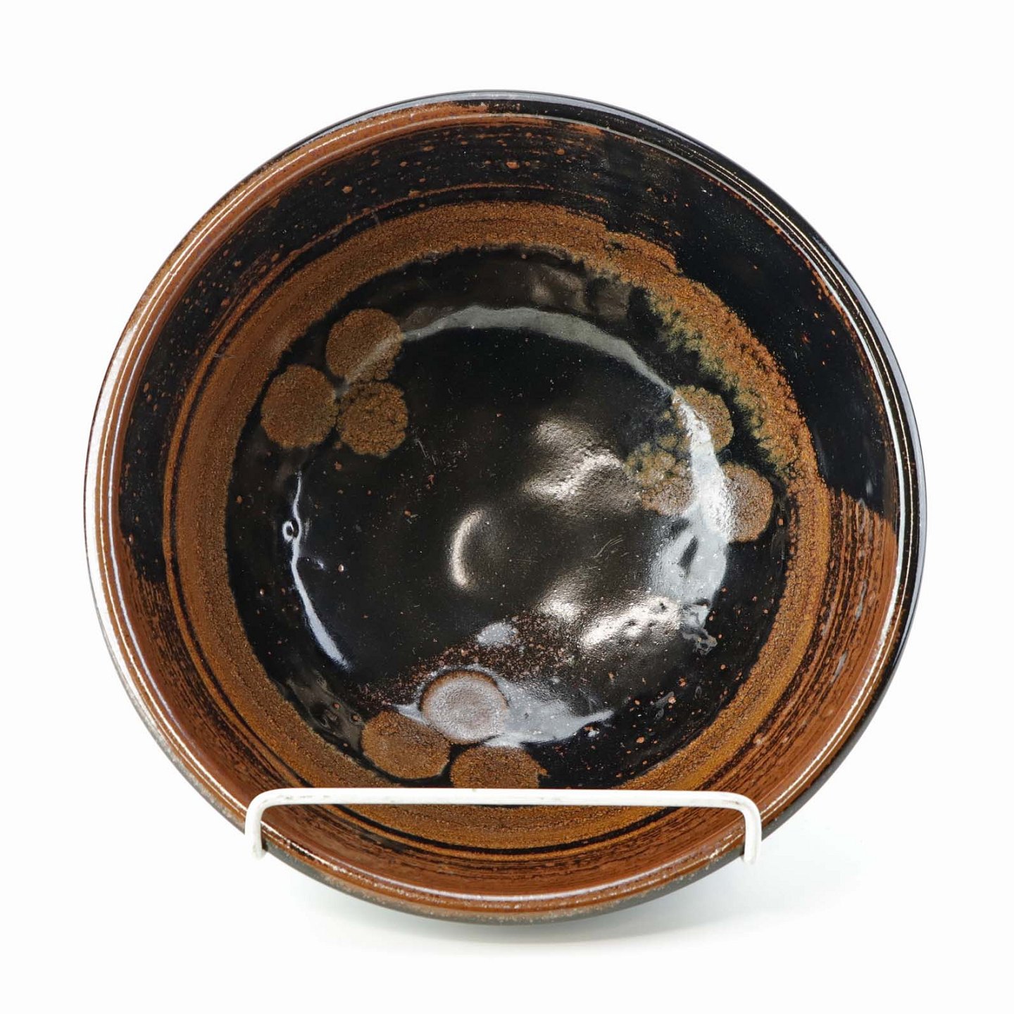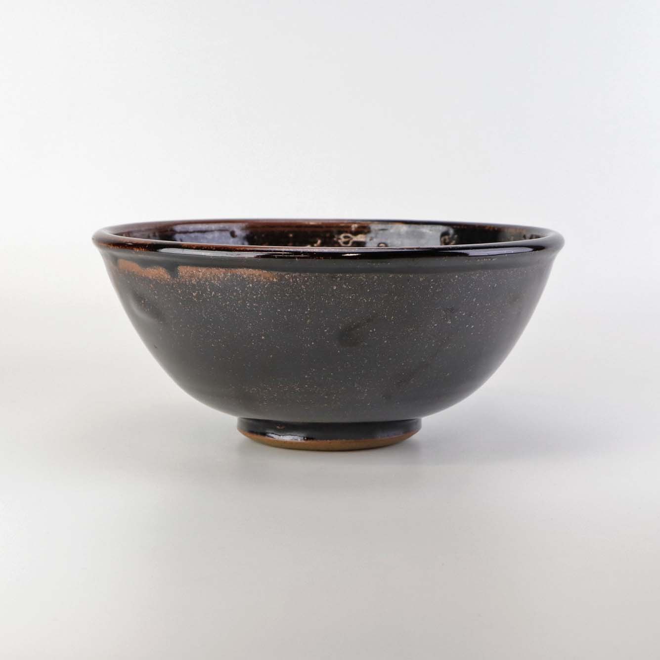 Skål i stentøj med delvist nubret glasur i brunlige nuancer og cirkelformet mønster i bunden.