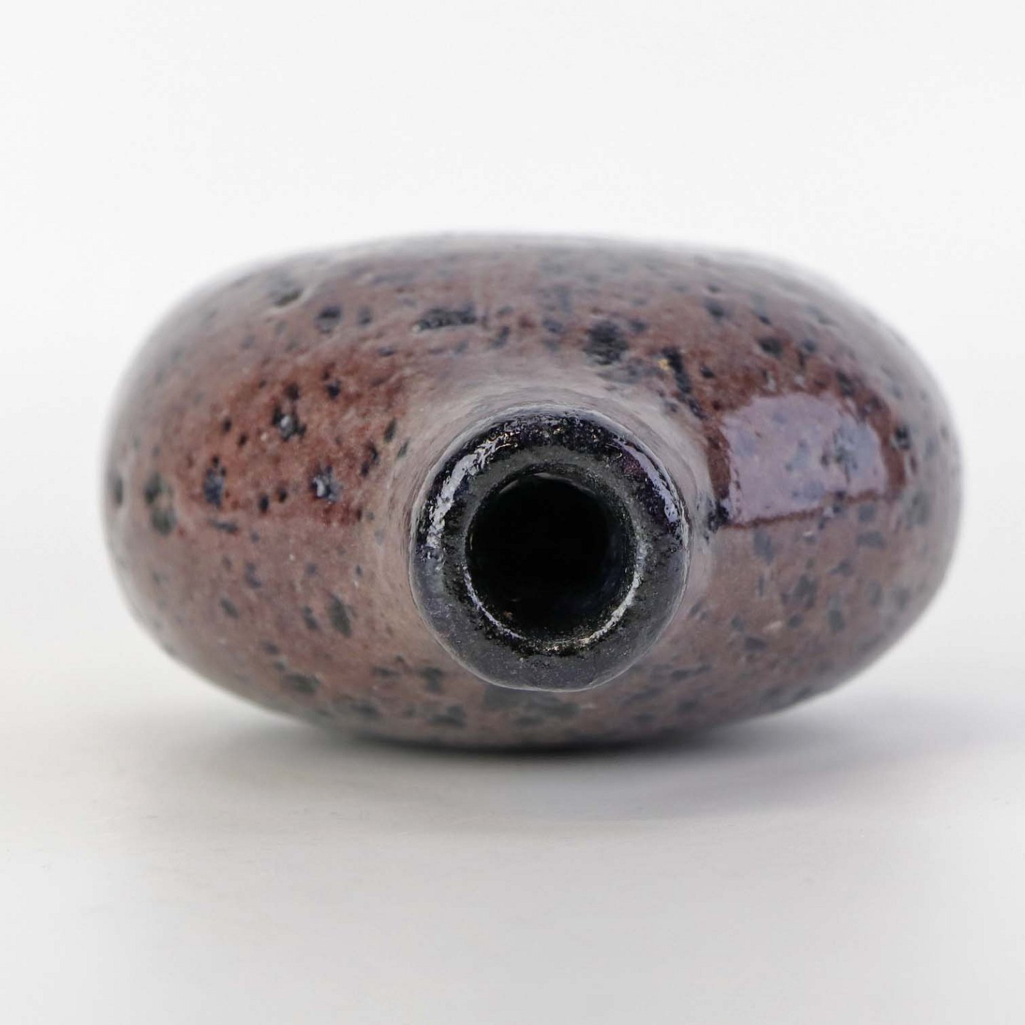 Lille flaskeformet vase i keramik med blommefarvet glasur.