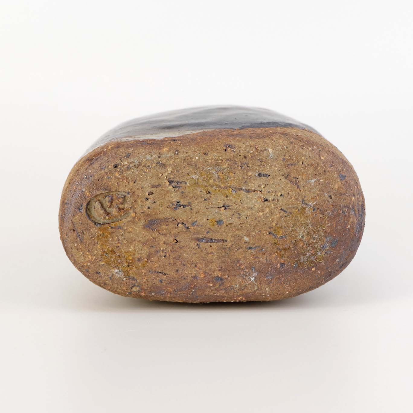 Lille flaskeformet vase i keramik med flerfarvet glansfuld og mat glasur.