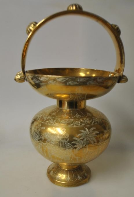 Stor indisk messing vase med hank, ca. 1950. Med indgraverede dekorationer af jagtselskab på elefanter på tiger jagt. På siden ses 4 tigre. Desuden indgraverede blomstermotiver. 32 cm. H.: 21 cm.