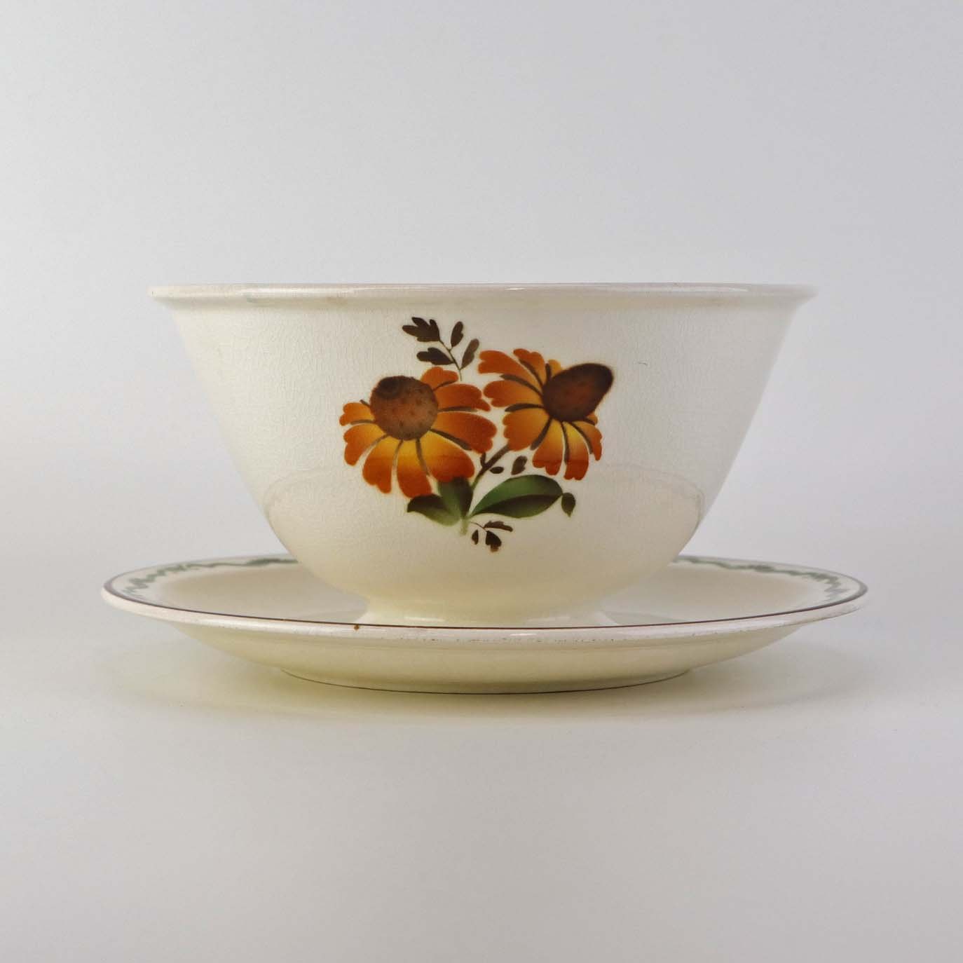 Fajancestel i stelform G med dekoration af orangegule blomster og grønne guirlander på lys baggrund med brun kant.