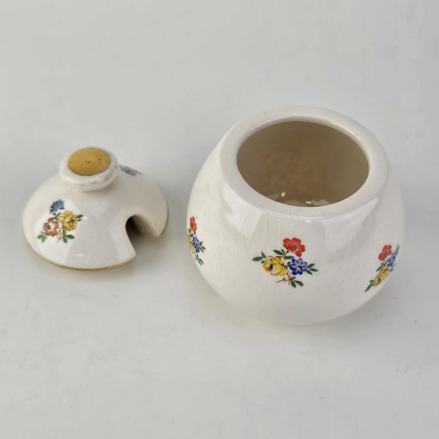 Trekantet fad med sennepskrukke, saltbøsse og peberbøsse i fajance fra stellet Anna Sofie