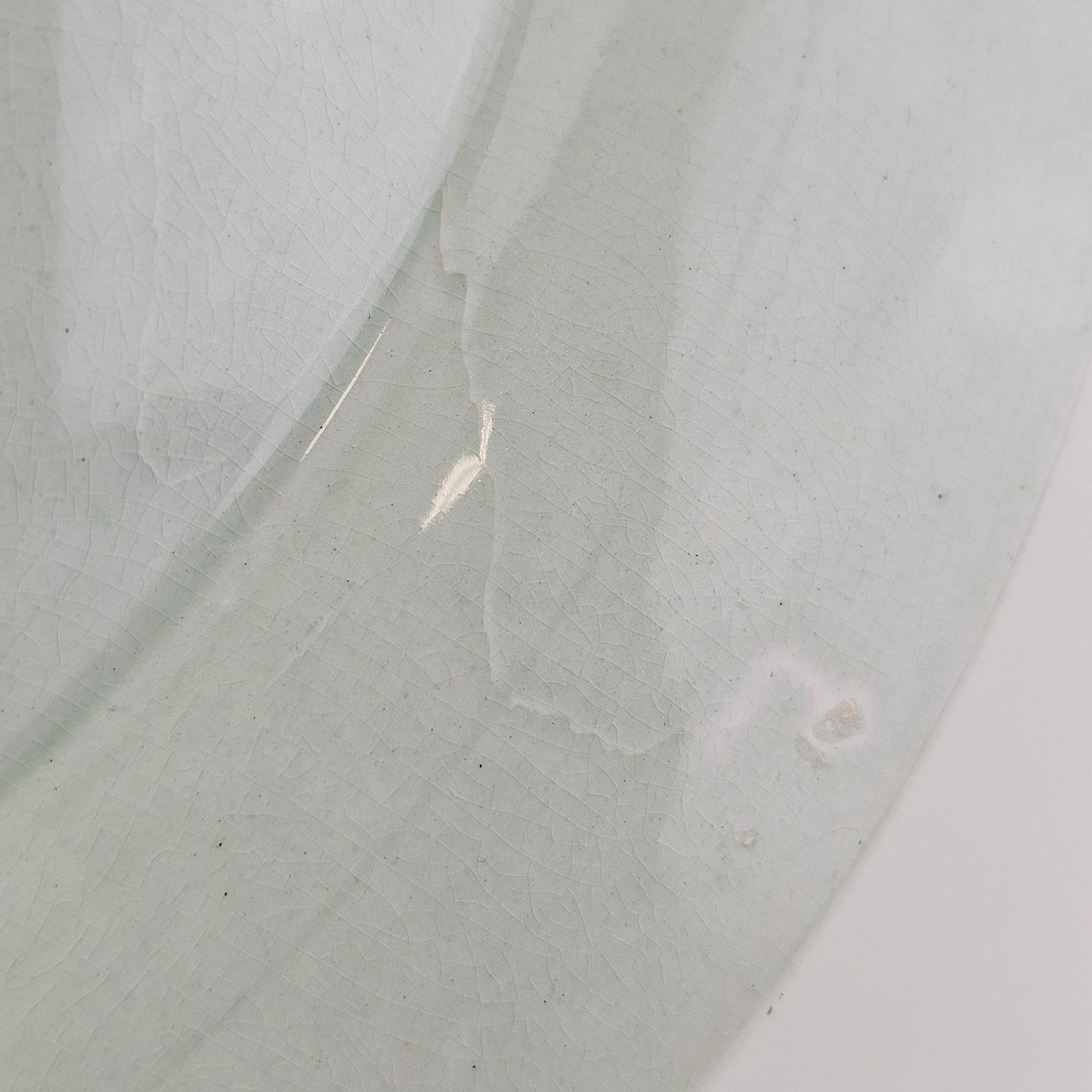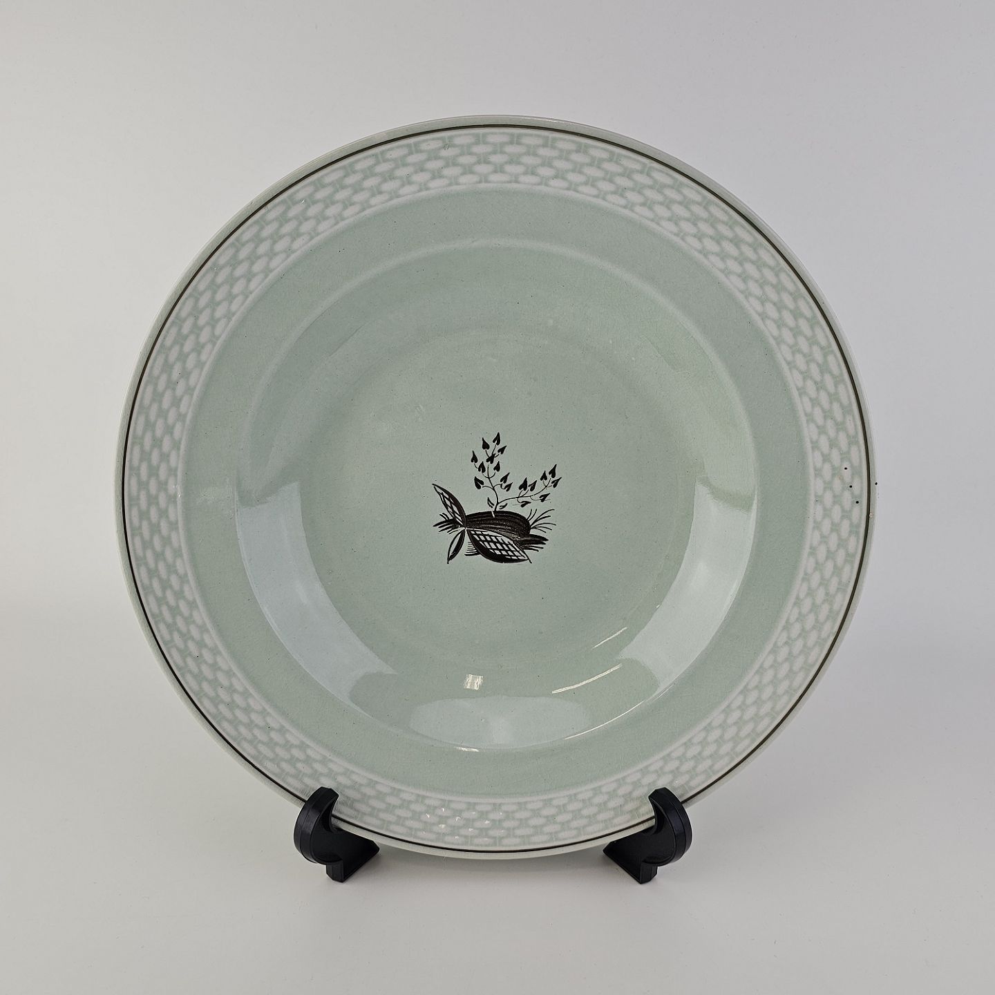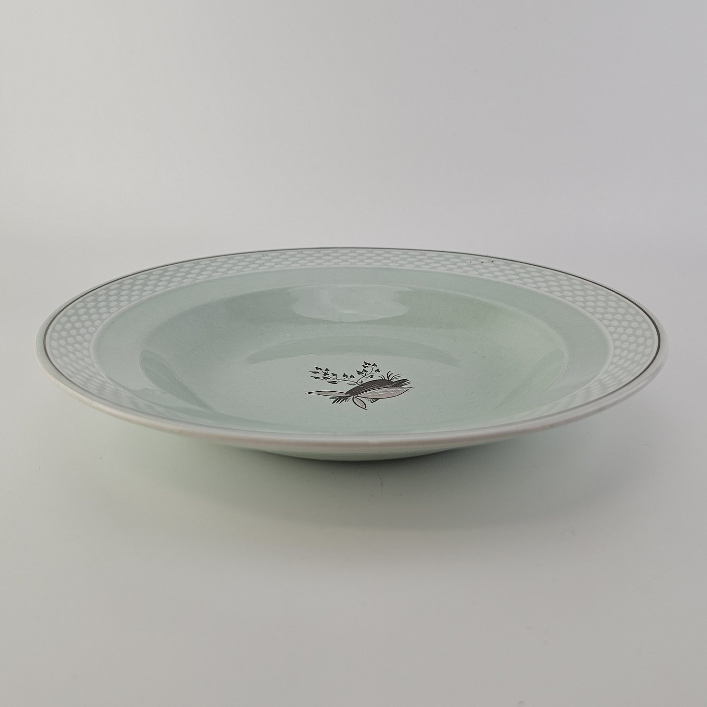 Stel i lysegrøn fajance med natur dekoration og flettet kant