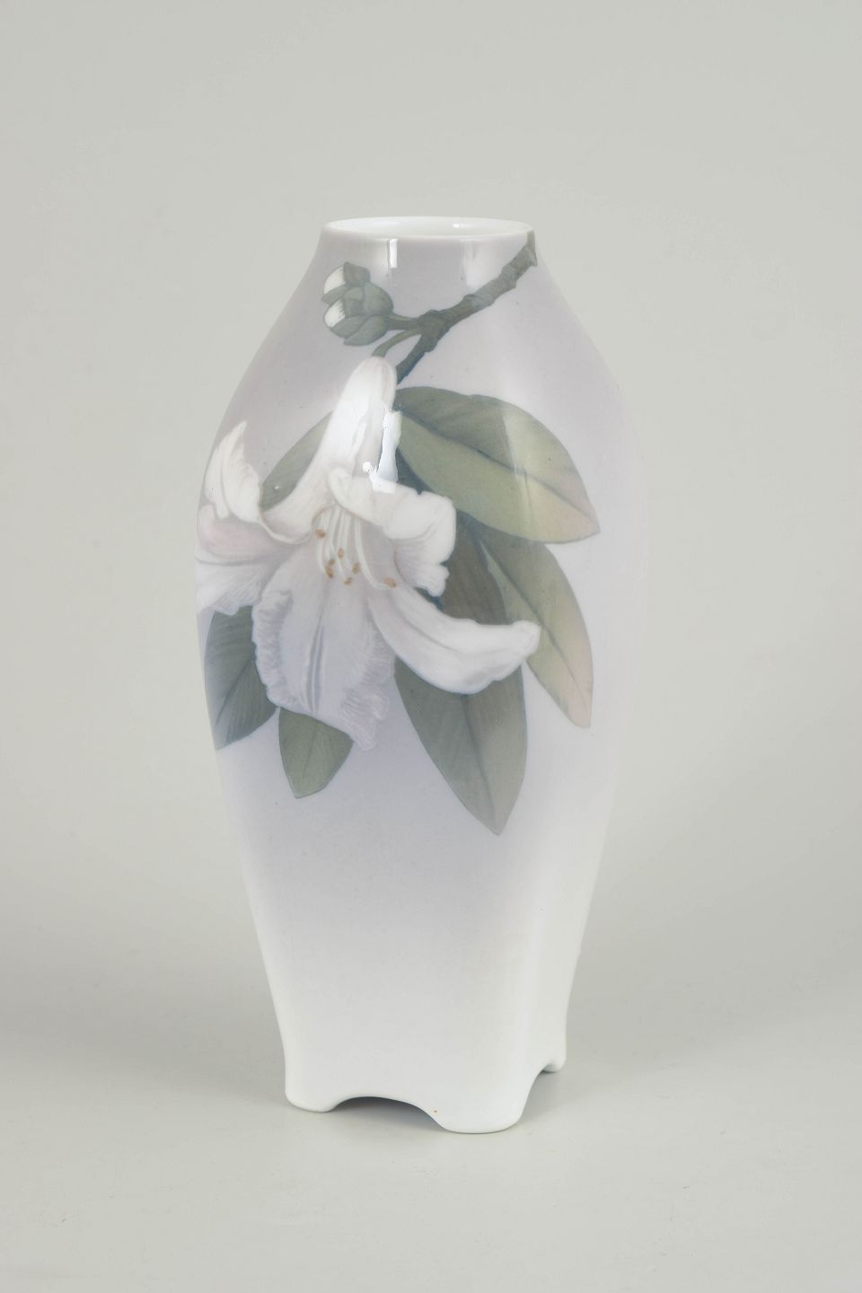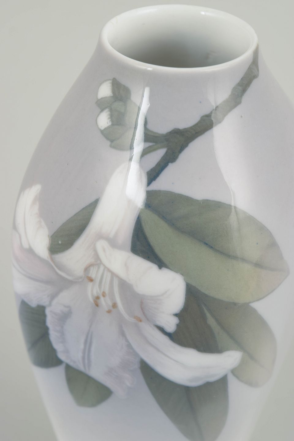 Vase i glaseret porcelæn med håndmalet underglasurdekoration i Art Nouveau-stil med blomstrende grene og blade i bløde, afdæmpede nuancer over en let tonet bund. Model 846/240.