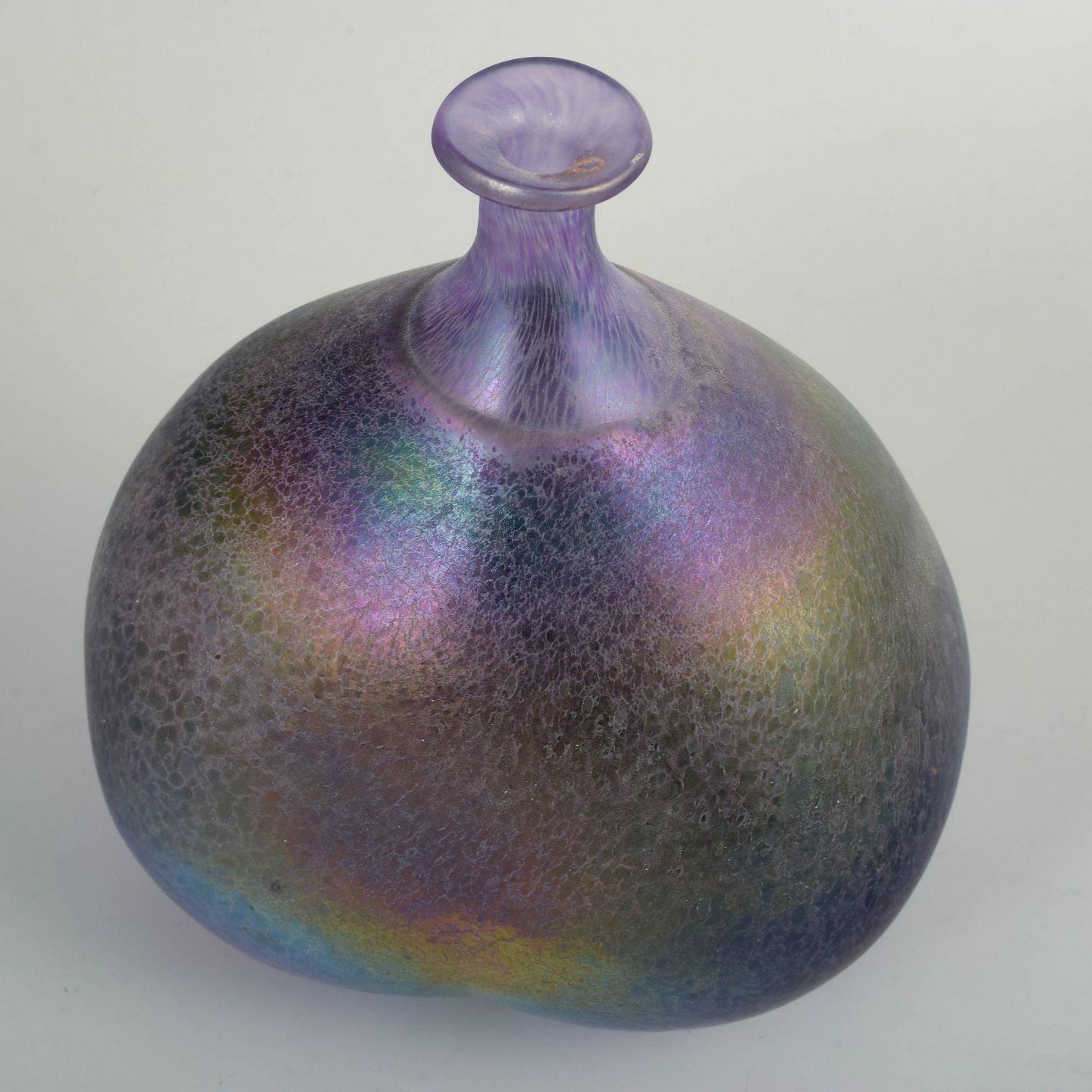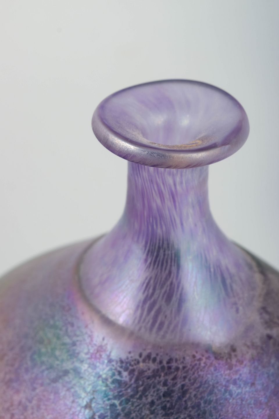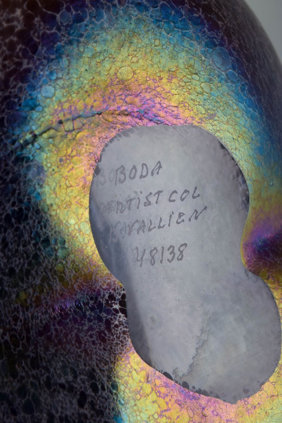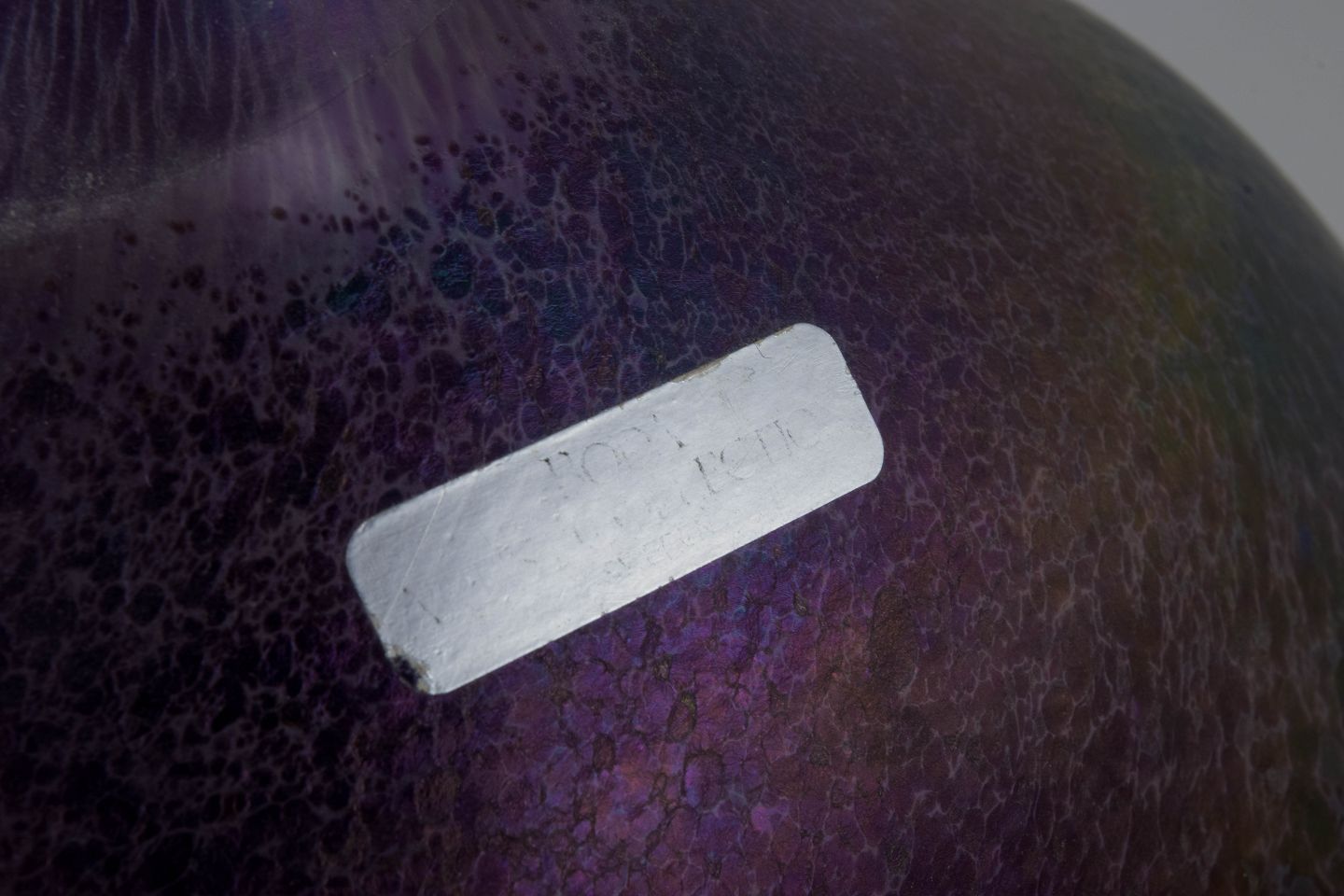 Skulpturel, balusterformet kunstglasvase udført i mundblæst glas med karakteristisk iriserende overflade i violette, blå og grønne nuancer. Overfladen har en levende, let krakeleret struktur, som giver dybde og farvespil. Modellen er udført efter Kosta Bodas model 48138 og er typisk for Bertil Valliens eksperimenterende formsprog i 1980’erne.