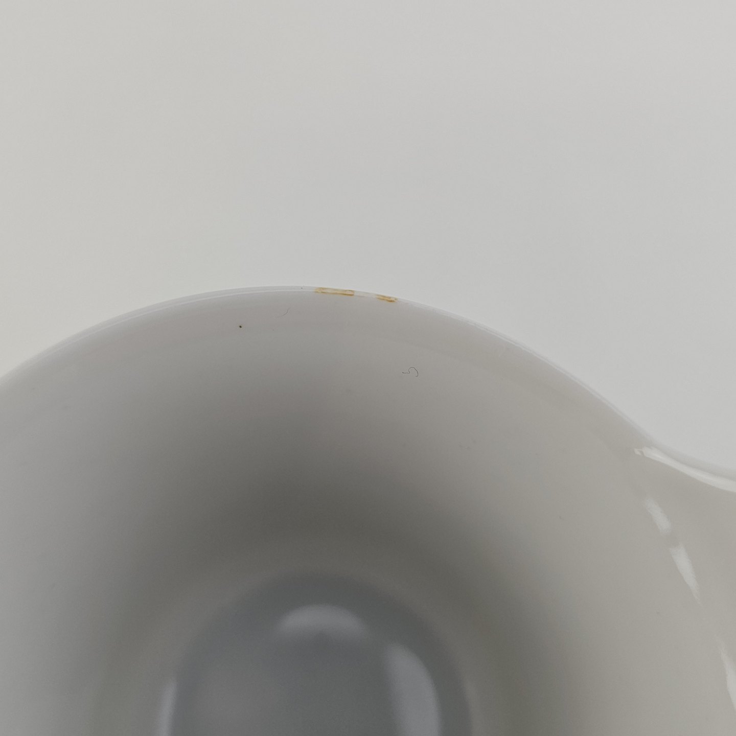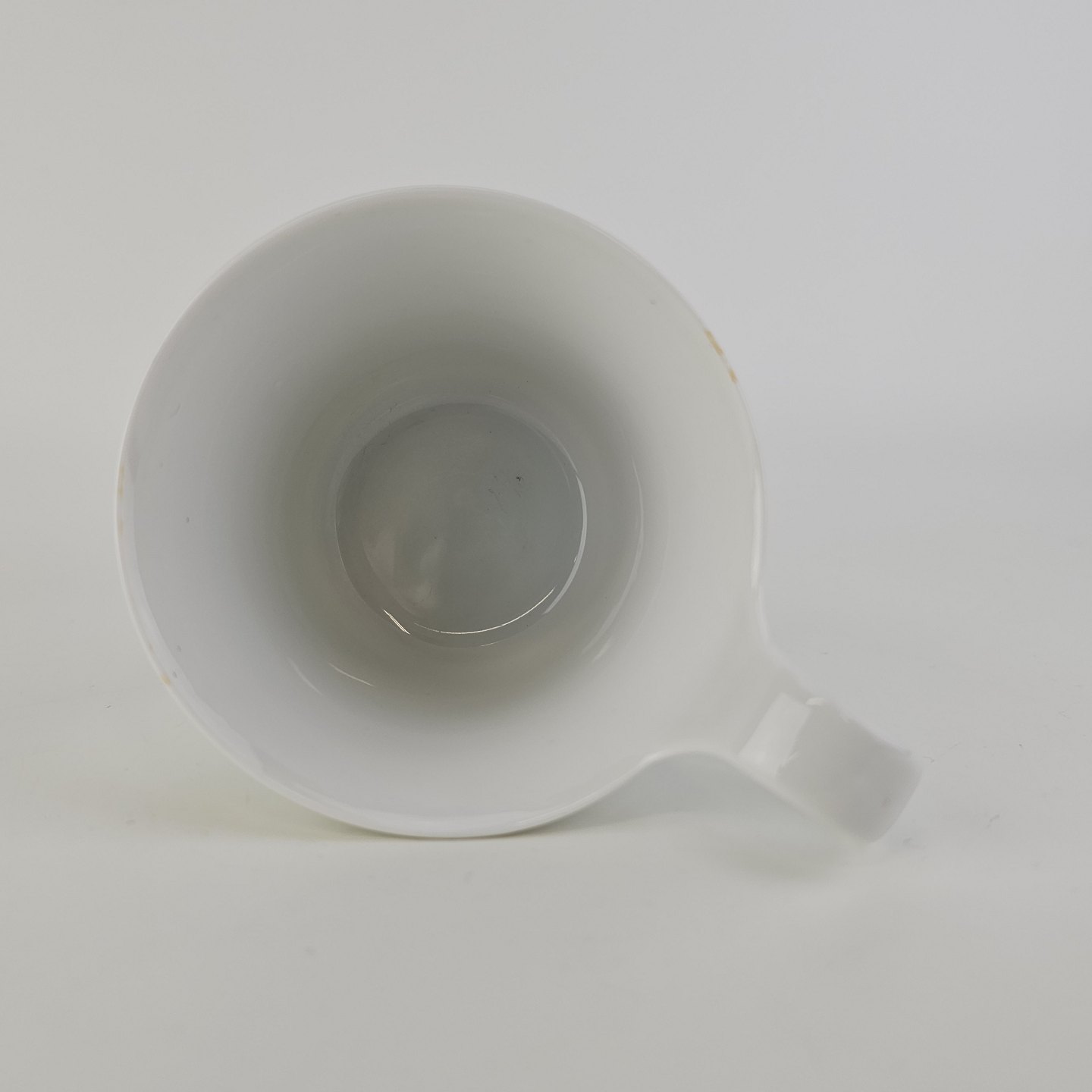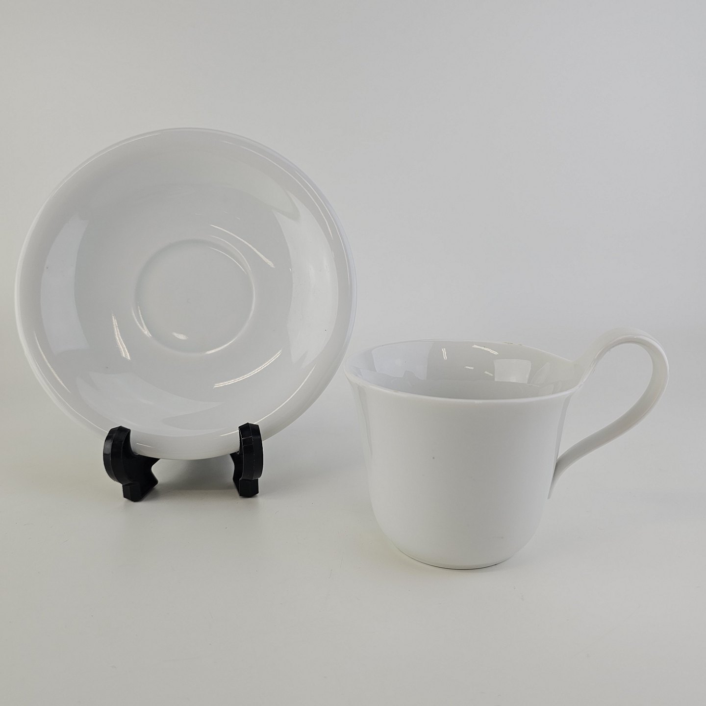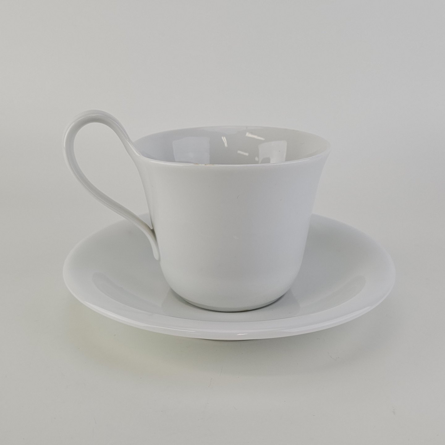 Kop med høj hank og underkop i glat hvidt porcelæn
