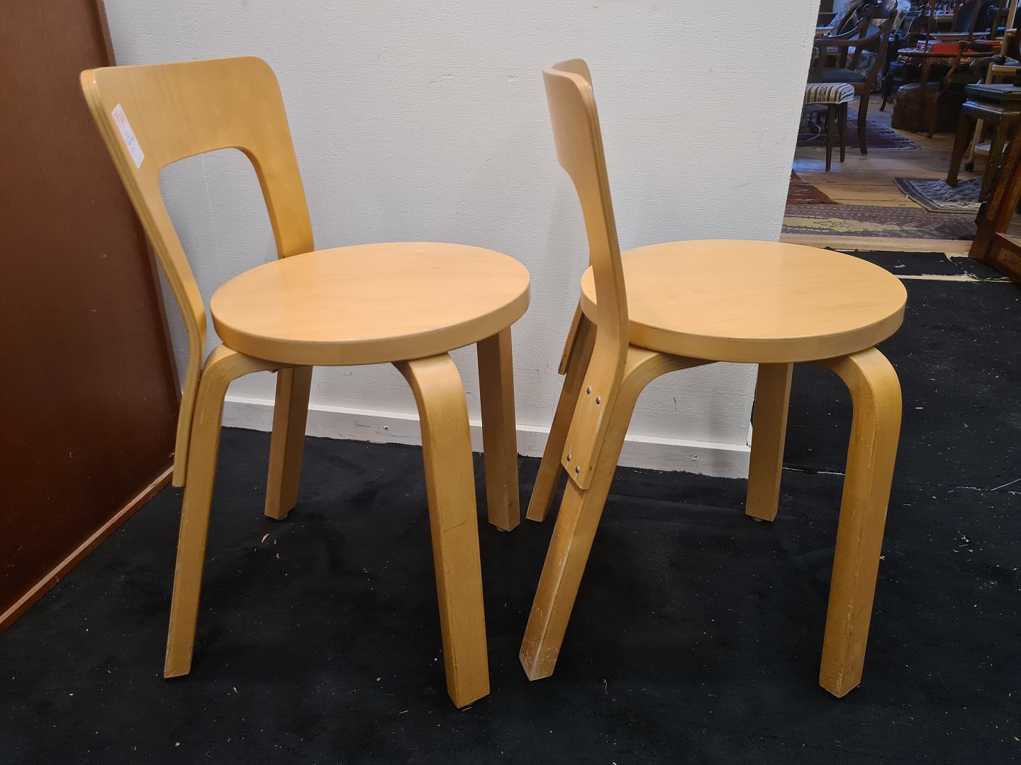 Par Alvar Aalto stole model 65 i bøg. Fremstår pæne og stabile uden de store brugsspor.