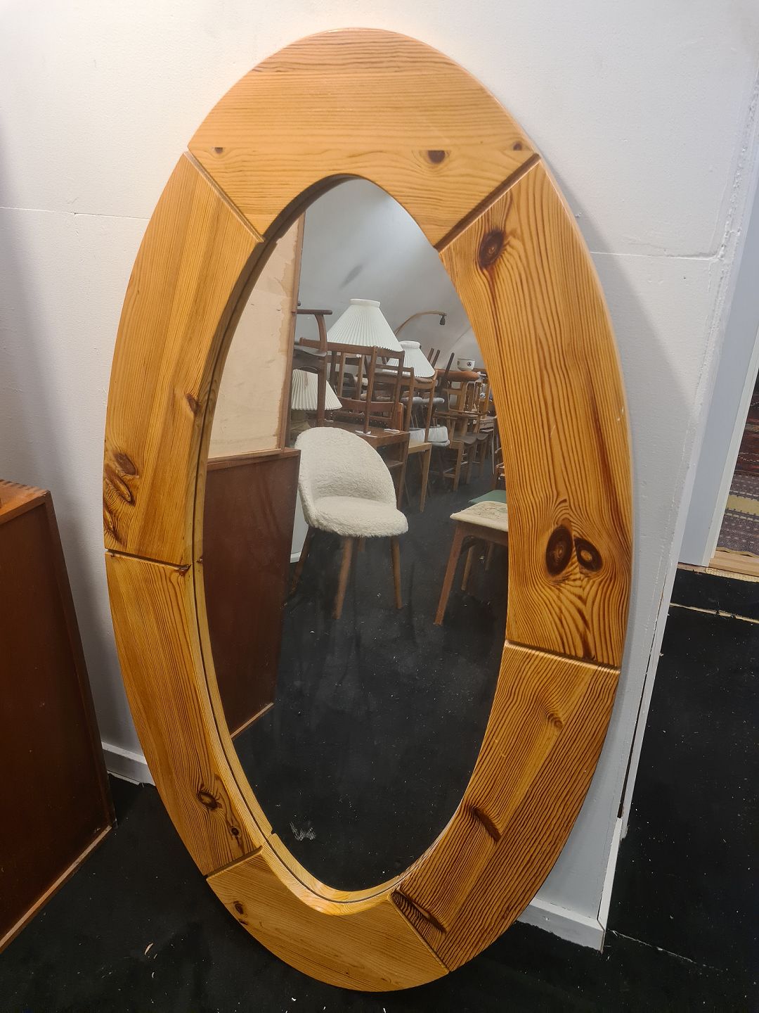 Svensk designet ovalt spejl i massiv fyr. Fremstillet i 1980'erne. Fremstår pænt og velholdt uden nævneværdige brugsspor.