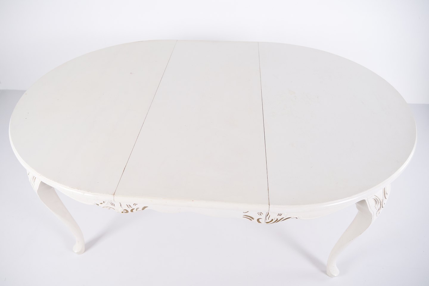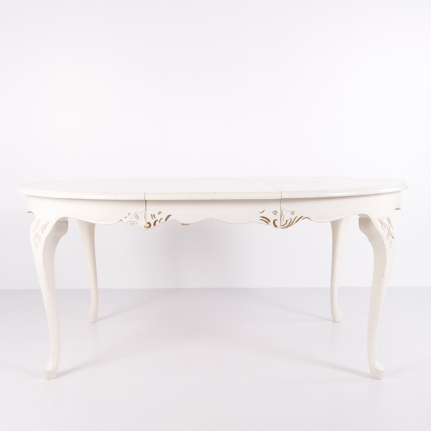 Antik rundt spisebord i ny rokoko stil fra 1920’erne. Hvidmalet med dekorative detaljer og 4 tillægsplader.