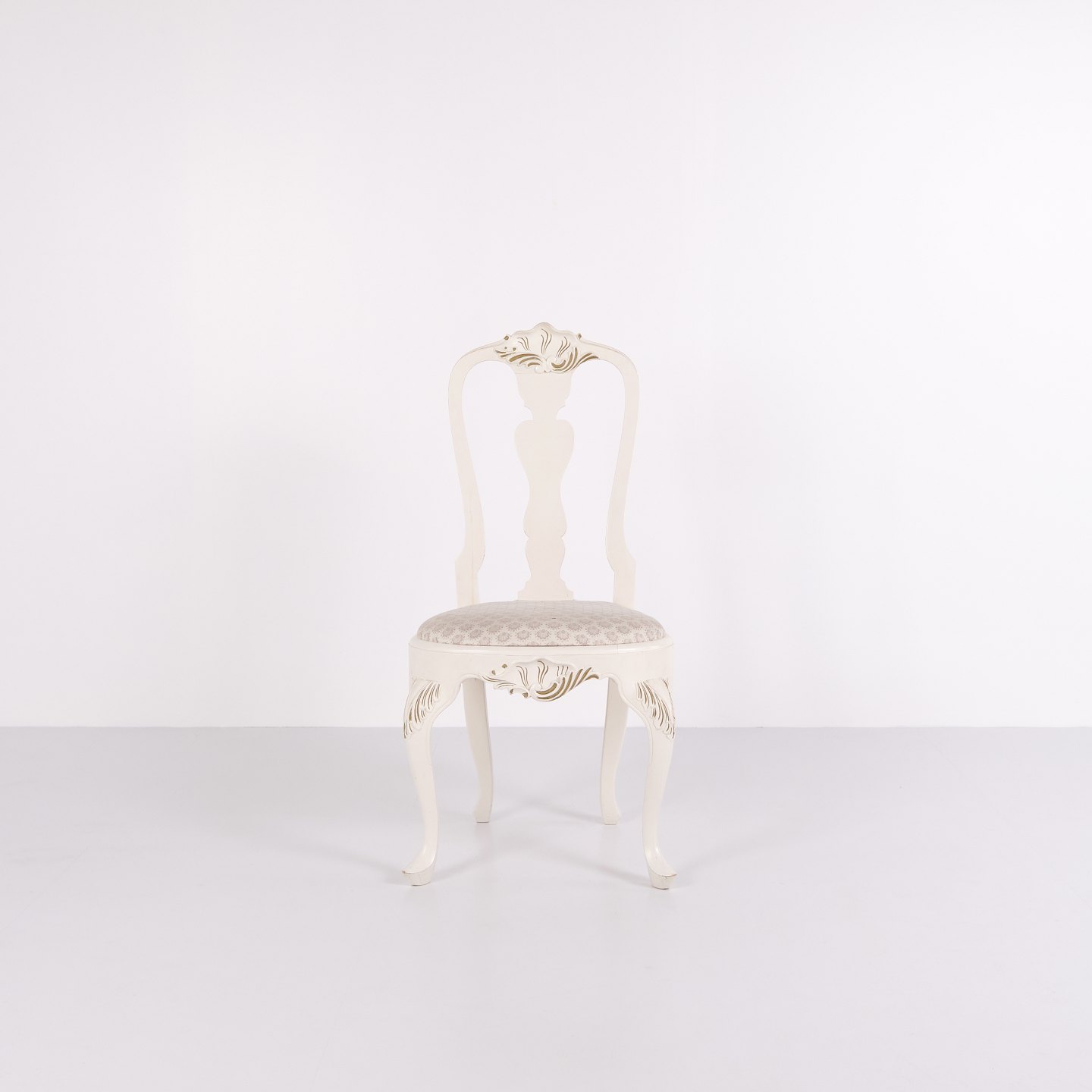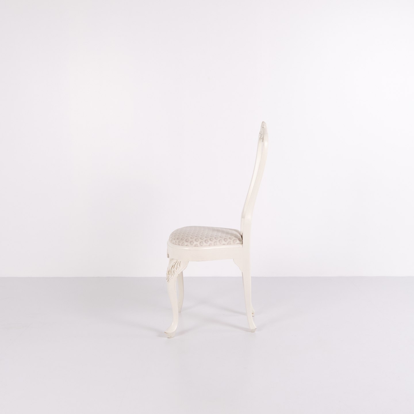 Antikke spisebordsstole i ny rokoko stil fra 1920’erne. Sæt af 6 hvidmalede stole med dekorative detaljer.