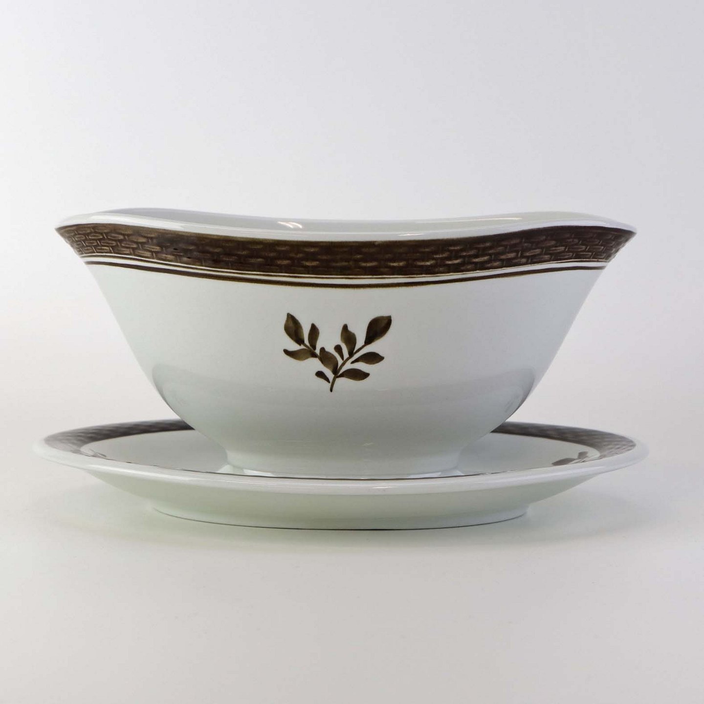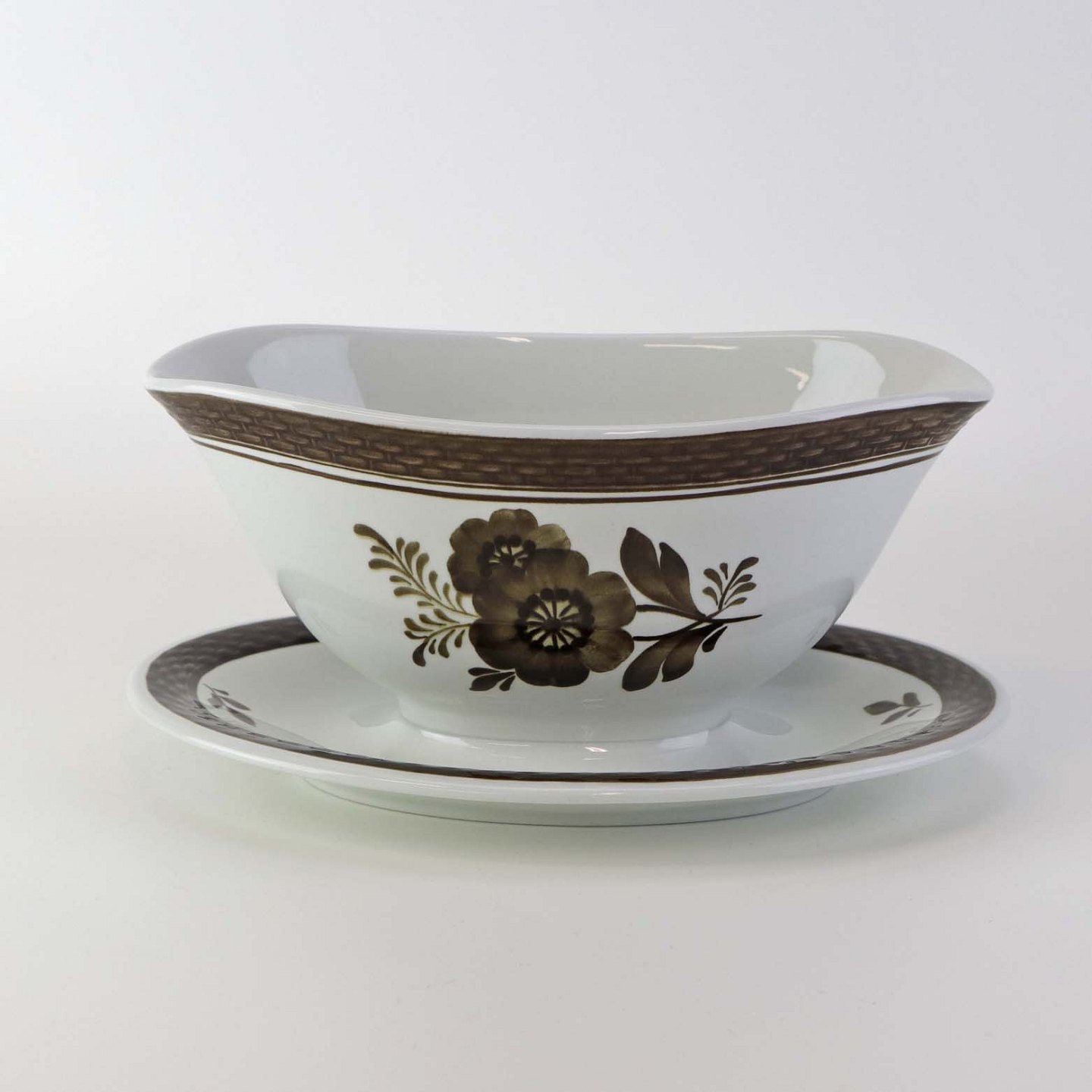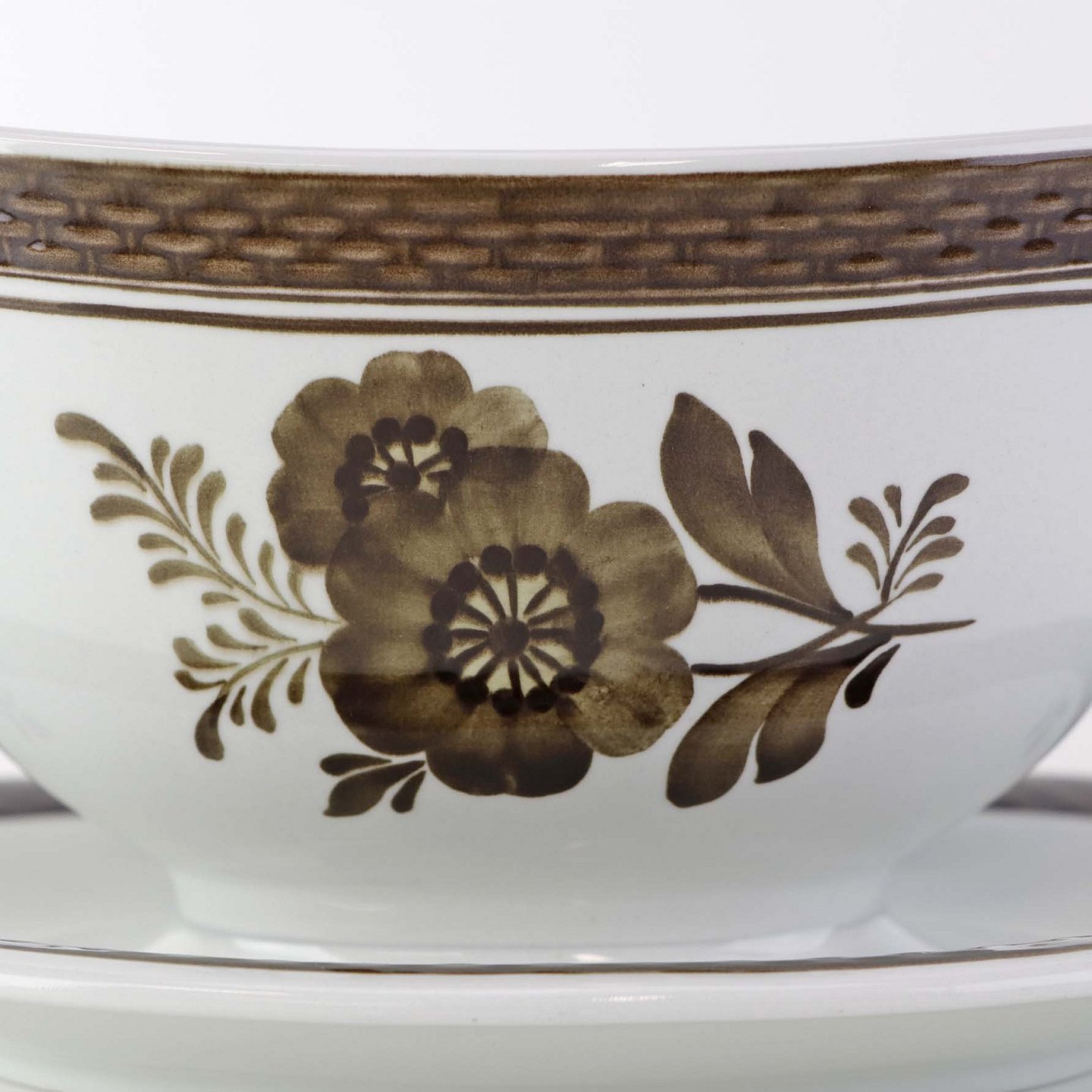 Fajancestellet med flettet kant og dekoration af brune blomster på lys baggrund med brun kant.