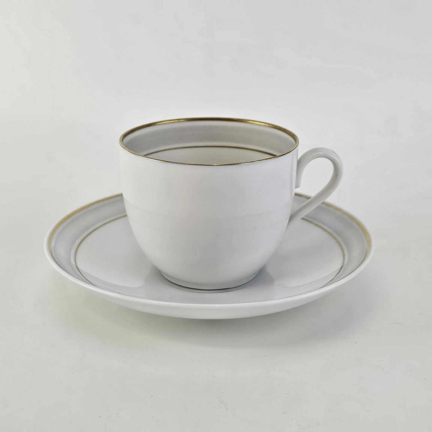 Tiber er stel i glat hvidt porcelæn med grå bort og guldkant