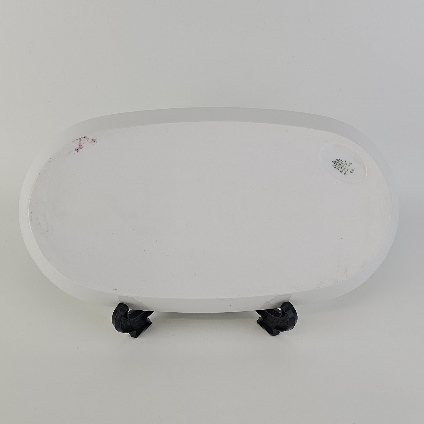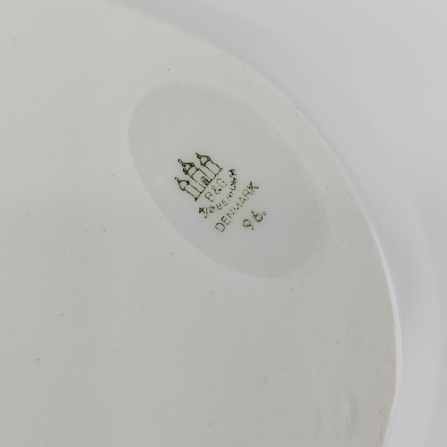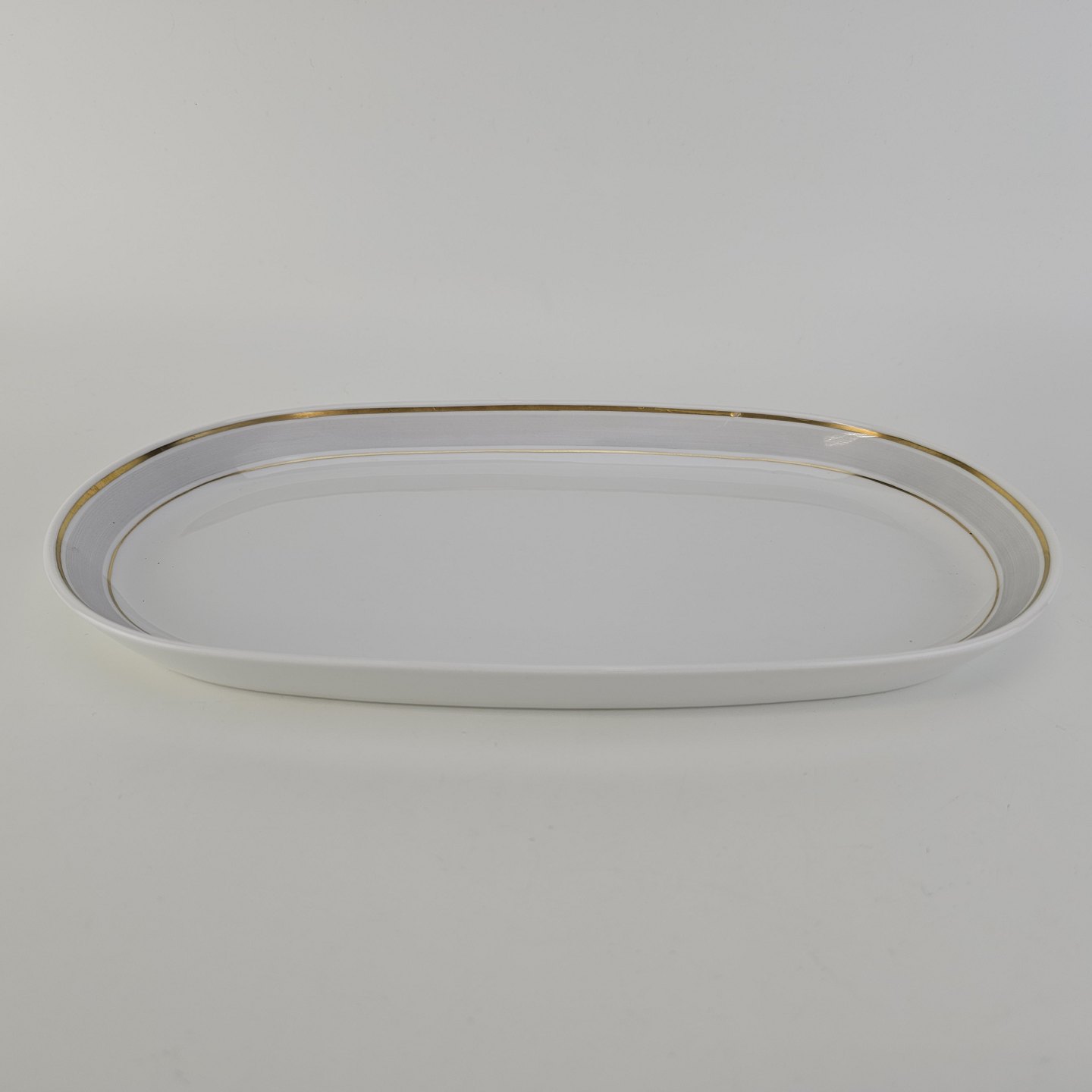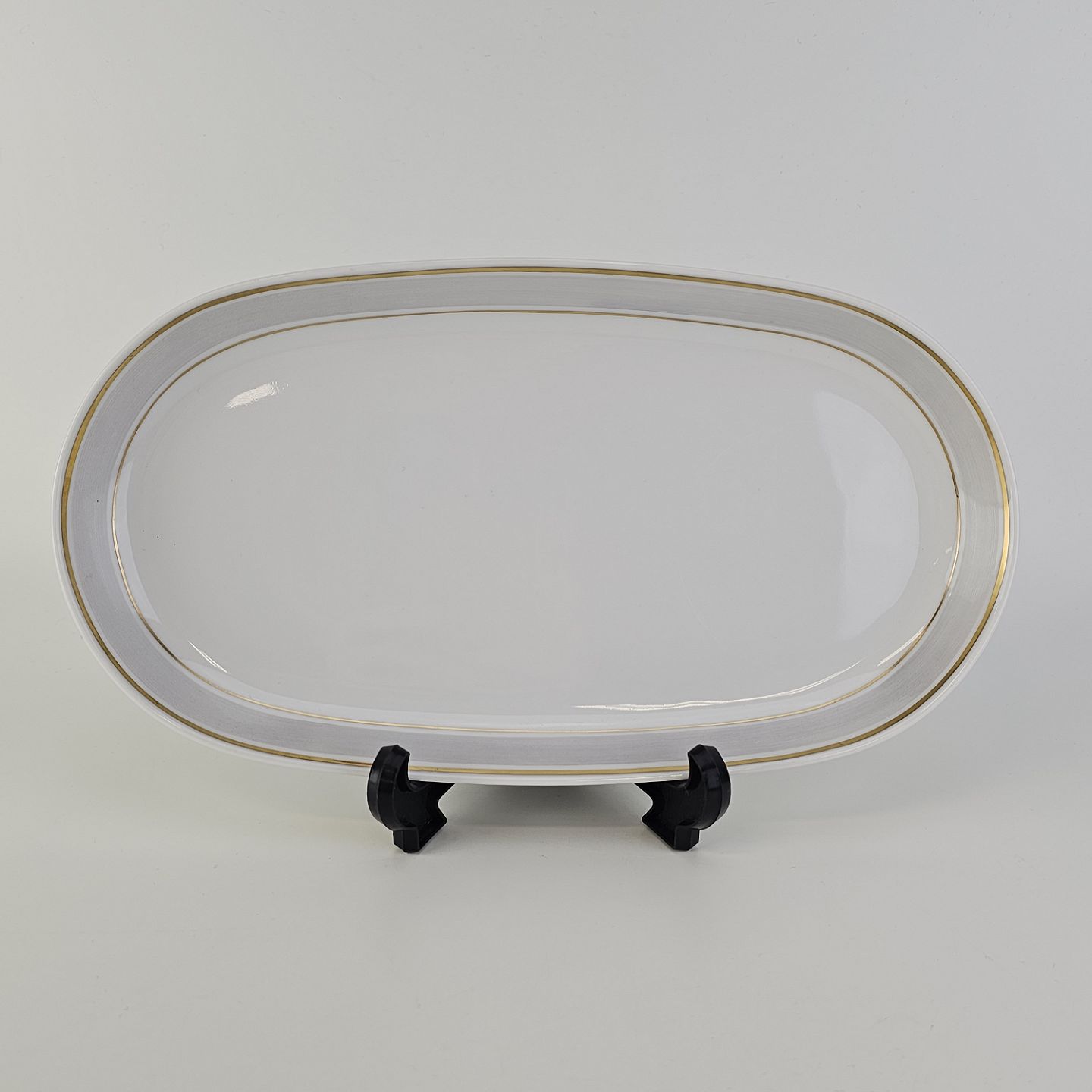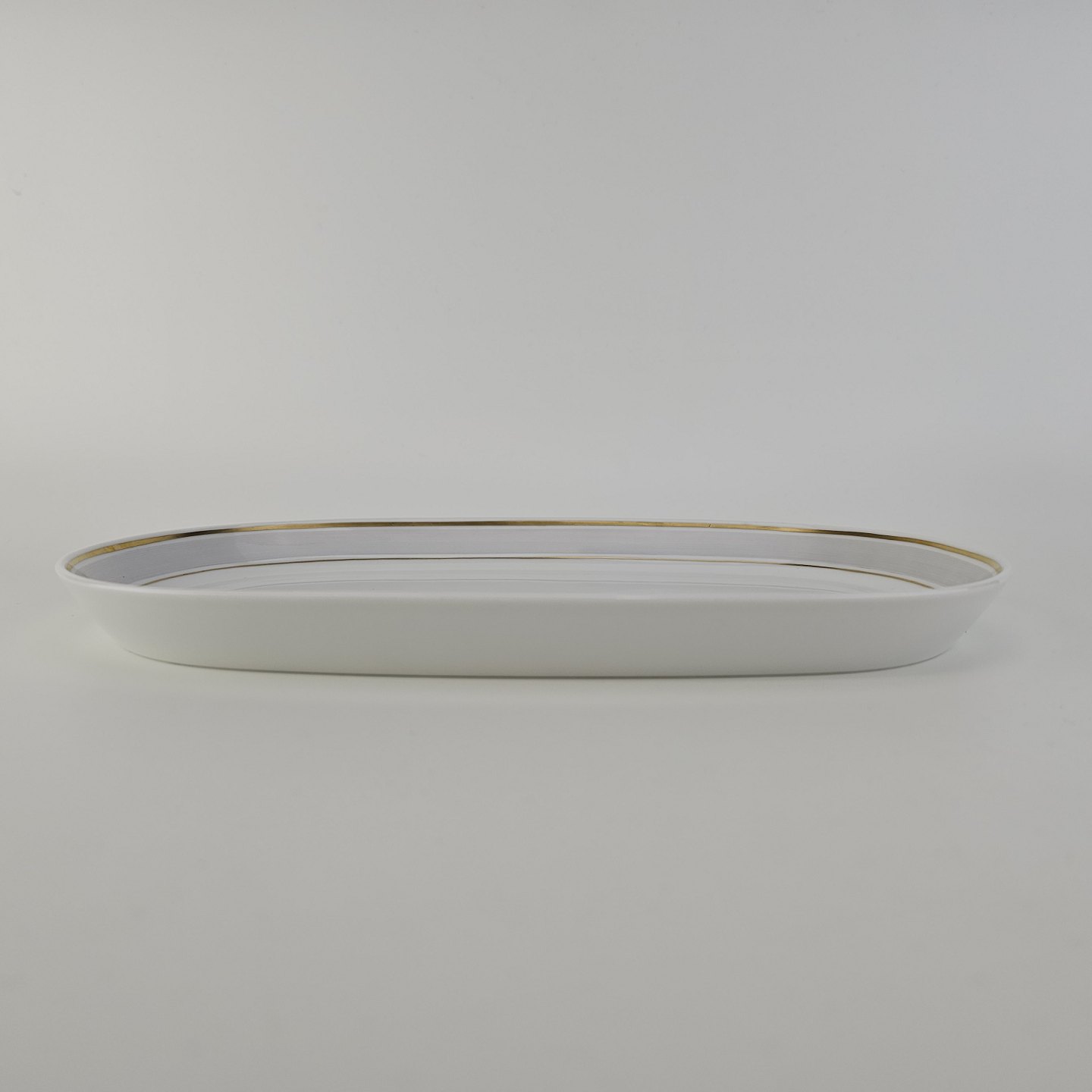 Tiber er stel i glat hvidt porcelæn med grå bort og guldkant