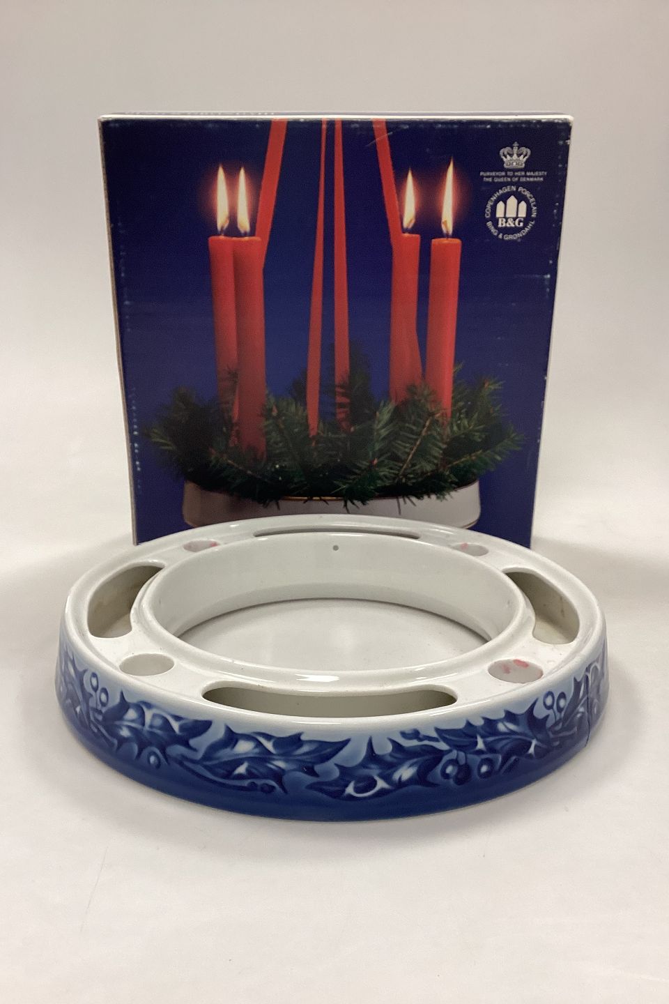 Bing and Grøndahl Advent Wreath / Candle Holder No. 9217. Decorated with Holly in white and blue.
