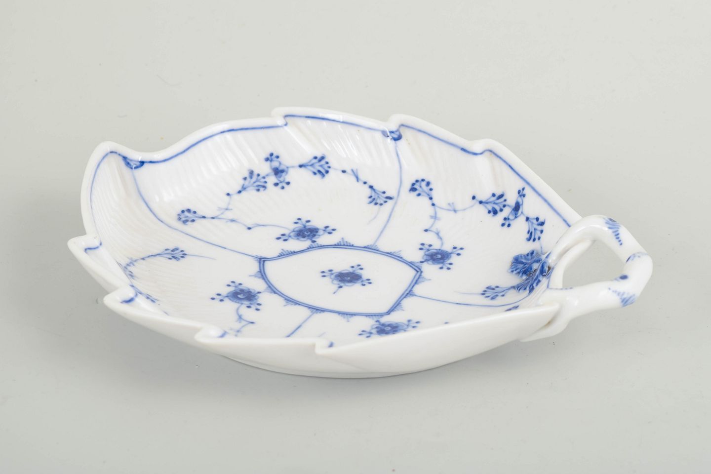 Royal Copenhagen, Musselmalet Riflet bladformet antikt fad med hank.